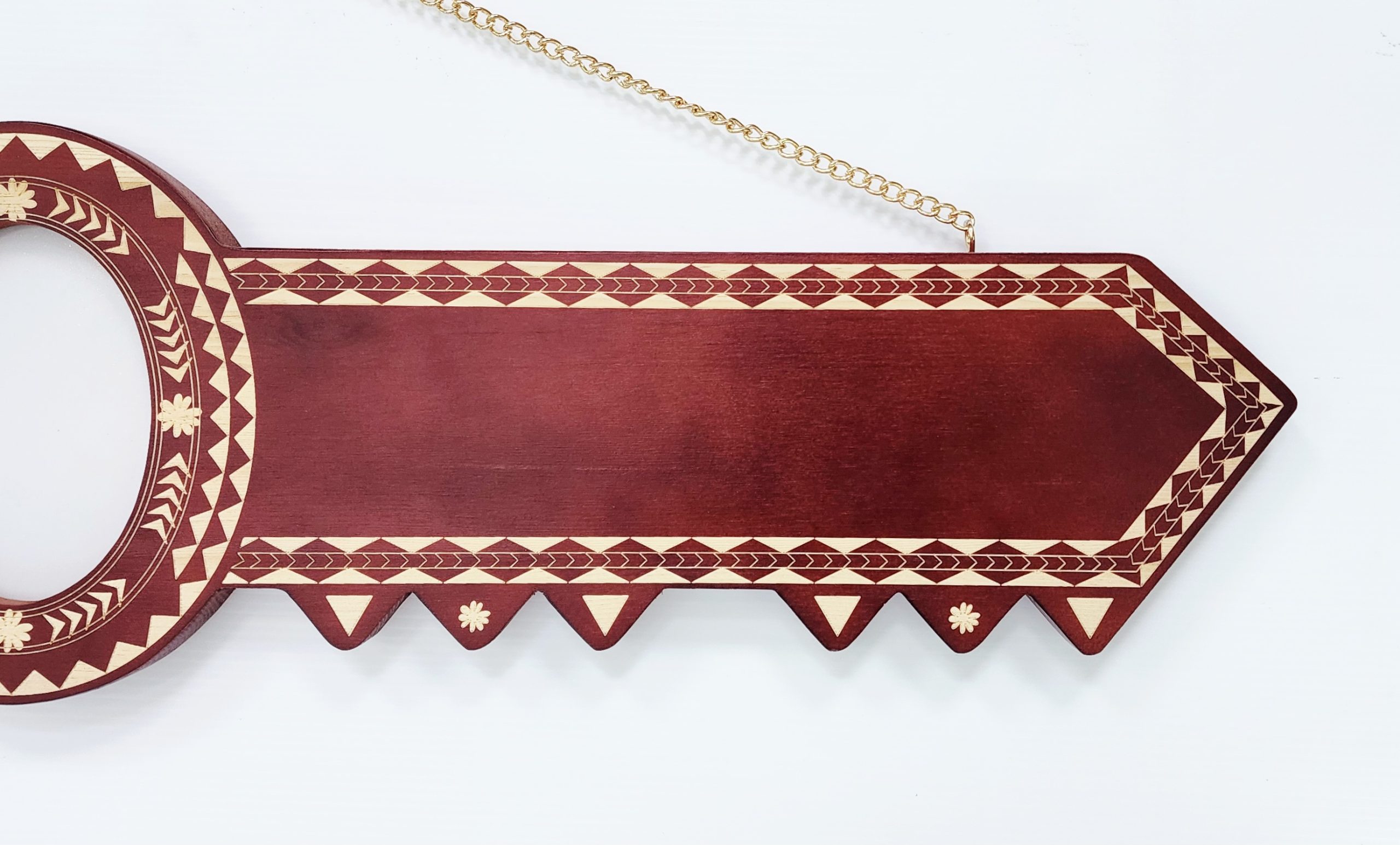 The key comes with a golden colour chain ready to hang on the wall. The brown shade may vary due to the natural wood variations.