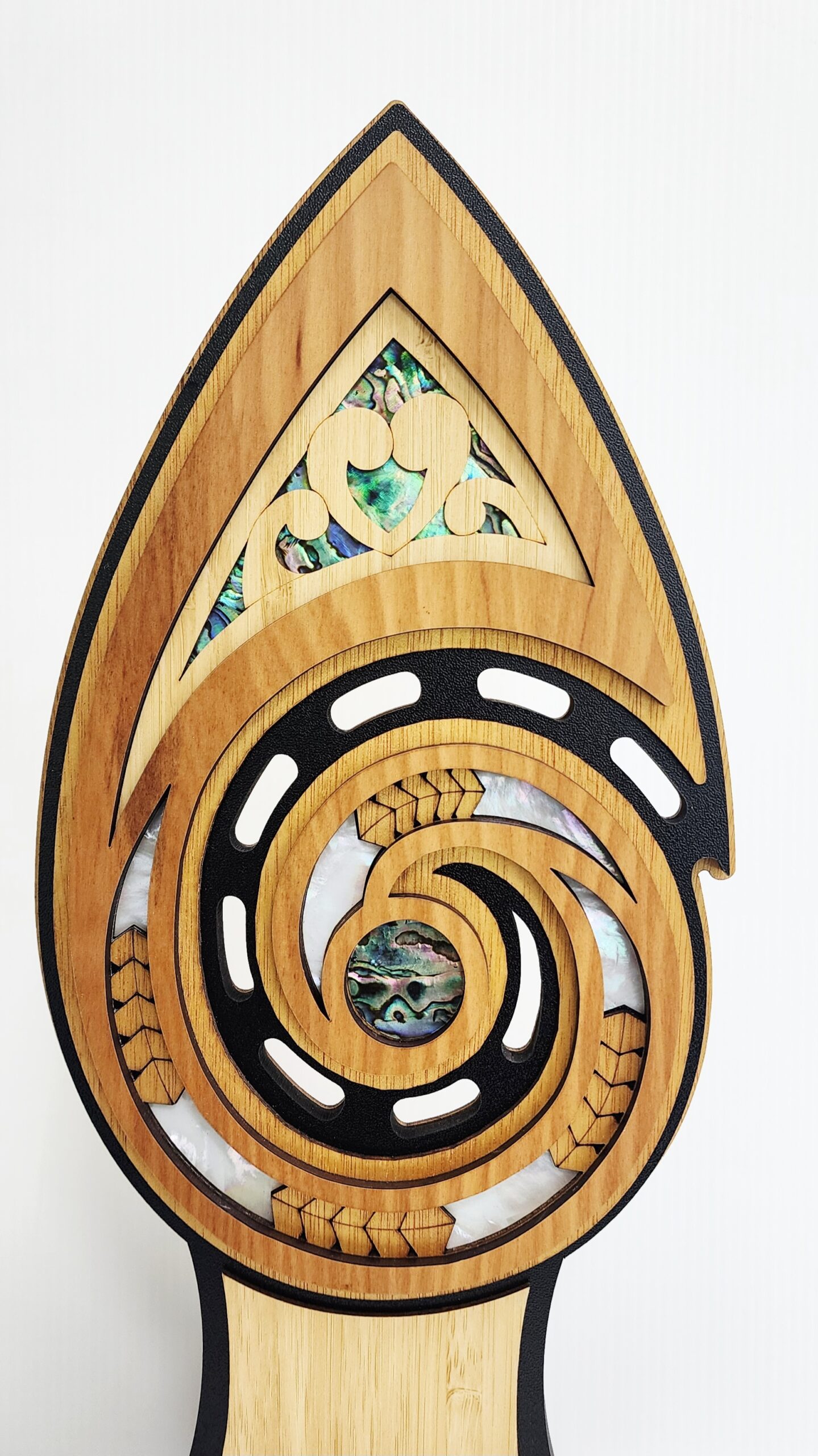 Above, a delicately cut crest reveals a Mother of Pearl and Paua laminate inlay, adding a luminous contrast against the rich golden tones of the Rimu. The interplay between natural wood grain and oceanic shell creates a visual harmony that is both elegant and culturally meaningful.