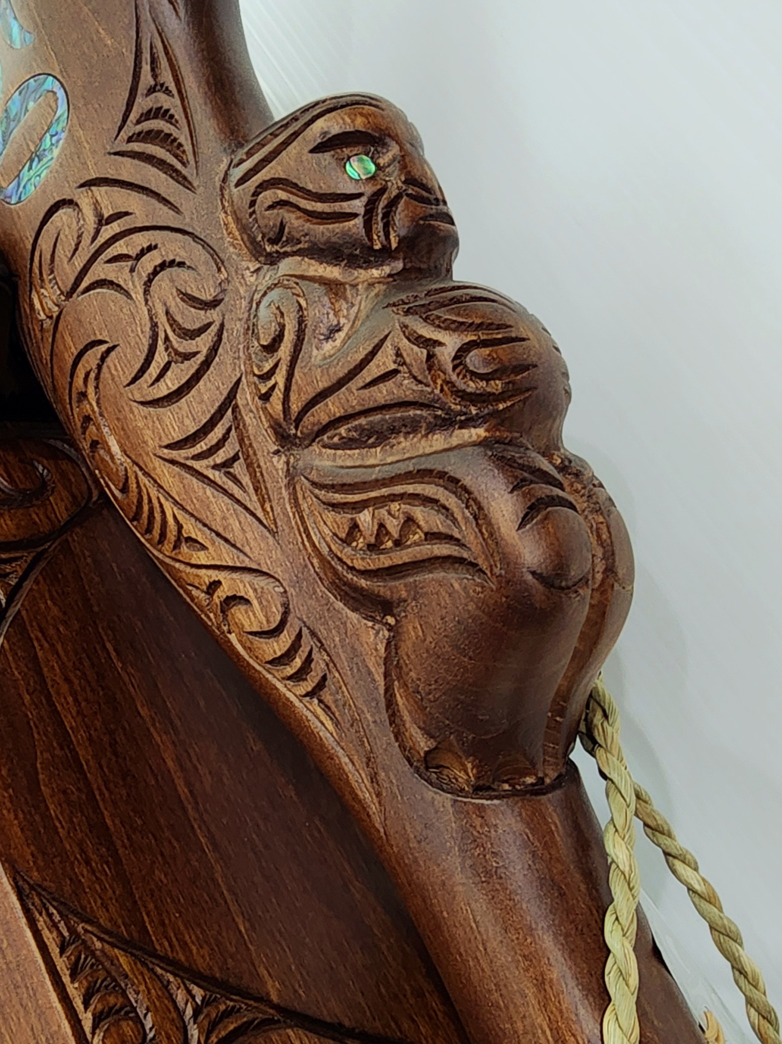 Large Carved Maori Wahaika Club with 50 Paua Inlaid on Stand