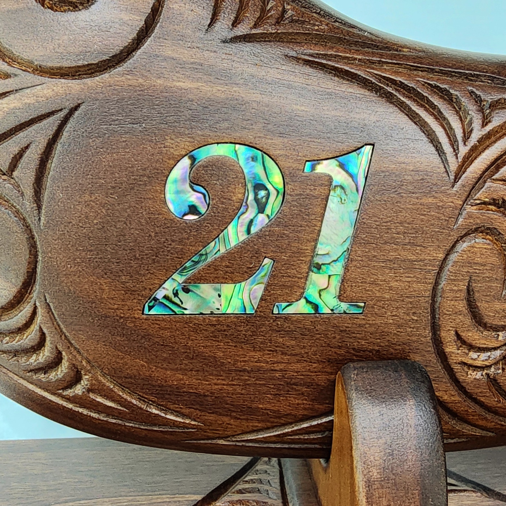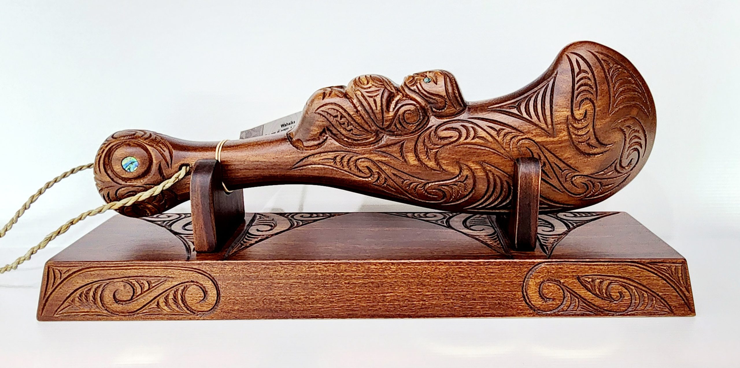 Large Carved Maori Wahaika Club with 21 Paua Inlaid on Stand