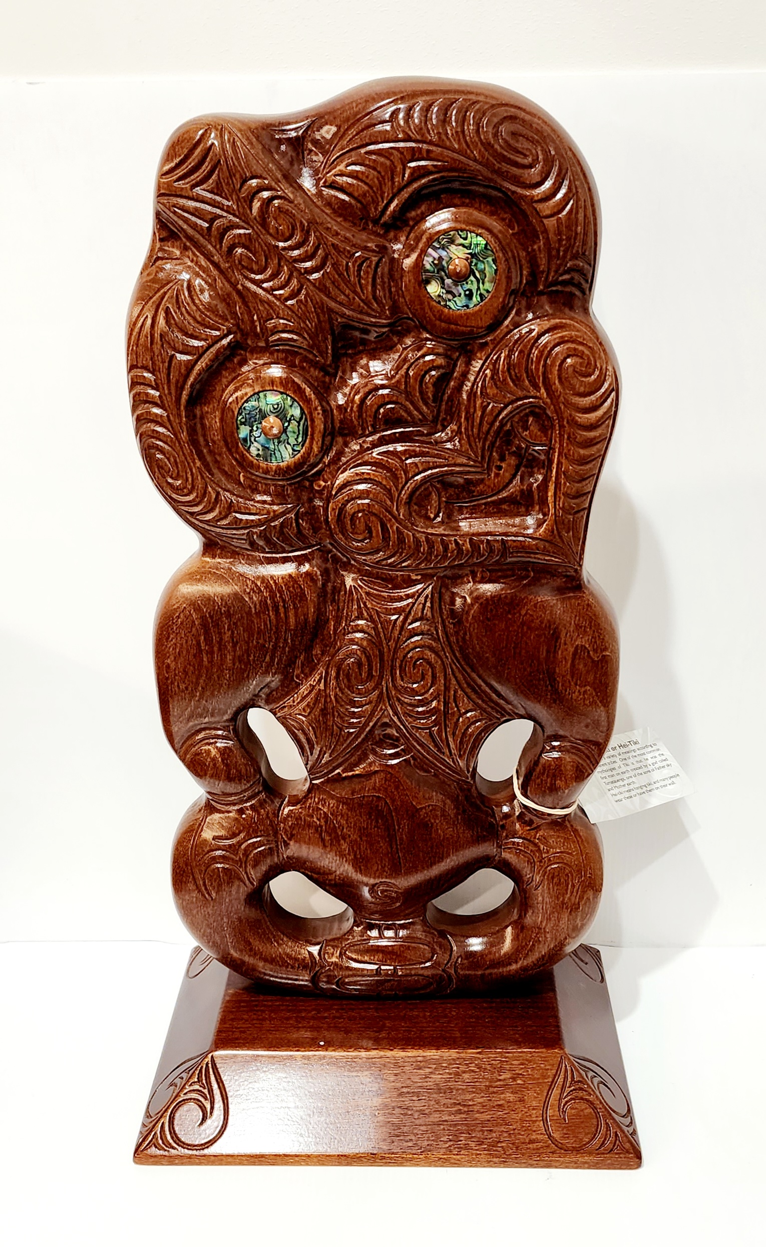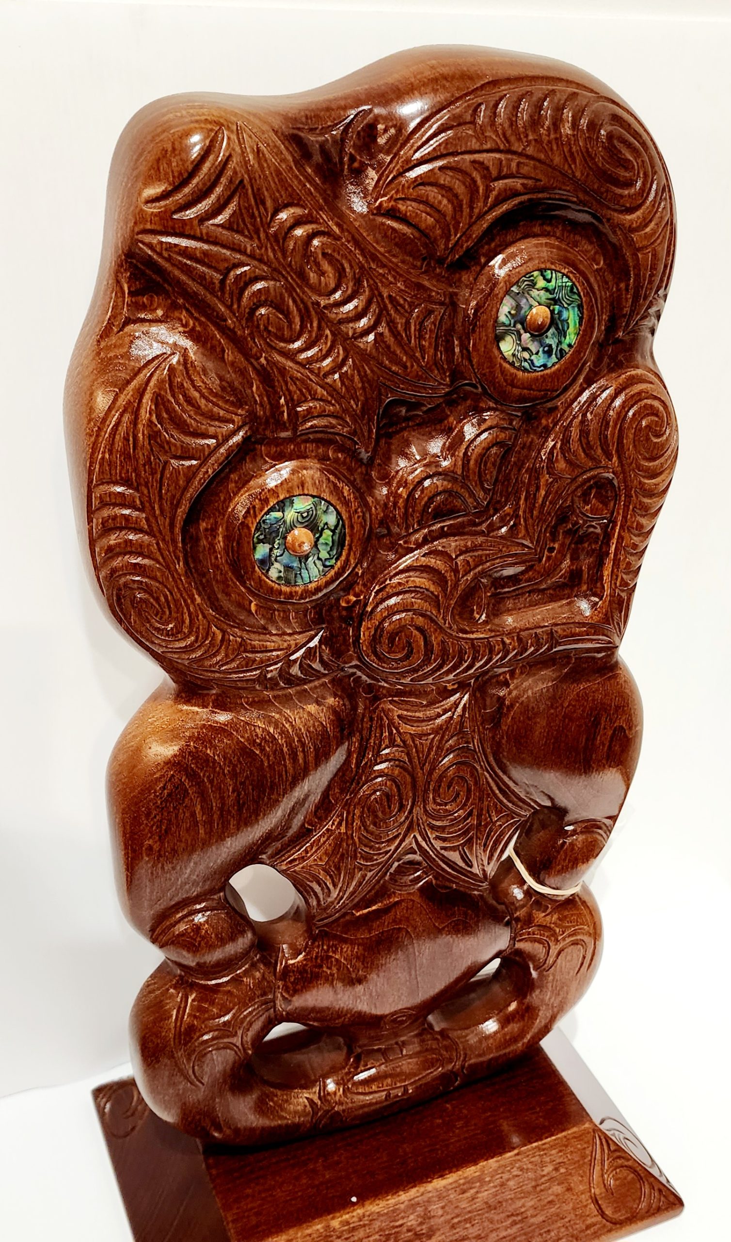 Large Carved Tiki or Hei-Tiki on Base with Paua Shell Eyes Inlay