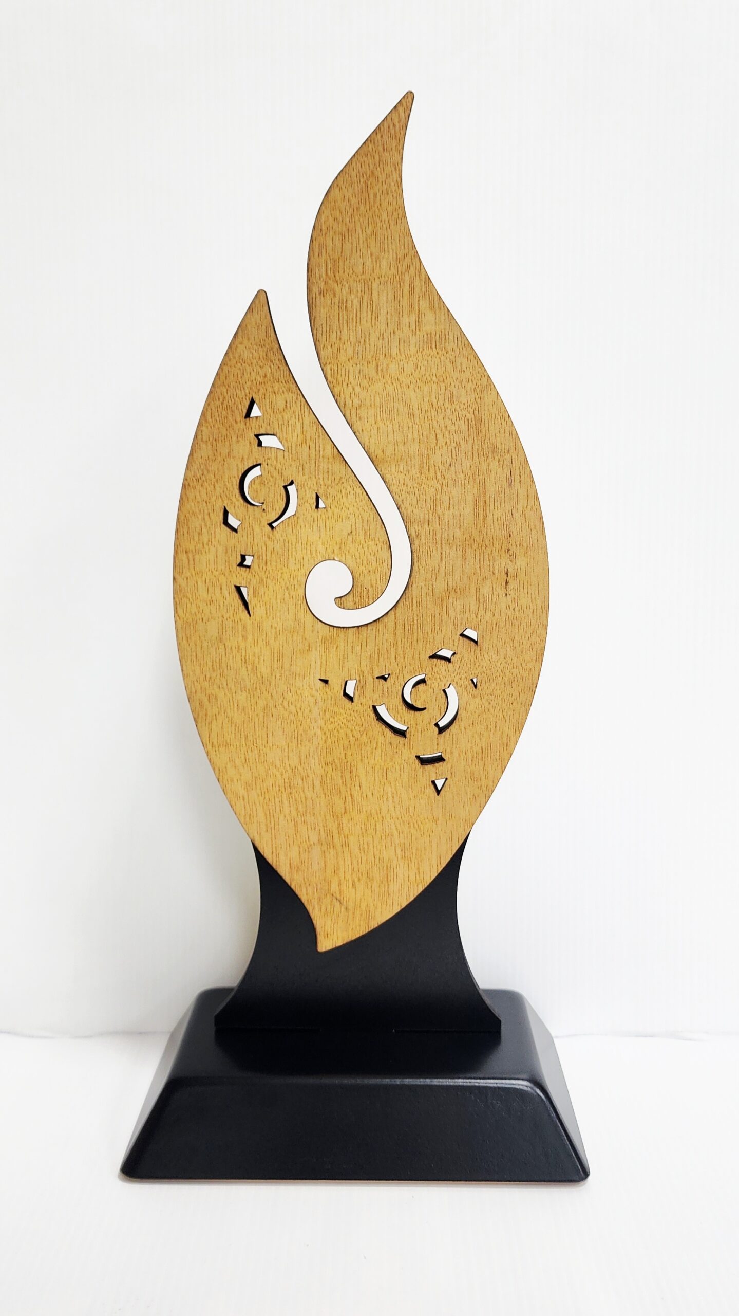 Standing approximately 370mm high, this sculptural piece is meticulously hand-assembled using a combination of New Zealand Rimu veneered MDF and plantation-grown Gaboon timber, creating a beautiful contrast between natural warmth and bold modern structure. The flowing silhouette of the flame rises elegantly, representing progress, ambition, and the pursuit of excellence.