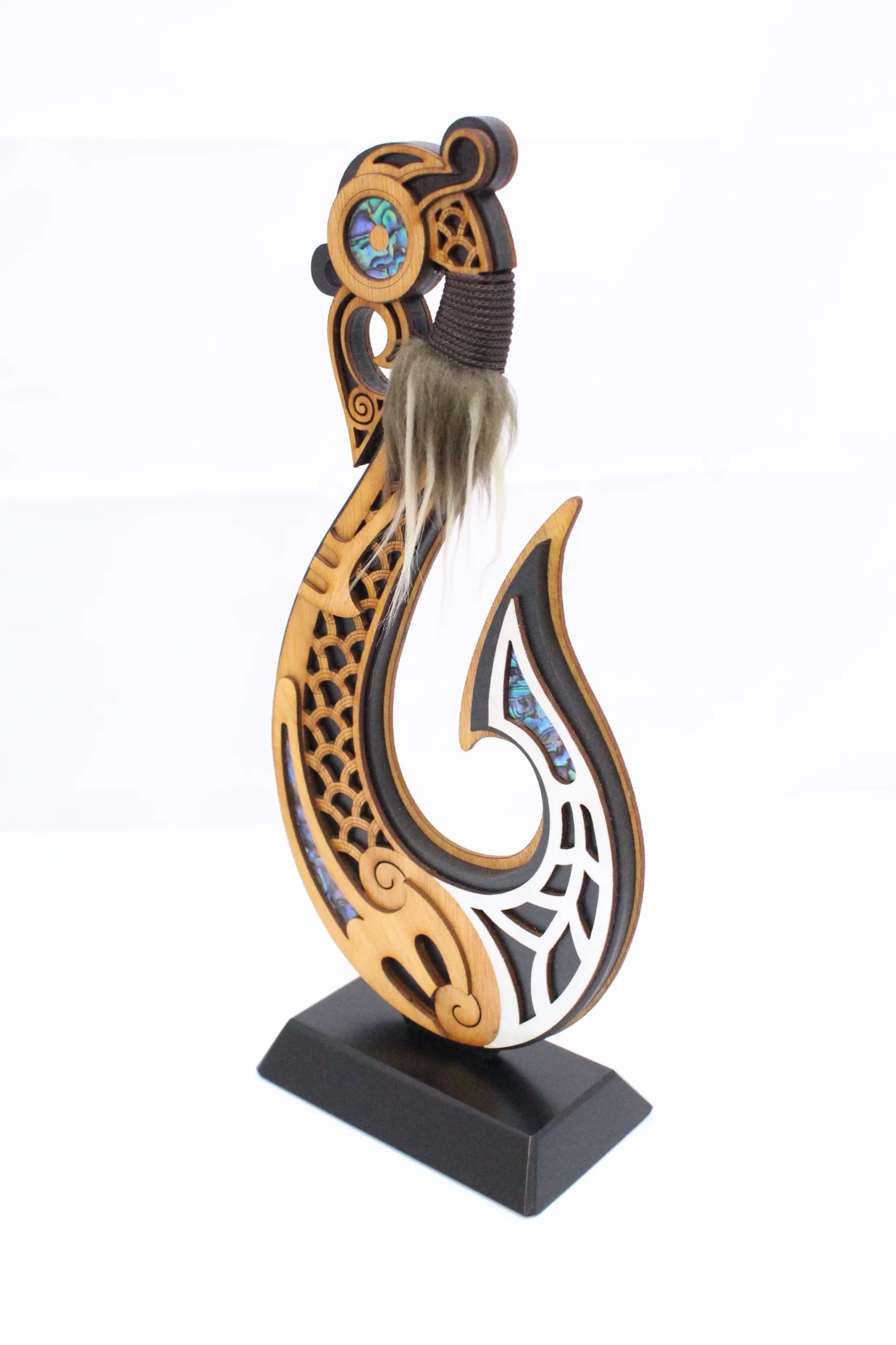 The large standing hook artwork (300mm high) is a contemporary representation of the Fish Hook. This single-sided piece of art boasts super fine detail, paua inlay and comes complete with stylish black base, related story and protective box.