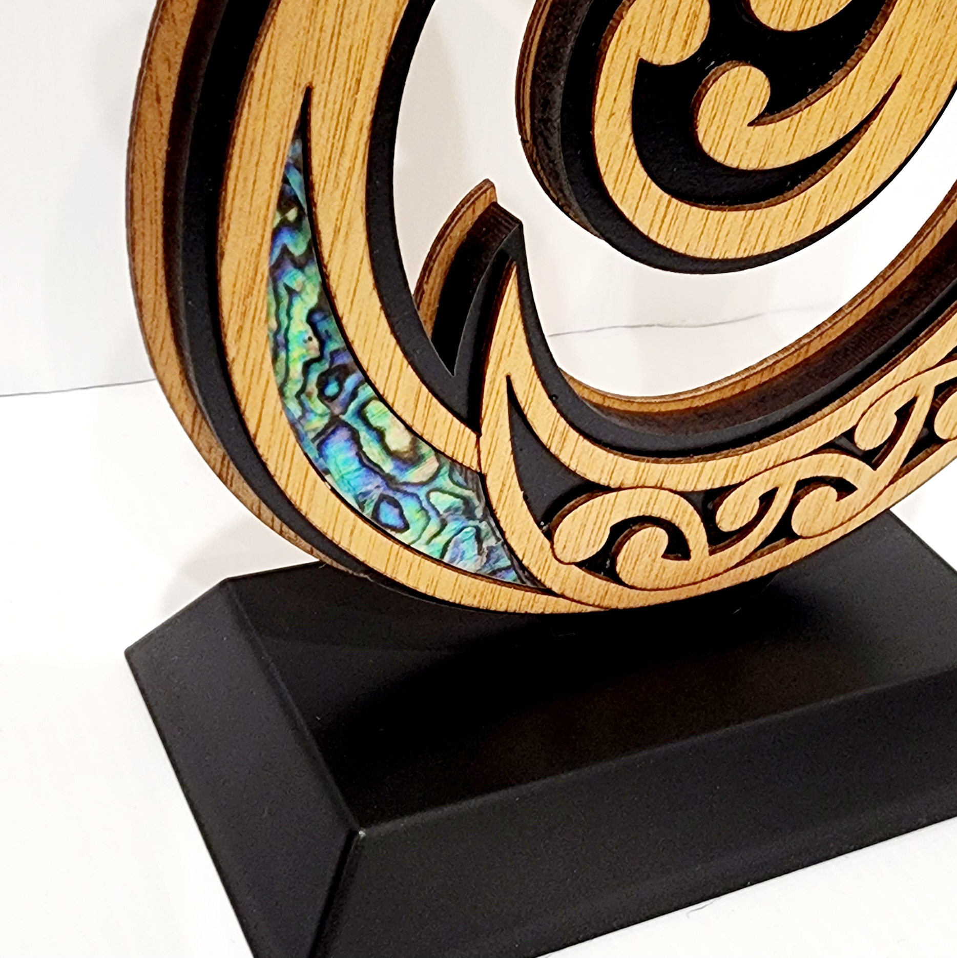 This artwork with its intricate design and super fine detail is crafted from Gaboon veneer plywood, medium density fibreboard (mdf) and embellished with NZ Paua laminate.