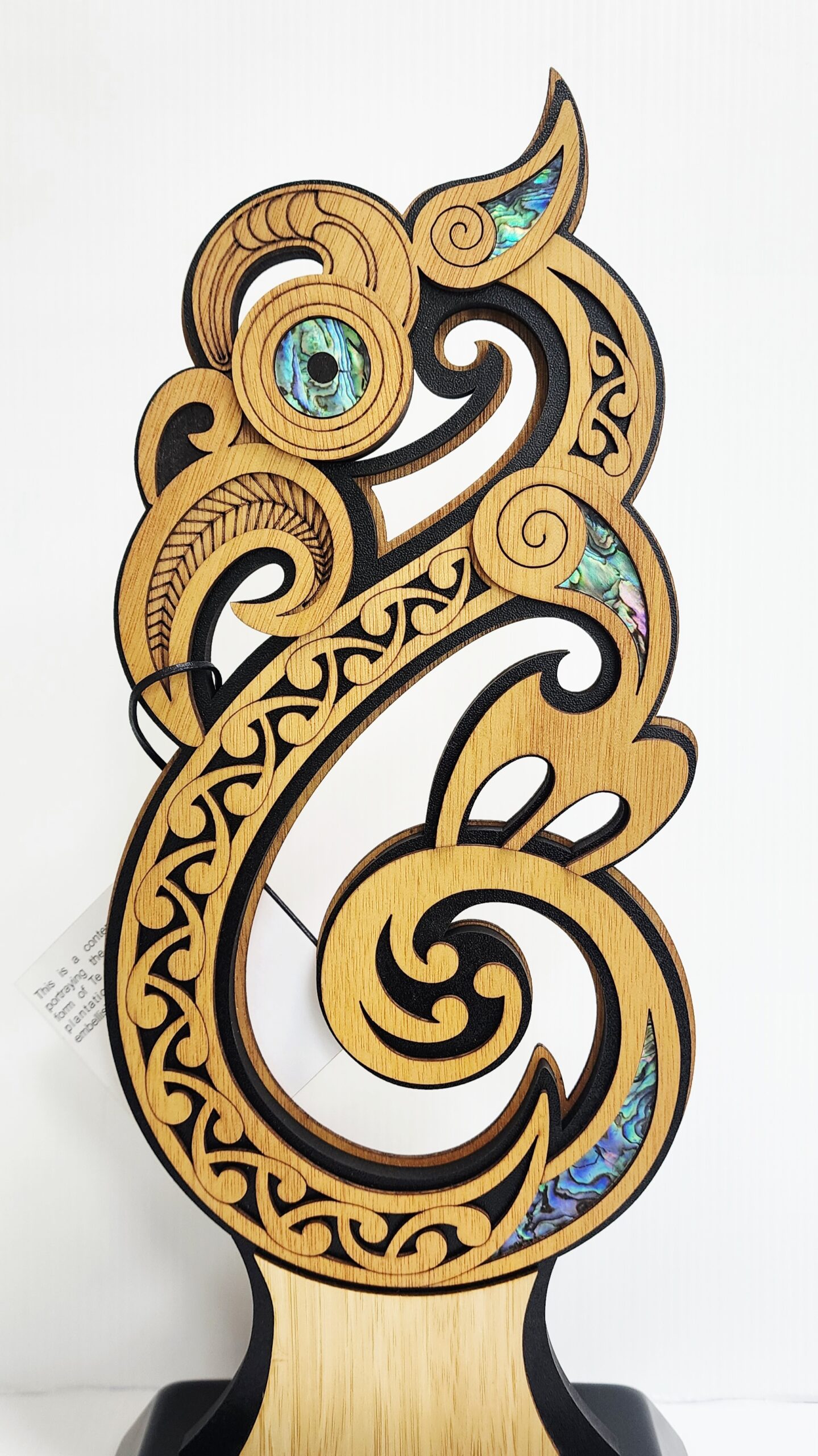 Every element of the piece is enhanced with precision laser engraving, showcasing super fine detailing including koru-inspired spirals, flowing patterns, and traditional motifs that reflect movement, life, and continuity. The layered construction creates a dynamic interplay of light and shadow, adding richness and dimension to the overall design.