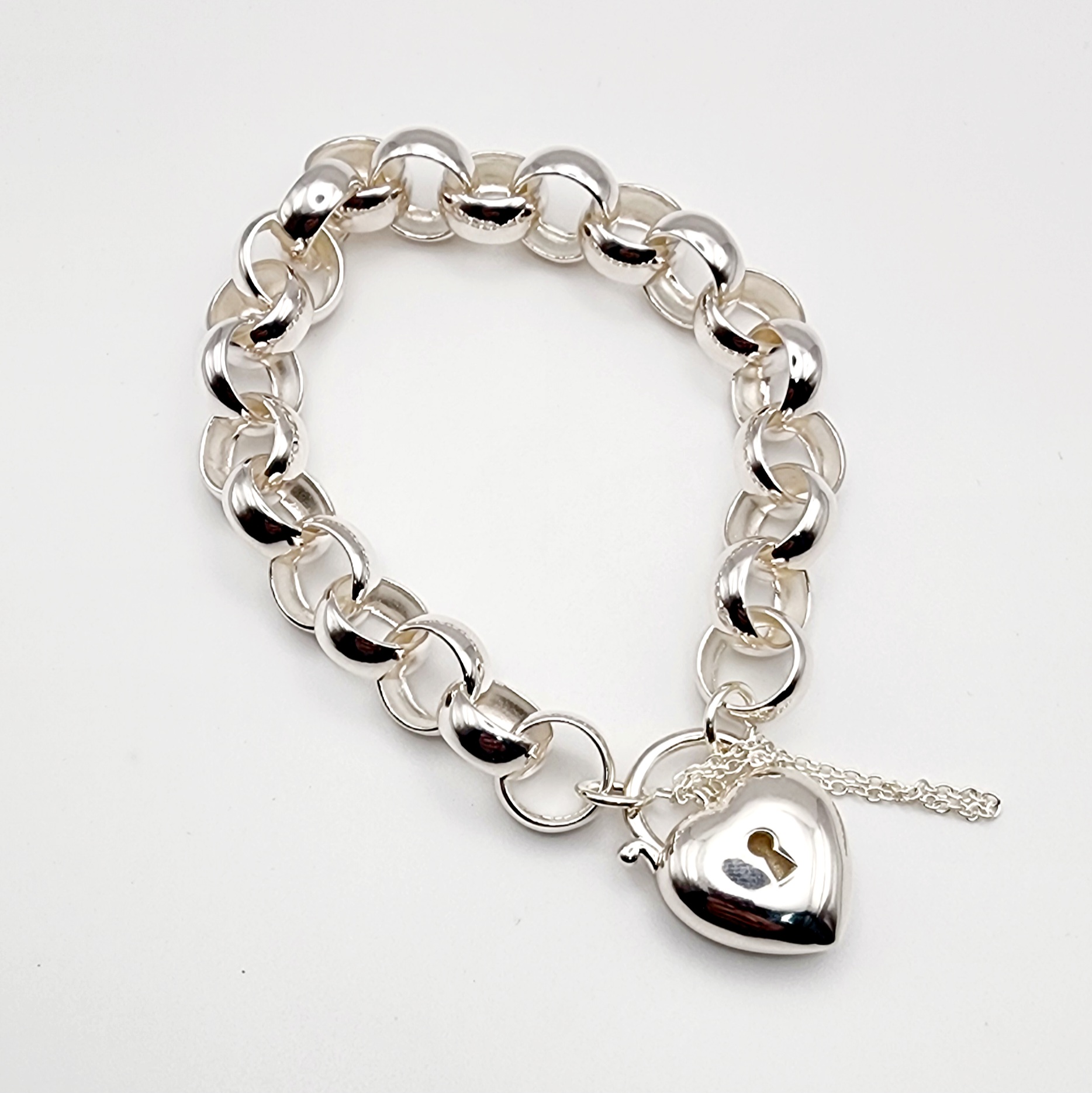 Large Sterling Silver 25cm Round Belcher Bracelet With Puff Heart Padlock