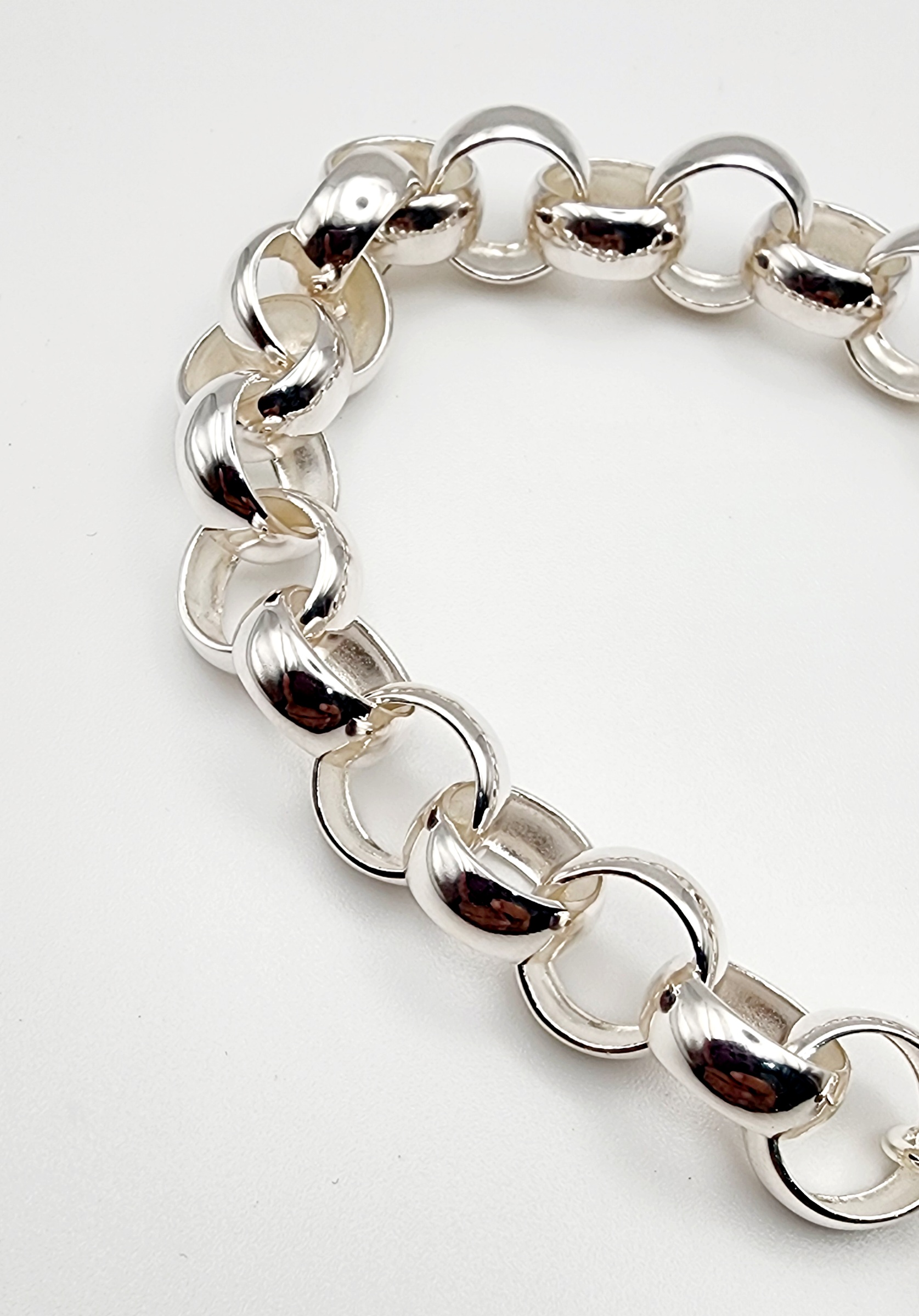This stunning sterling silver bracelet features large, round belcher links, creating a bold yet timeless design. Each link measures 12mm in diameter and 4.5mm in width, providing a sturdy and substantial appearance while maintaining a smooth, polished finish. The bracelet is adorned with an eye-catching puff heart padlock charm that measures 18mm in width, serving as both a decorative centerpiece and a functional clasp.