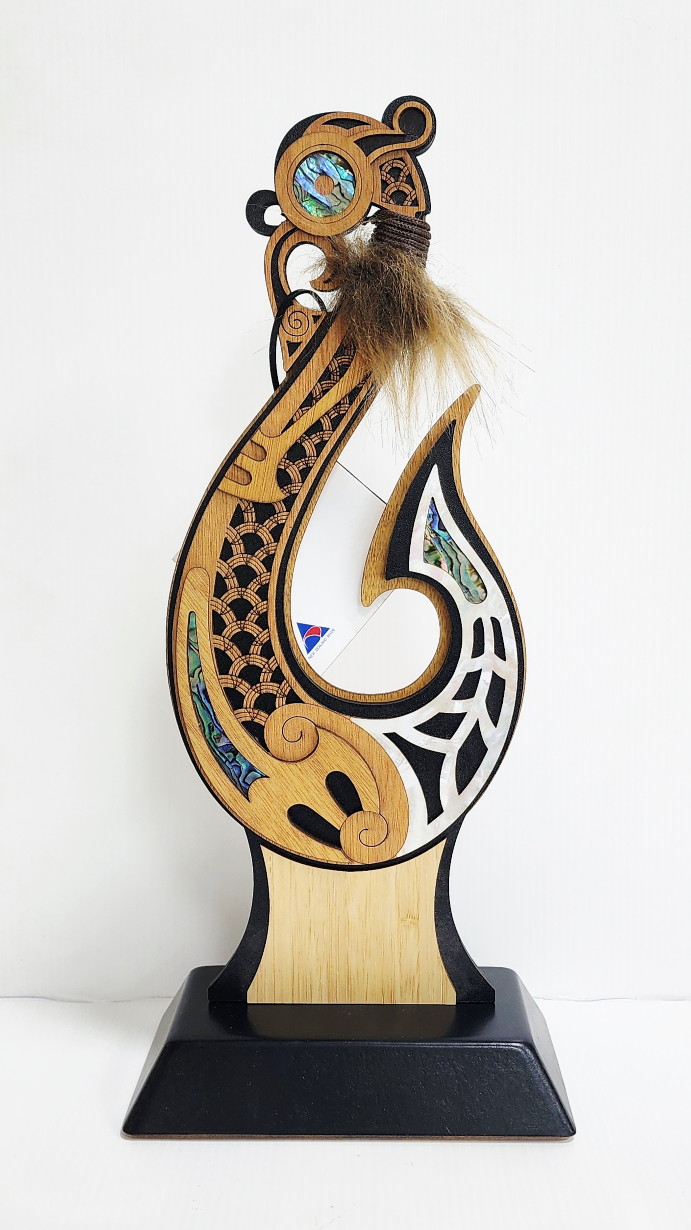 A bold symbol of strength, prosperity, and safe journey, the Large Te Matau a Māui Hook Award is a contemporary artistic interpretation of one of Aotearoa’s most iconic cultural forms — the legendary fish hook of Māui.