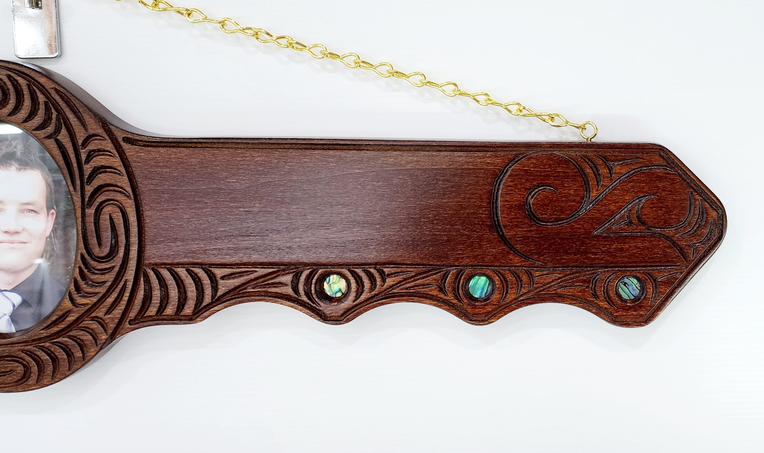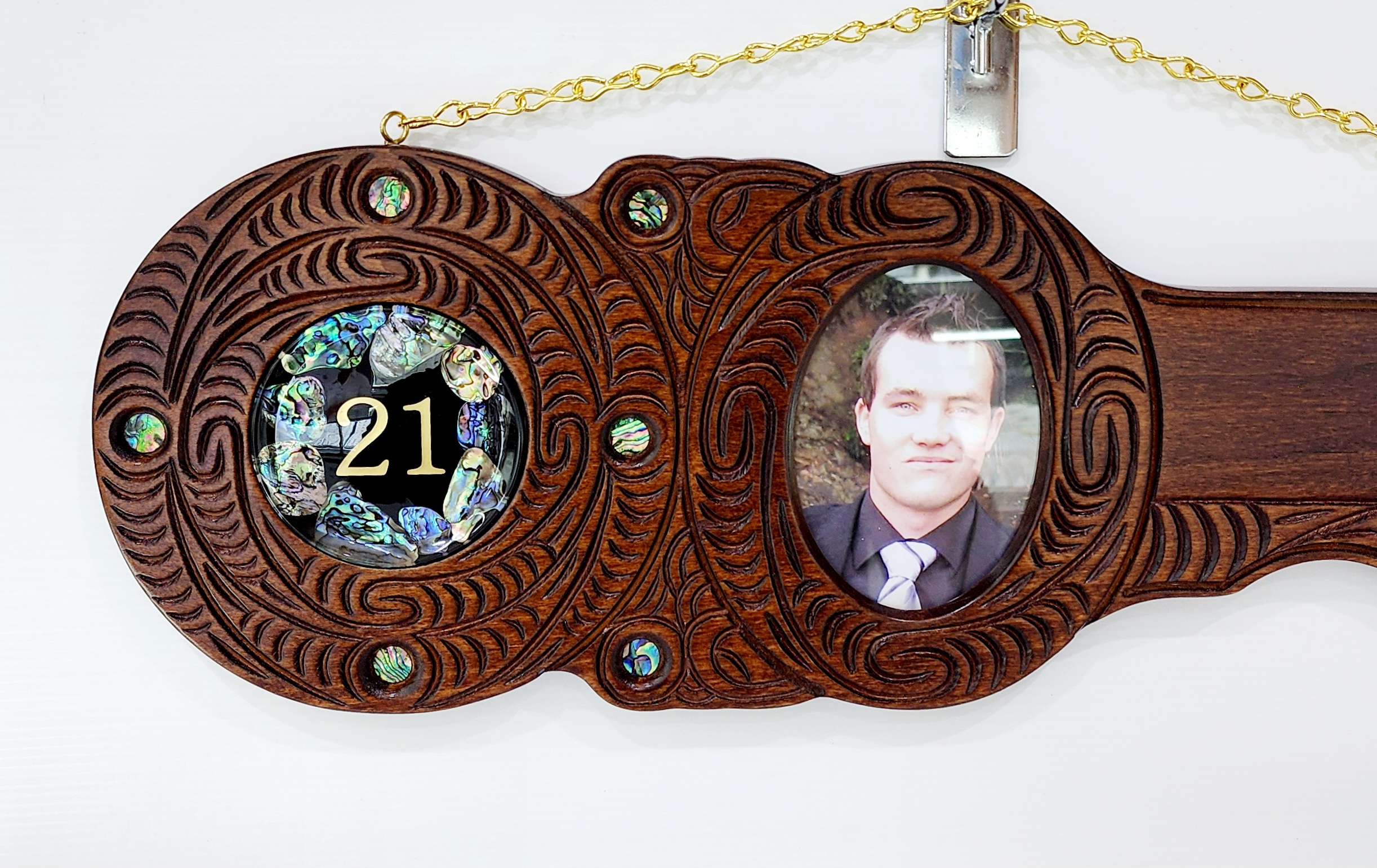 This stunning beaitiful 21st key is made out of Kauri Wood. The key is hand carved in New Zealand by local carvers. The key has 9x round paua shell eyes around the key with round paua shell disk. The disk has gold gold foil “21” inside the disk.