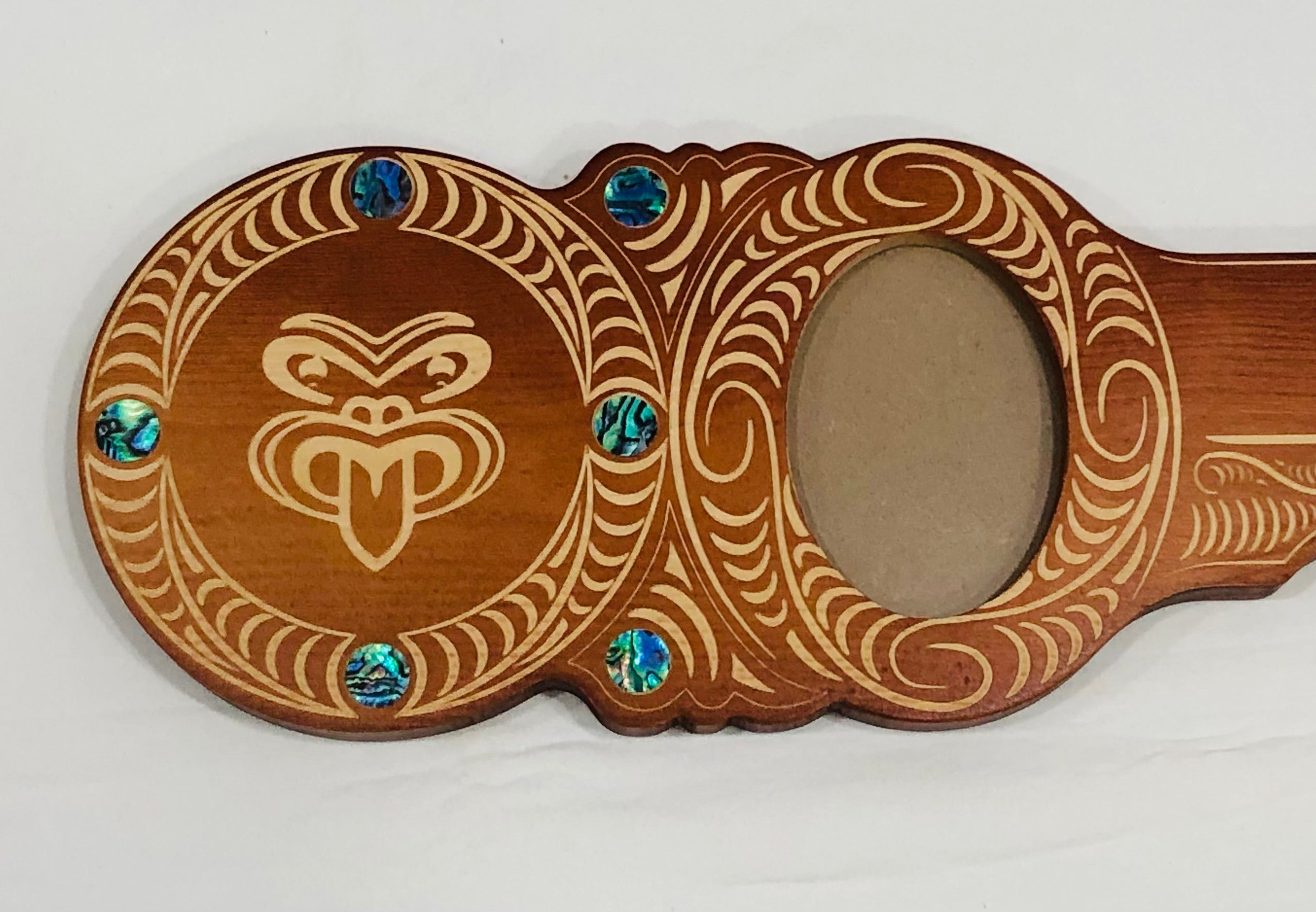 The key has got?laser engraved Tiki face?in the middle of the circle on the far left with 9x round paua shell disk inlay around the key.
