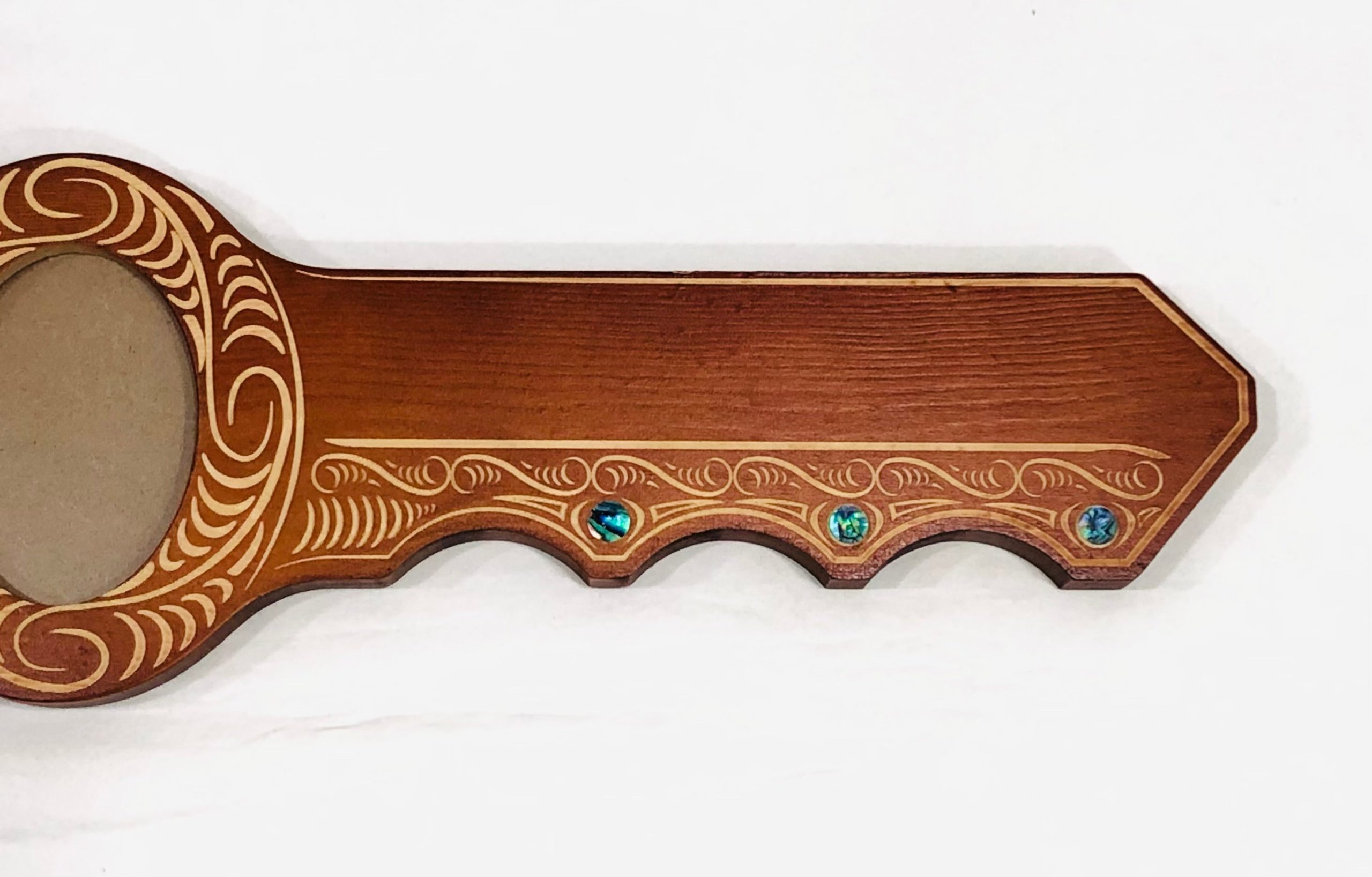 Maori Design Key with Laser Engraved Tiki Face & Round Paua Shell Inlay – Design S17