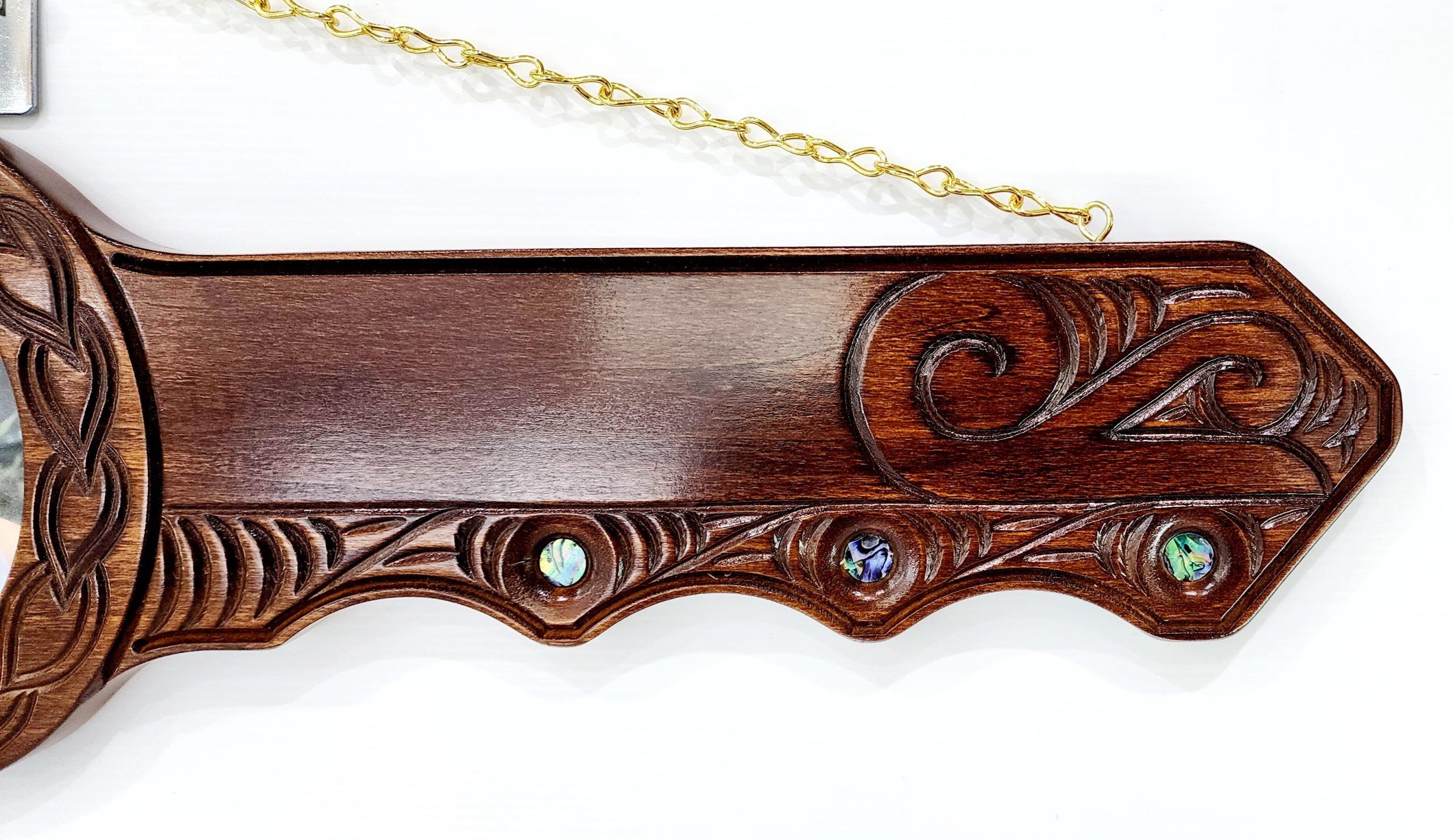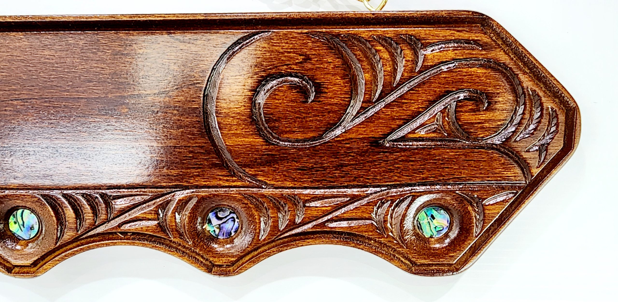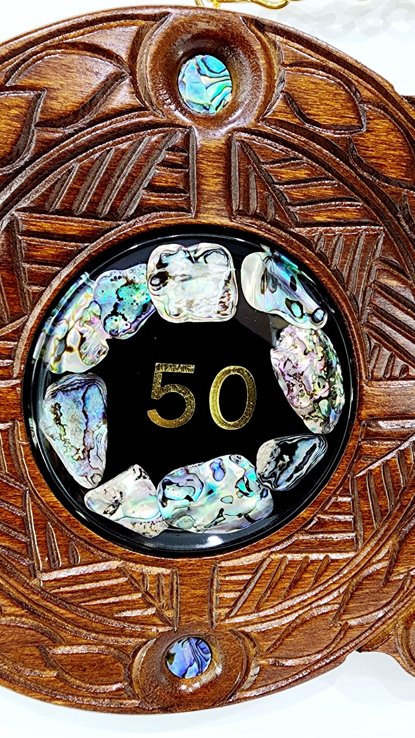 Maori / Island Mixed Design Hand Carved 50th Wooden Key with “50” Paua Shell Disk Insert