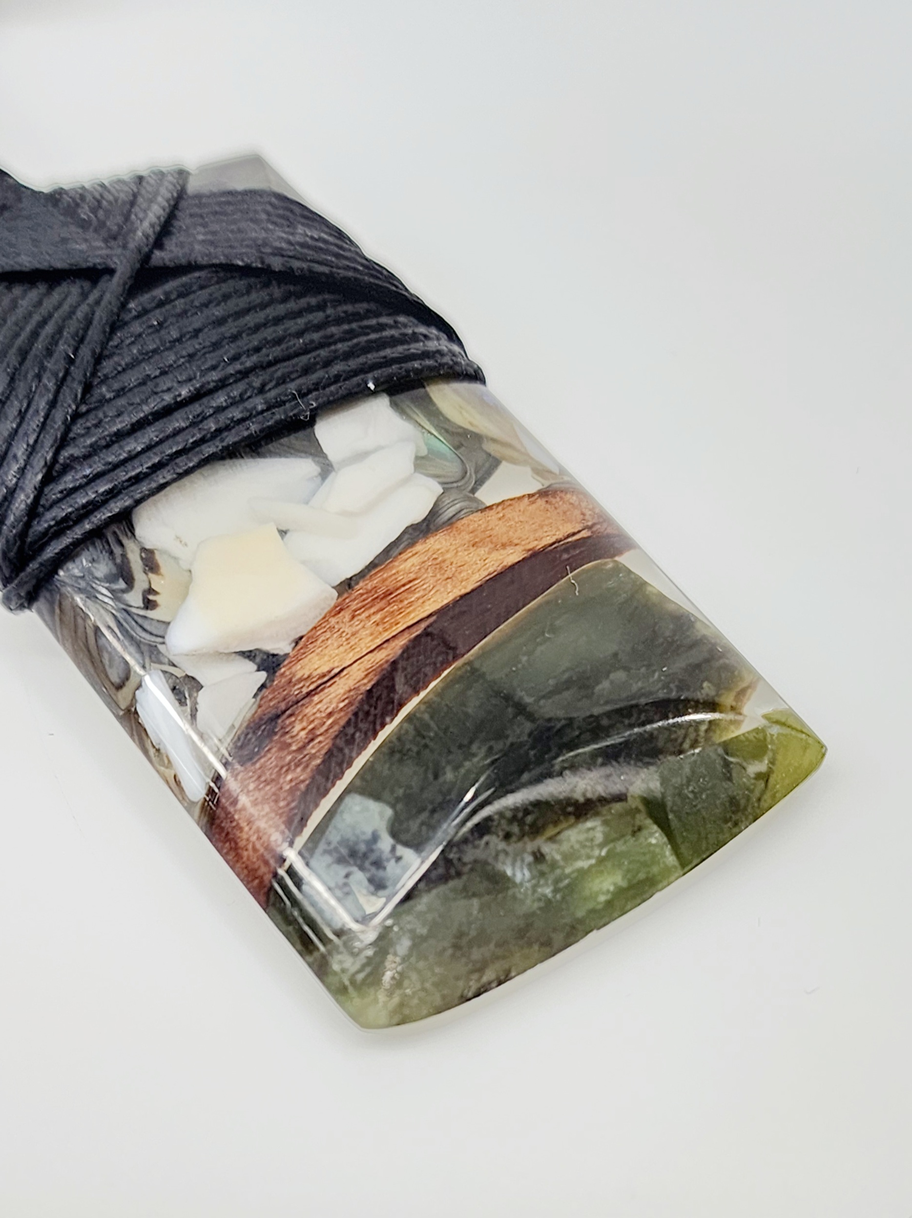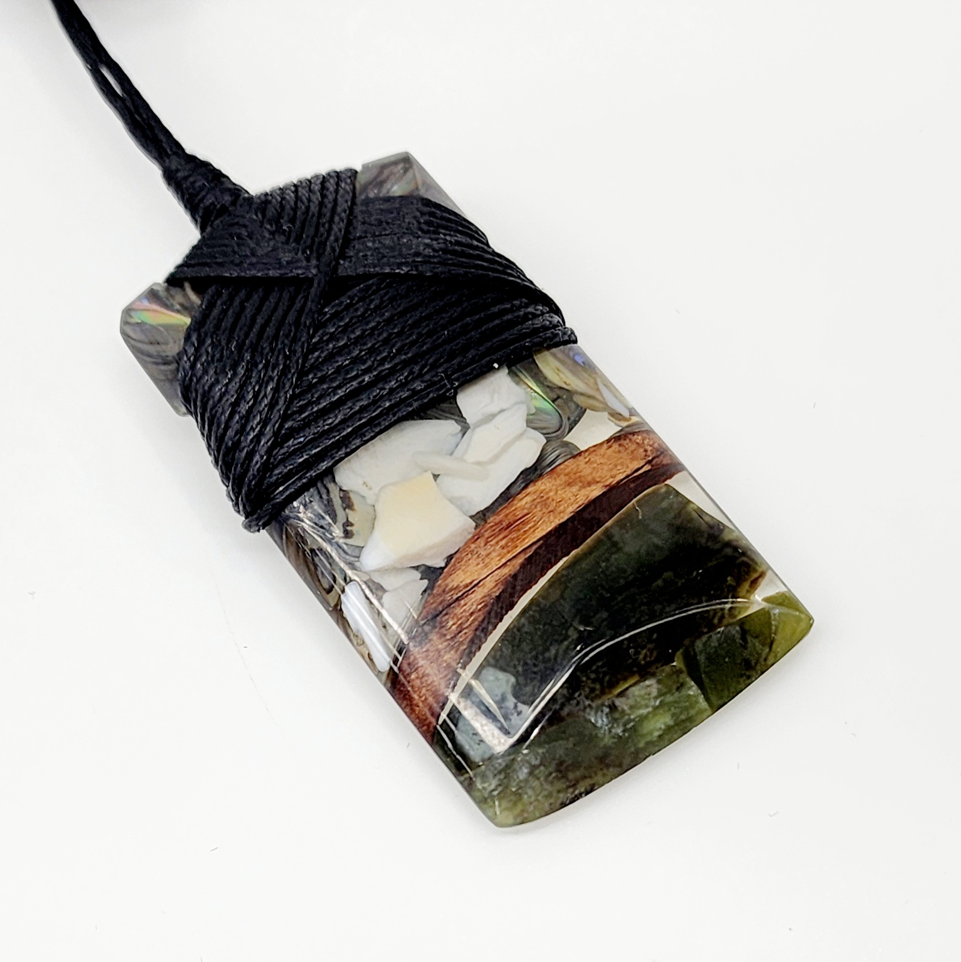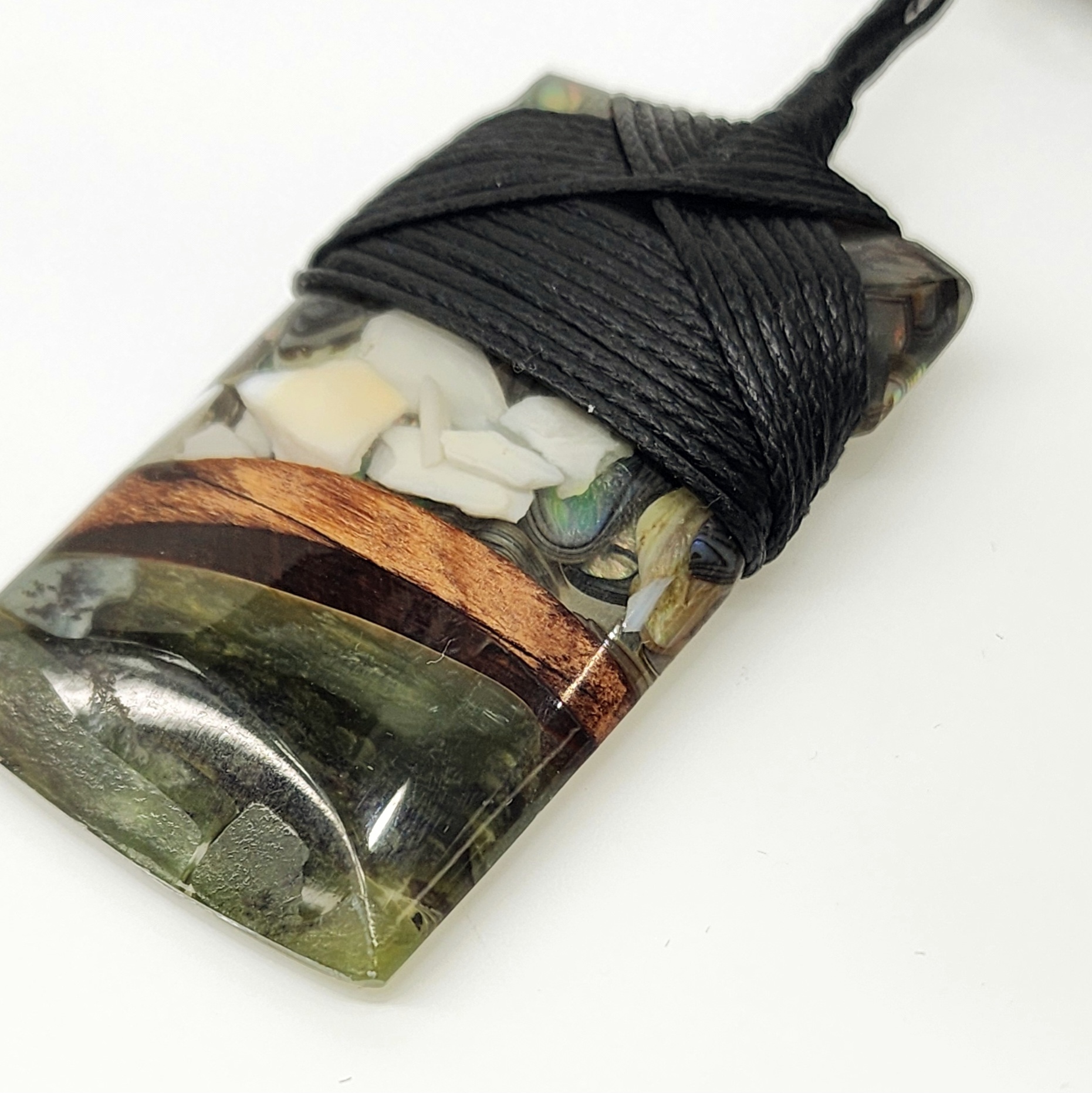 This genuine New Zealand made Toki is made of recycled Rimu, NZ Paua, NZ Greenstone and Pipo Shells with resin. It comes with an adjustable woven black cord.