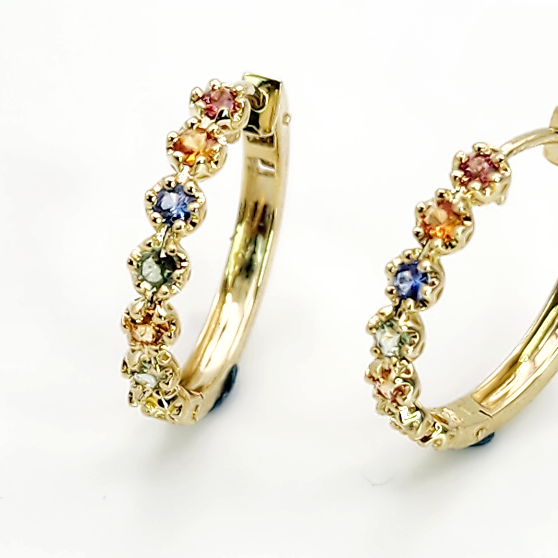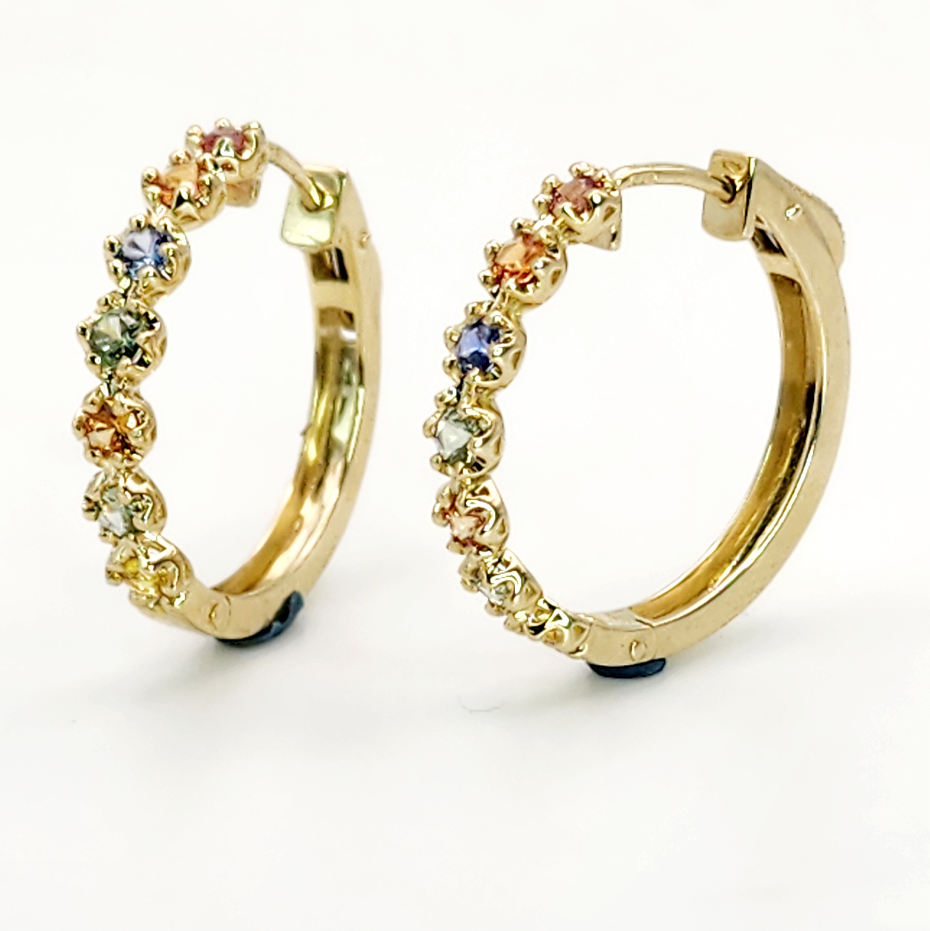 Make a statement with this multi colour natural sapphire hoop earrings in 9ct yellow gold.