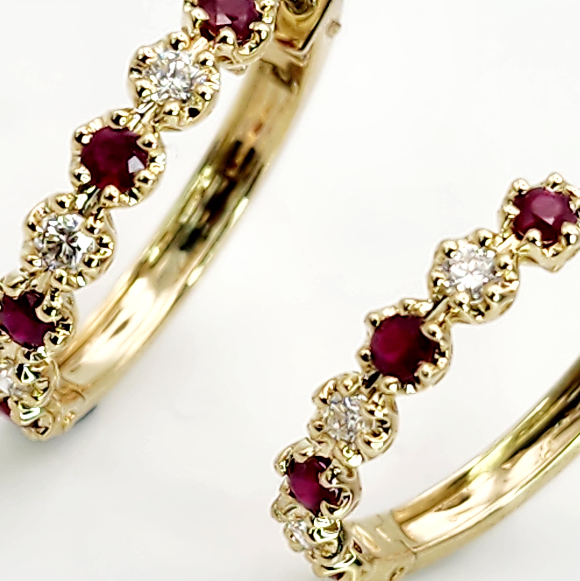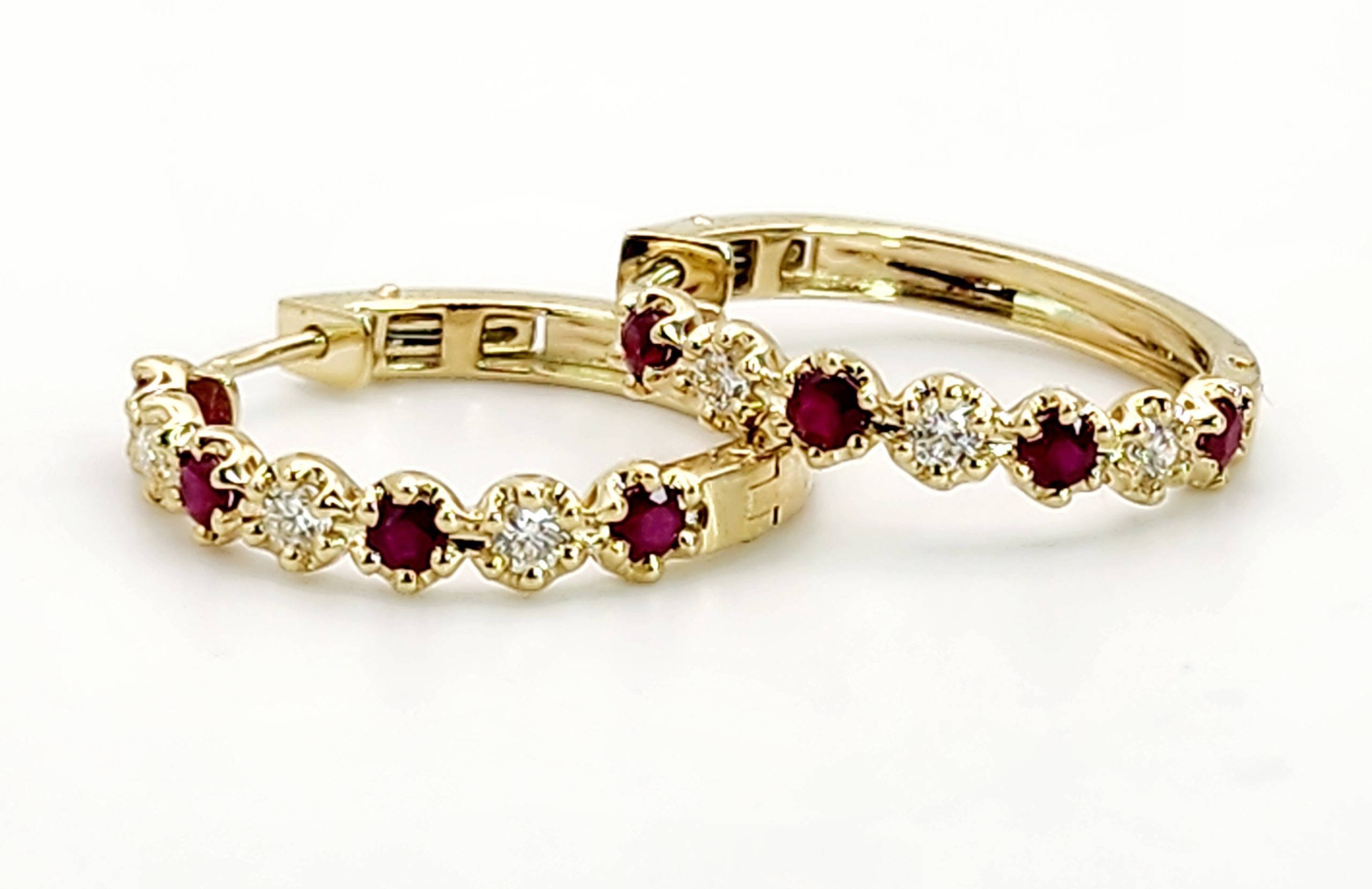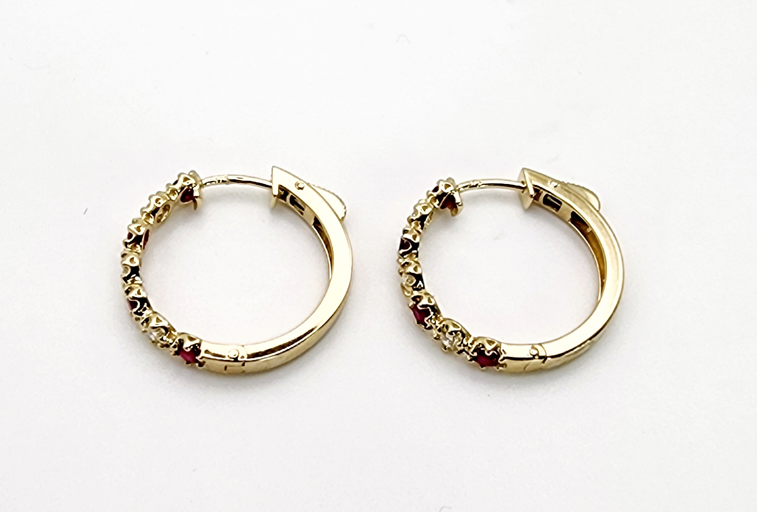 Each hoop 18mm hoop elegantly displays the round Ruby and Diamond which is individual set in 6 claw setting.