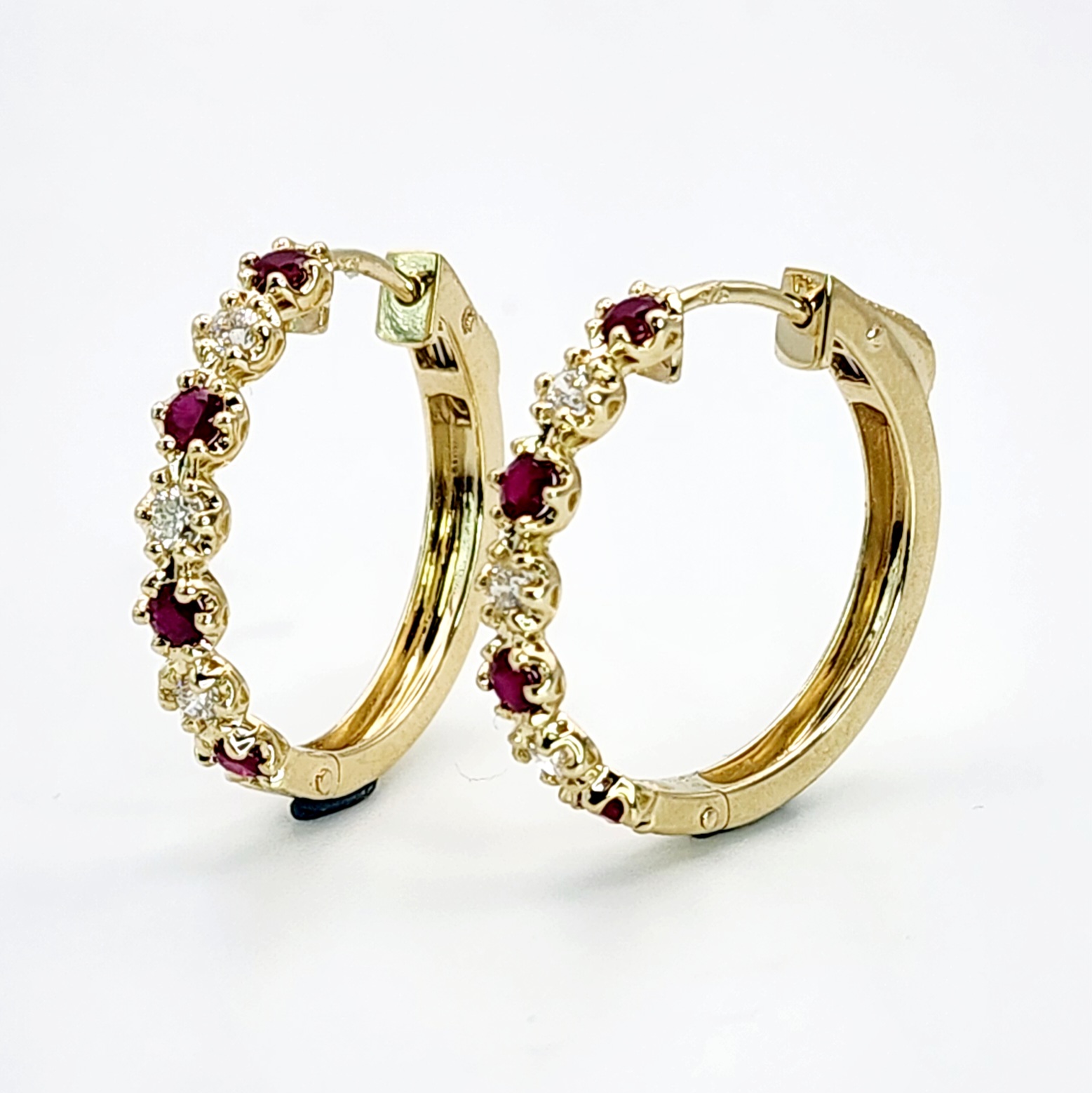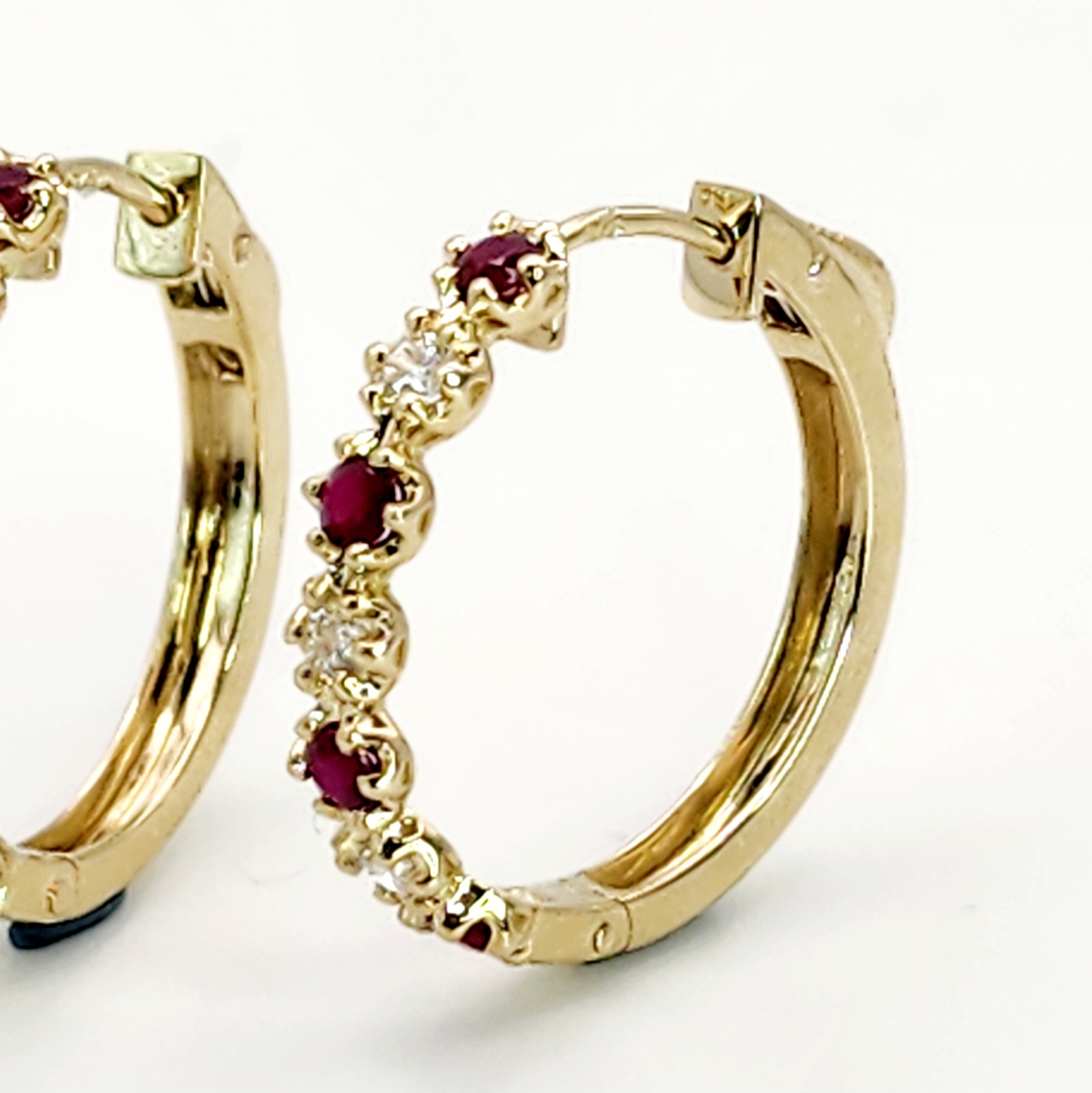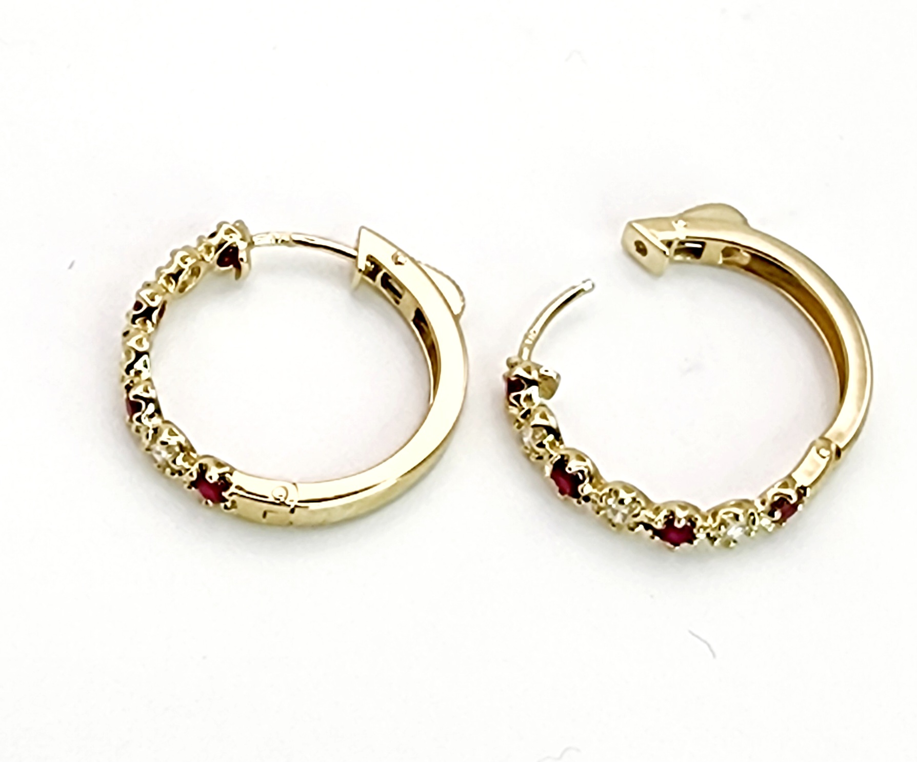 Each hoop 18mm hoop elegantly displays the round Ruby and Diamond which is individual set in 6 claw setting.
