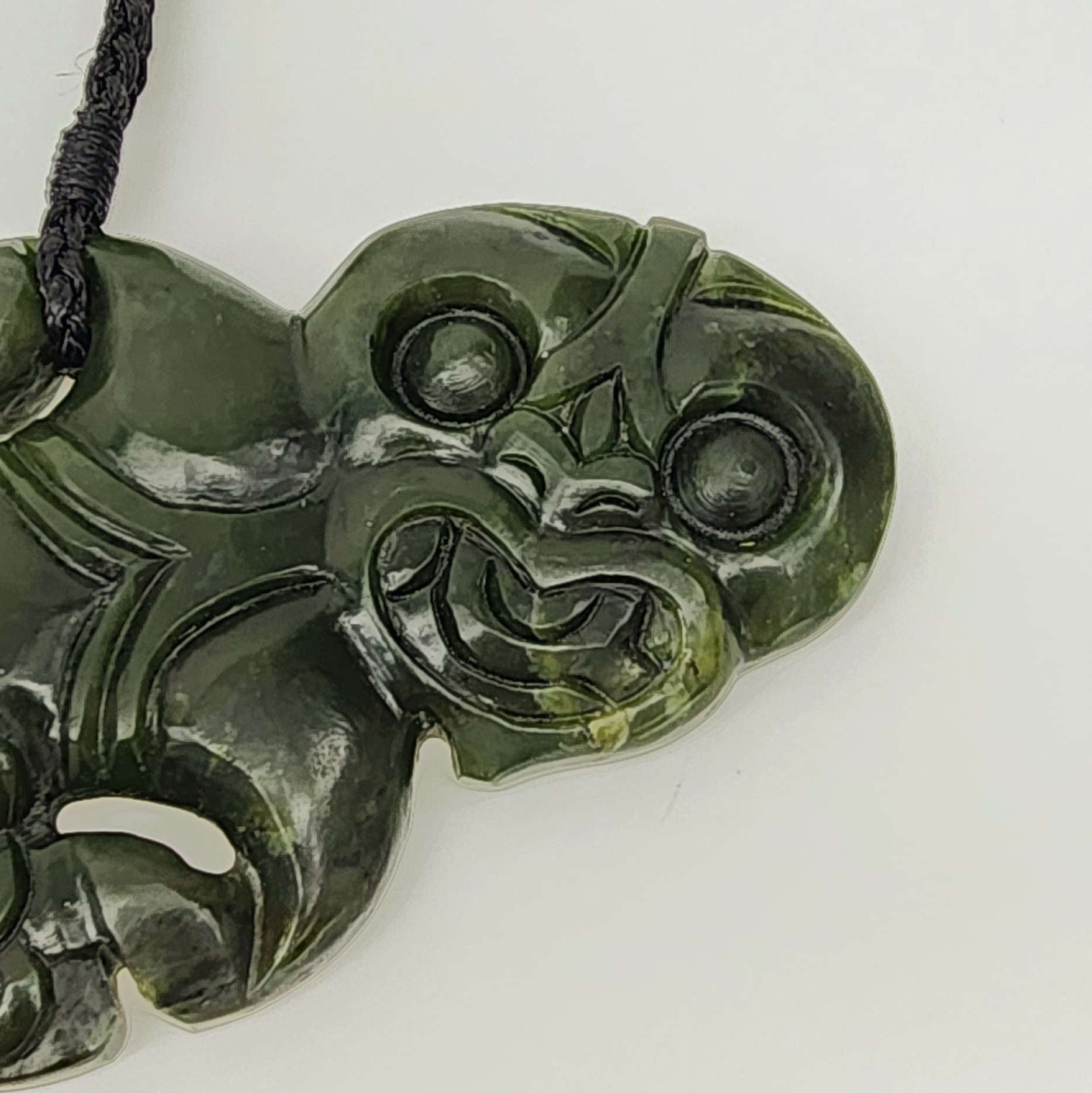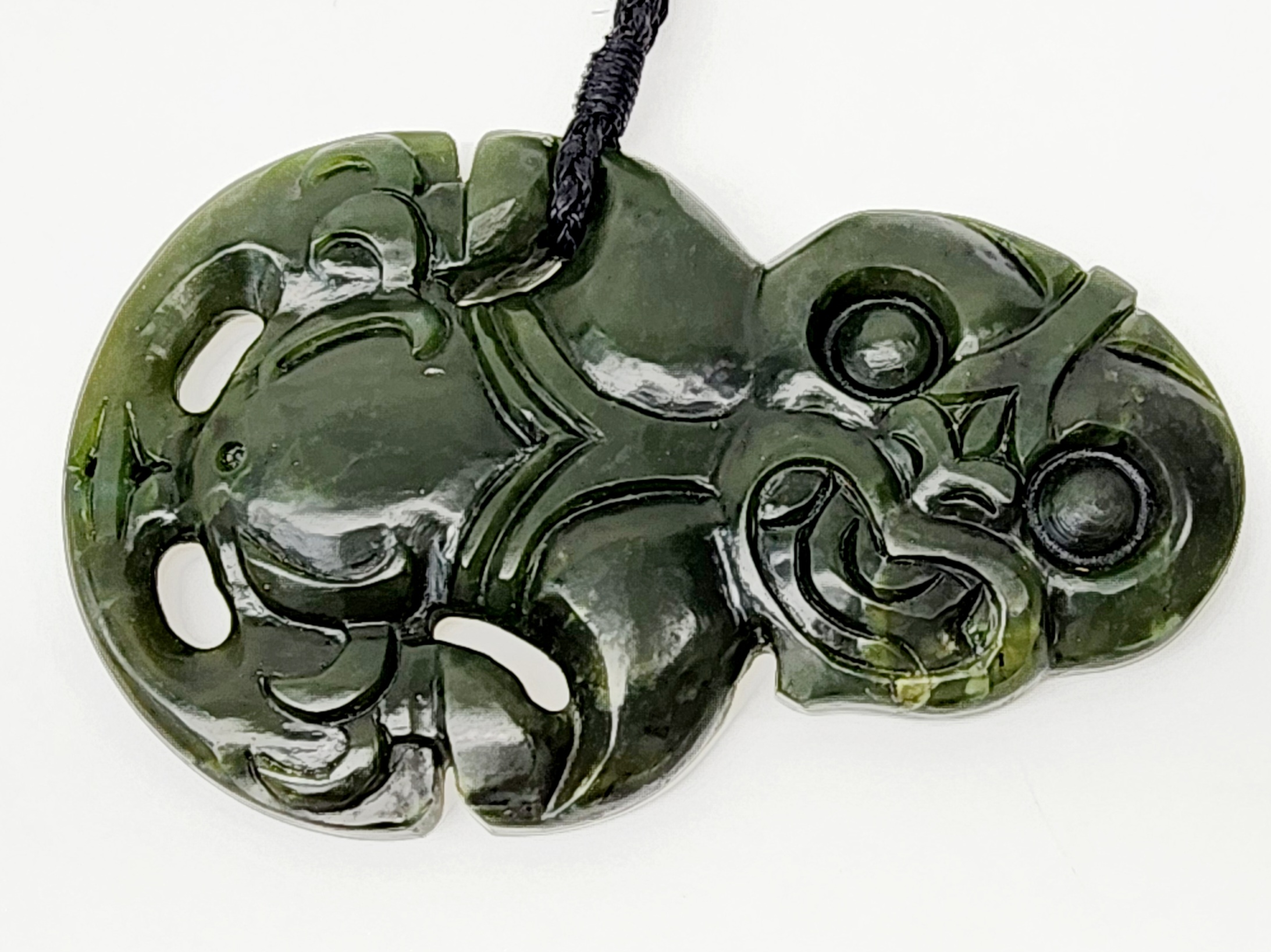 This stunning Hei Tiki is meticulously handcrafted from a beautiful piece of Kawakawa Pounamu, showcasing the stone’s deep, rich hues. The masterful carving reflects exceptional attention to detail, a testament to the skill of renowned carver Deane Moreton.