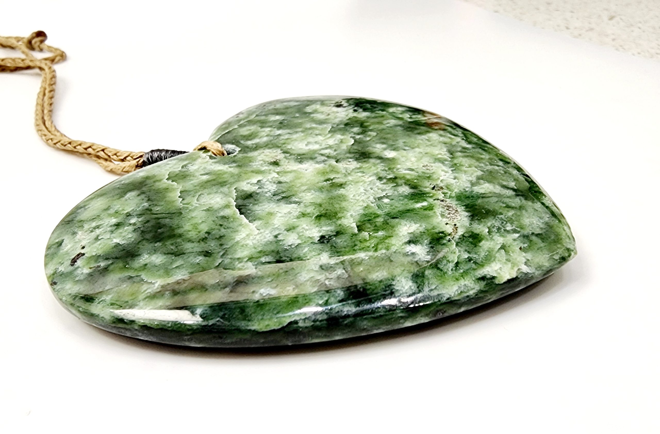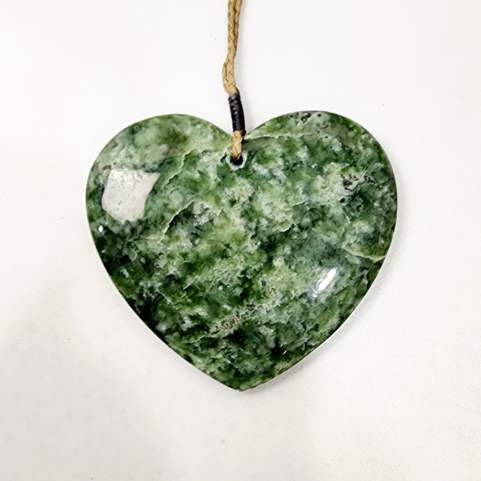 Genuine New Zealand Pounamu (Greenstone), sourced and hand carved in Aotearoa (New Zealand). Pounamu is of great cultural significance for Maori and is believed to enhance mana (prestige) of its possessor. The Greenstone heart necklace comes with on a traditional adjustable waxed cord.