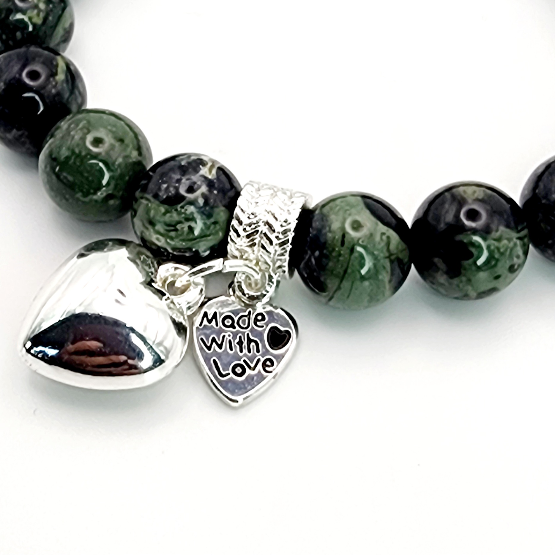 Stretchy elastic New Zealand Greenstone bead bracelet with silver plated charm.