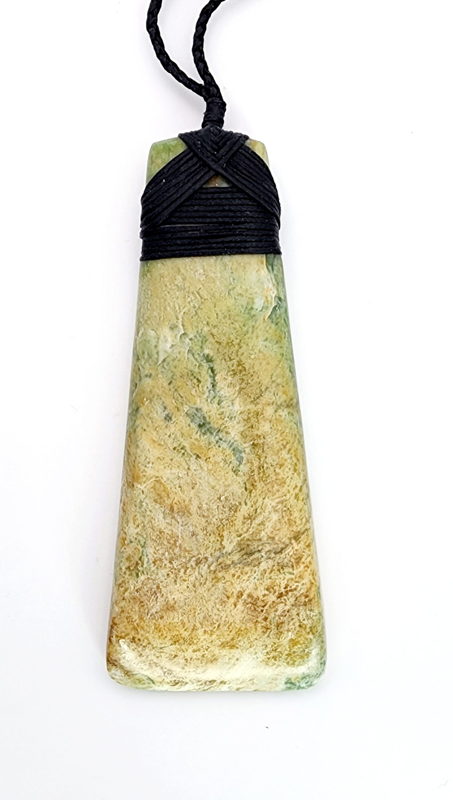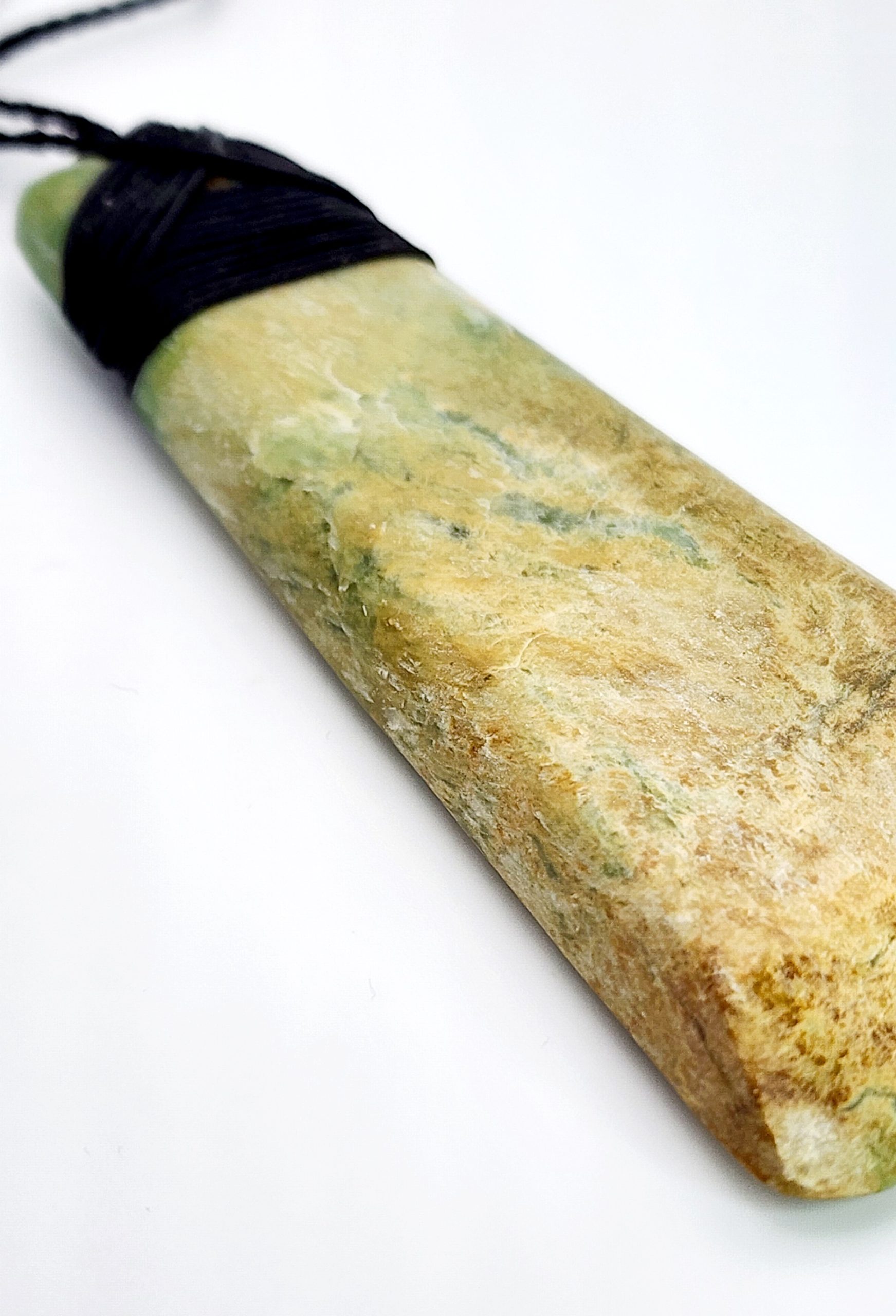 Genuine New Zealand Flower Jade Colour Pounamu (Greenstone), sourced and hand carved in Aotearoa (New Zealand). Pounamu is of great cultural significance for M?ori and is believed to enhance mana (prestige) of its possessor. The Toki comes with an adjustable cord.