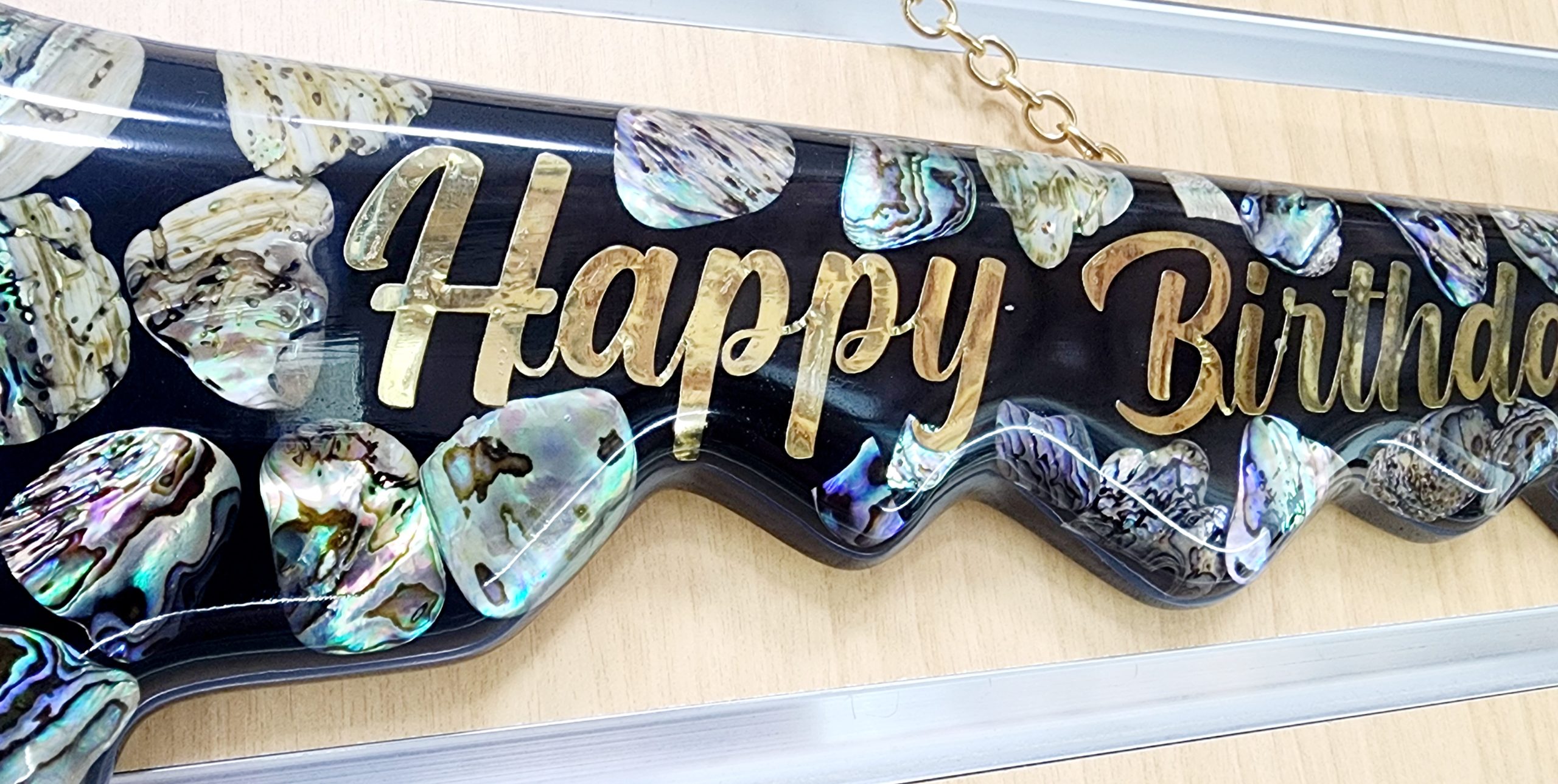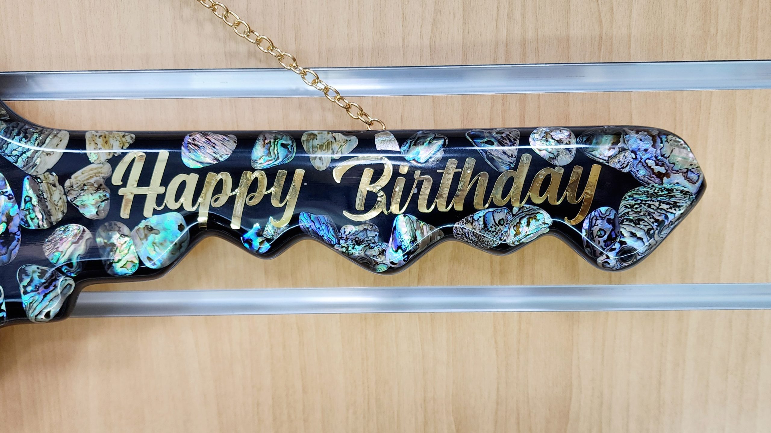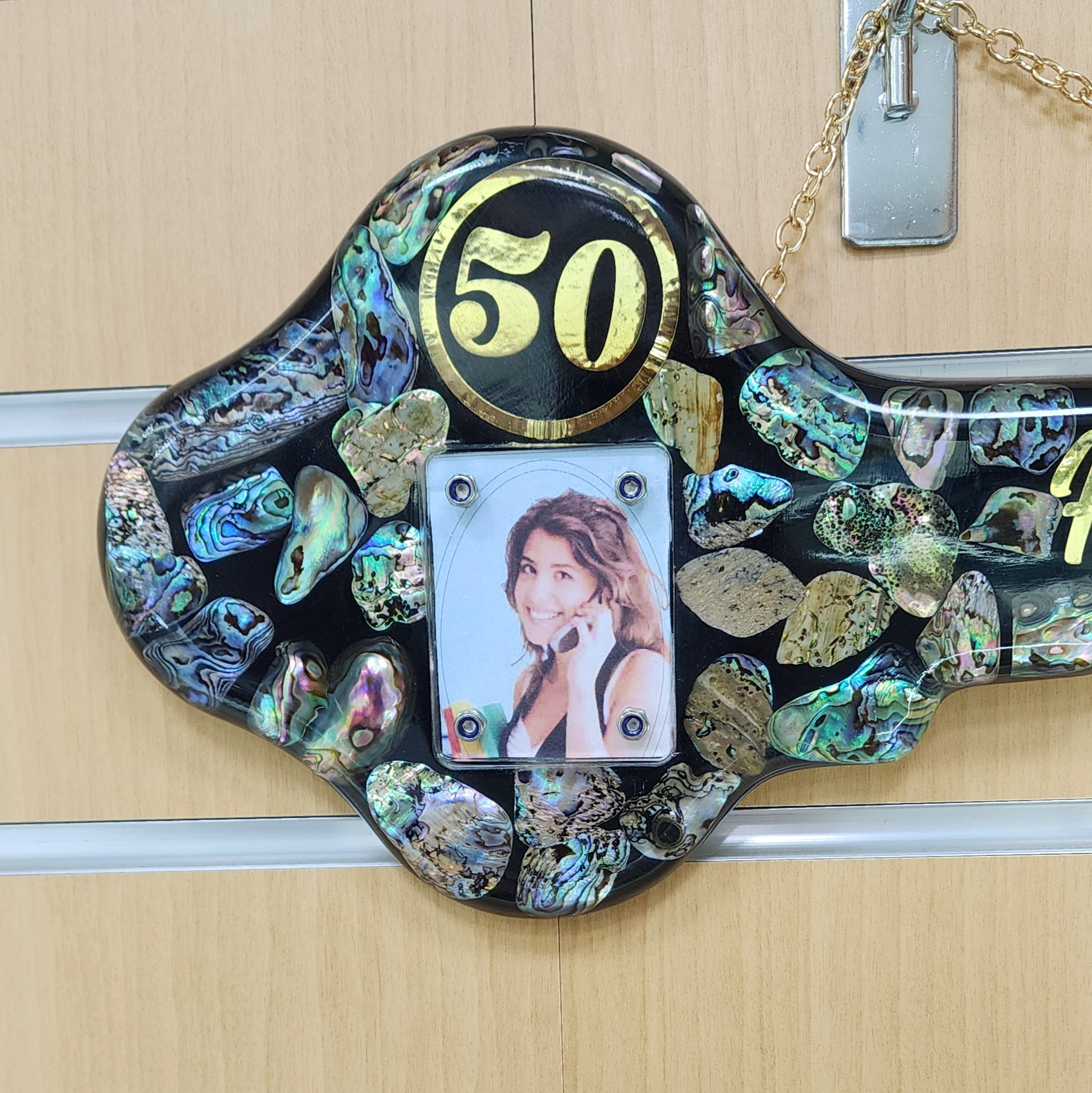 This beautifully crafted 50th celebration key is made using authentic New Zealand paua shell, sealed with a clear resin finish for lasting shine and protection. Measuring 450mm in length and 170mm in width, it features a photo slot on the left side sized at 67mm x 57mm—perfect for adding a personal touch.