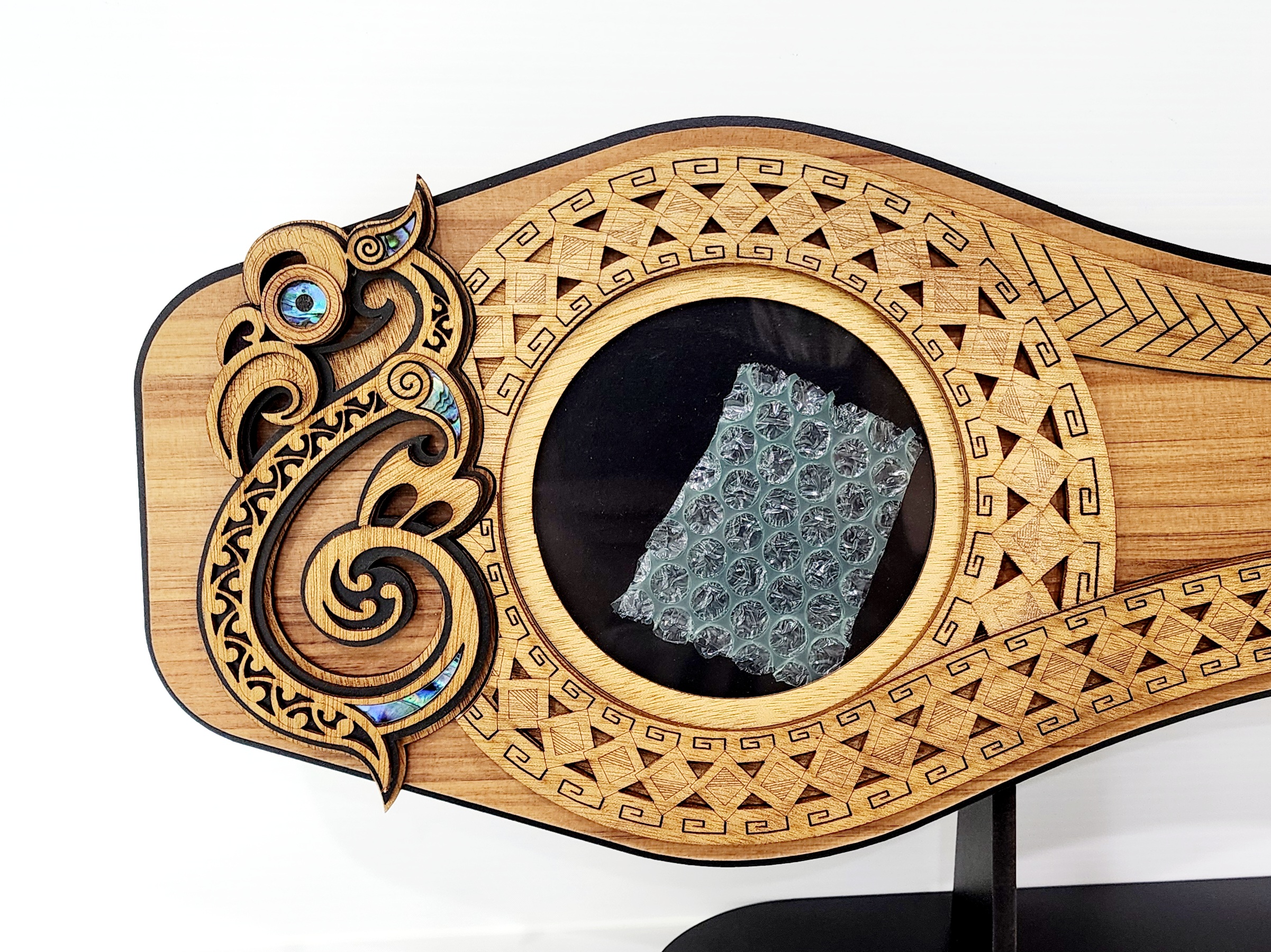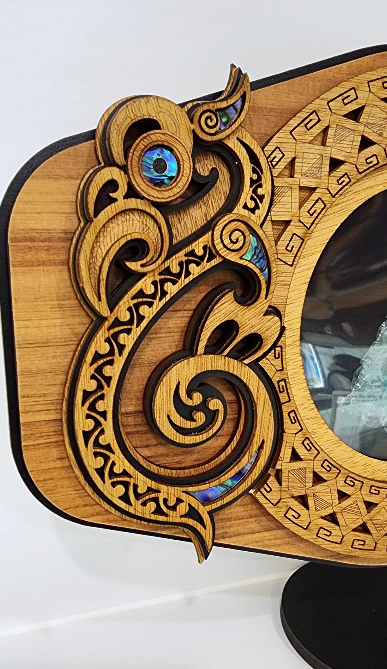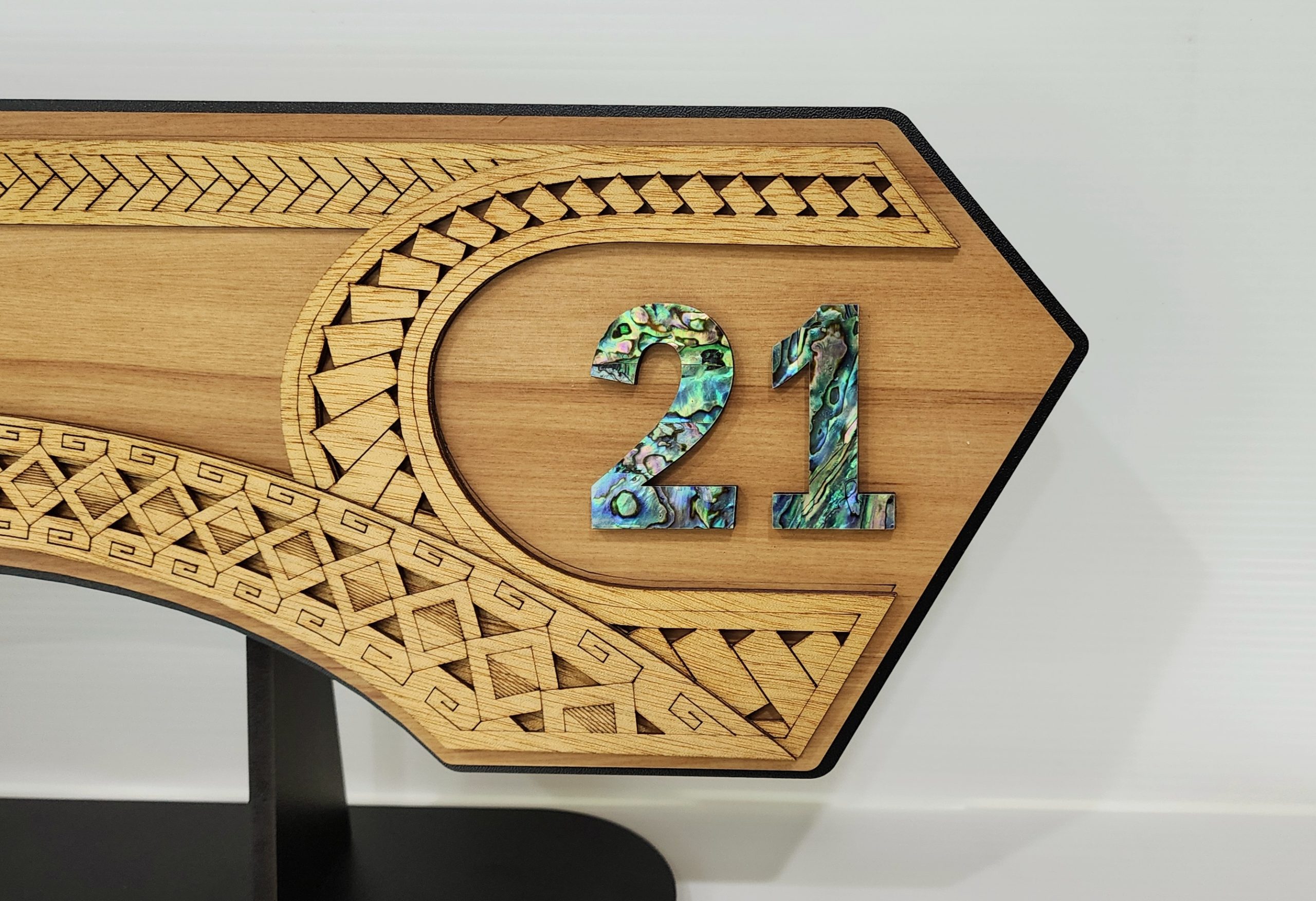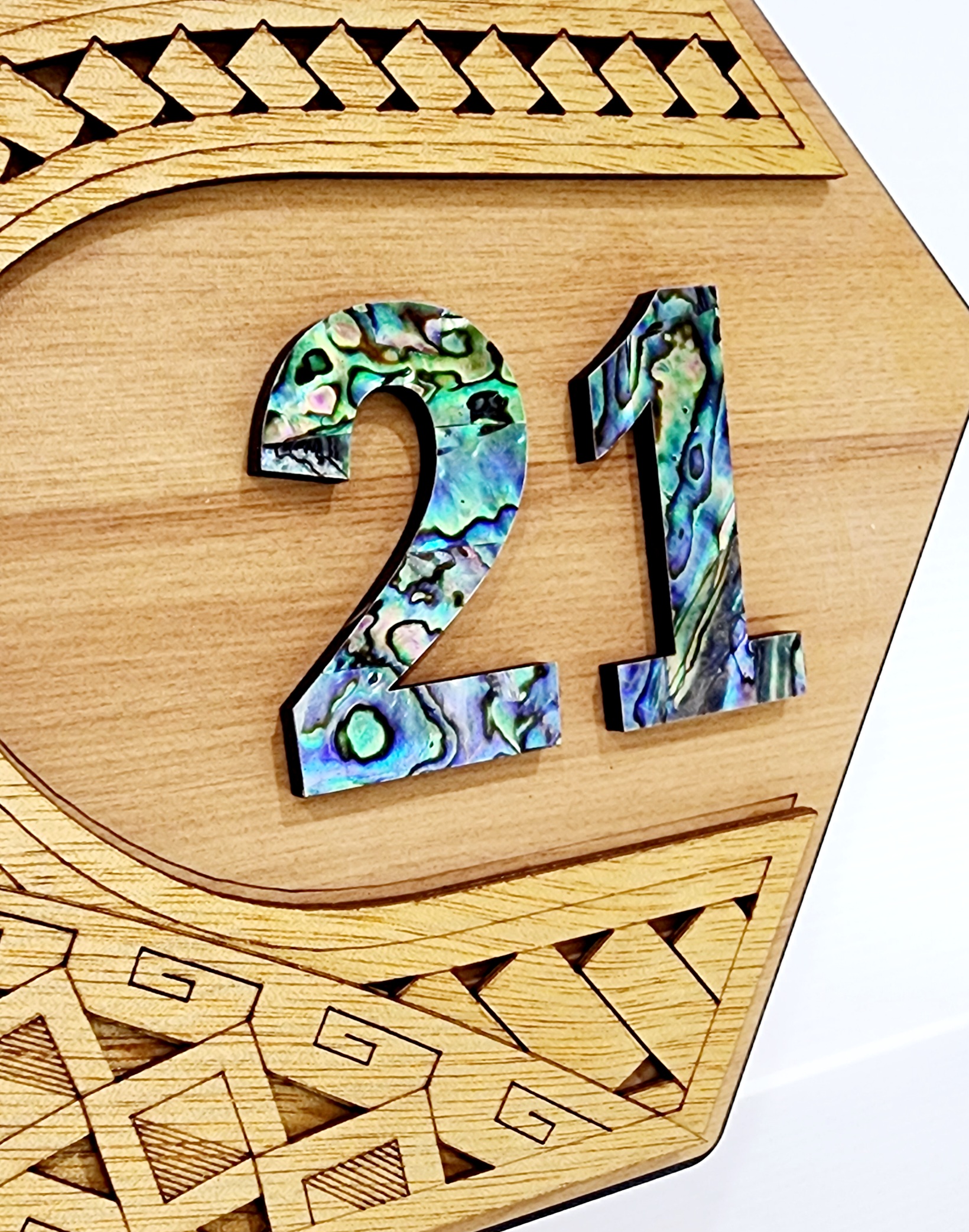 This is a contemporary artwork displaying many common Polynesian designs and artwork styles with intricate design and embellished with Mother of Pearl and Paua shell. The Polynesian 21st Celebration Key is crafted from?recycled Native New Zealand Rimu veneerboard, medium density fibreboard (mdf) and Gaboon veneer plywood.