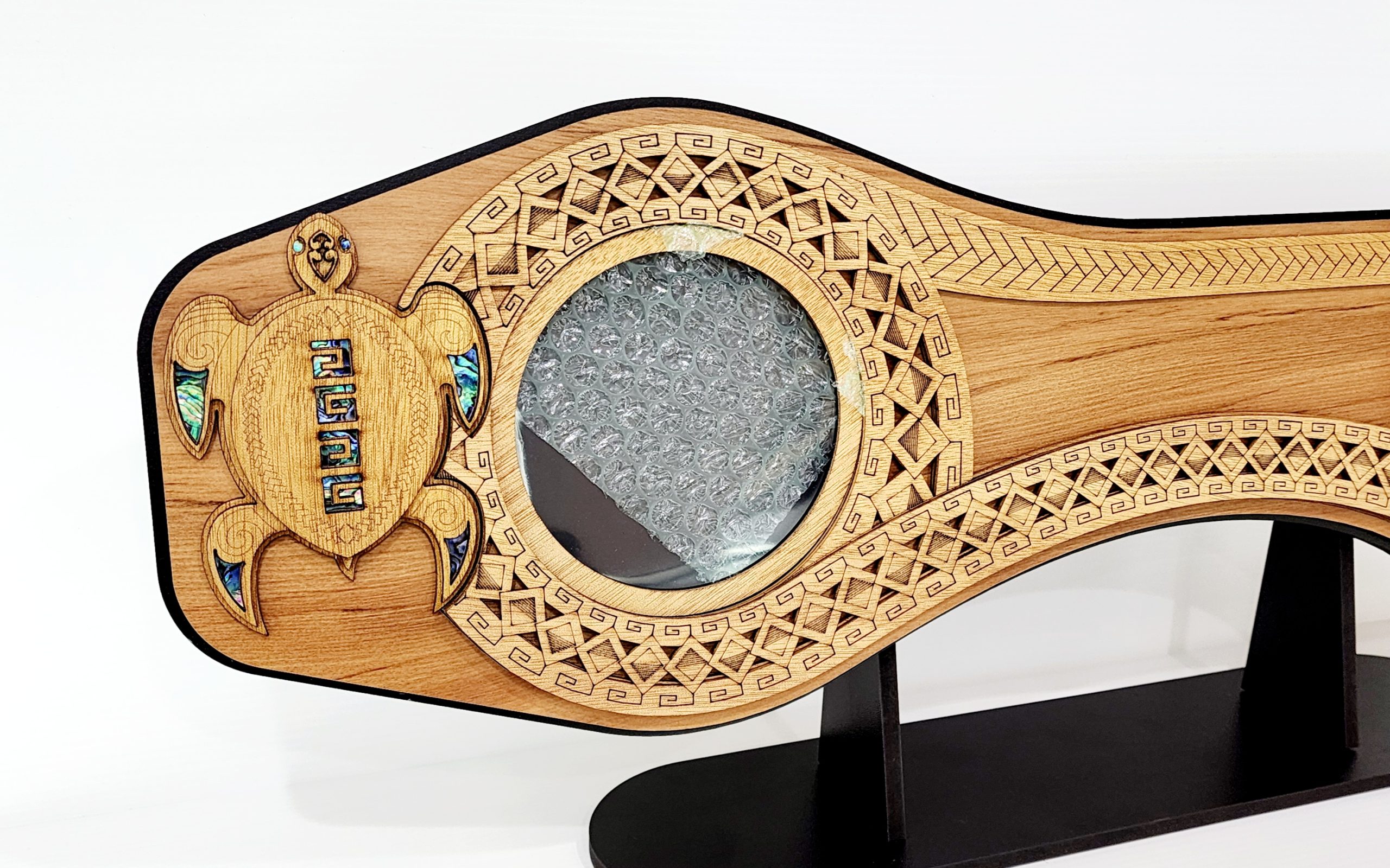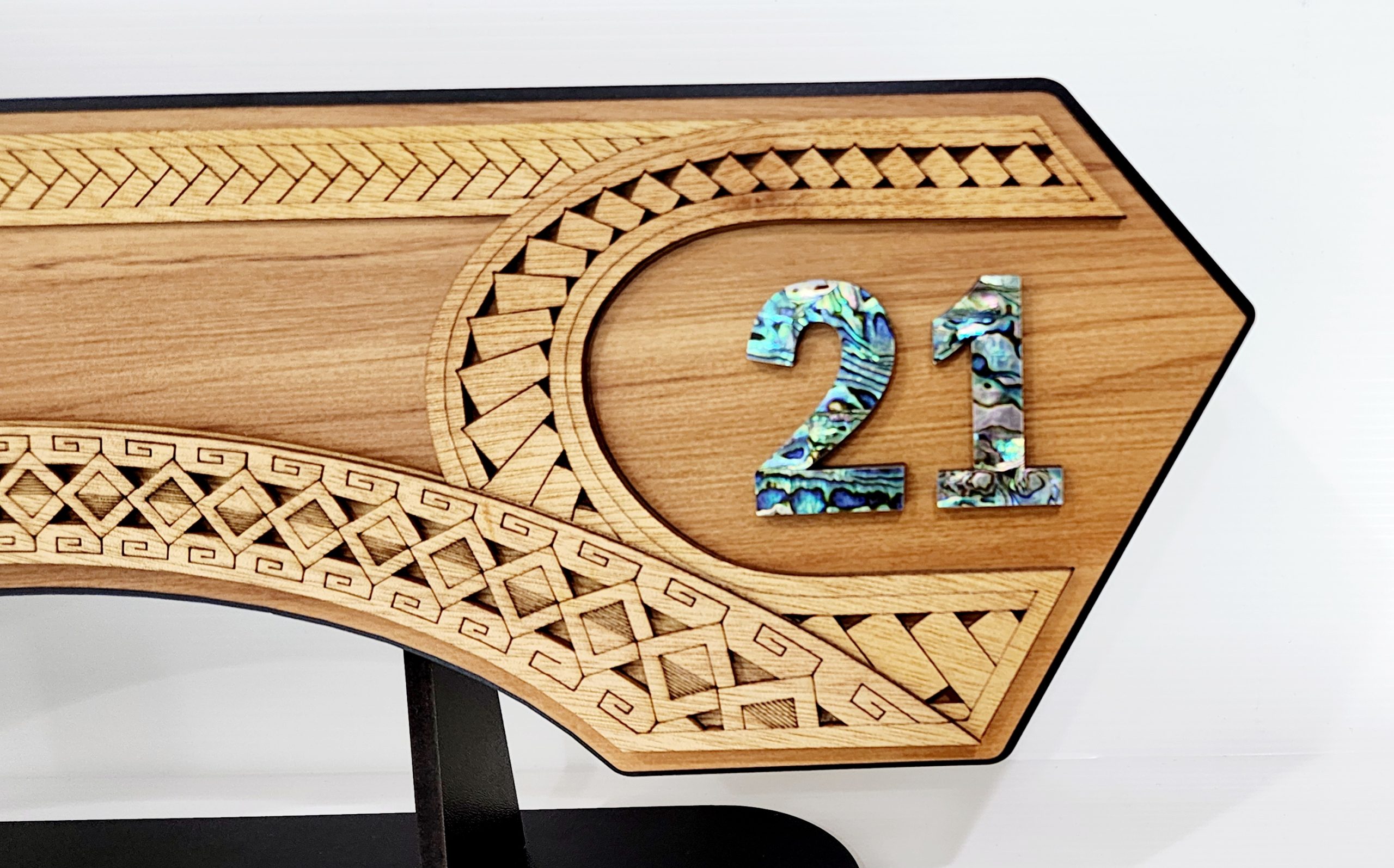 This is a contemporary artwork displaying many common Polynesian designs and artwork styles with intricate design and embellished with Mother of Pearl and Paua shell. The Polynesian 21st Celebration Key is crafted from?recycled Native New Zealand Rimu veneerboard, medium density fibreboard (mdf) and Gaboon veneer plywood.