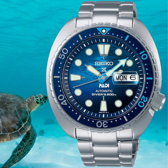 The SRPK01K1 PADI Special Edition “THE GREAT BLUE” professional diving watch is equipped with the 4R36 calibre, which offers a power reserve of approximately 41 hours. This model has a stainless steel case and bracelet with a scratch-resistant coating that gives it excellent robustness, as well as a unidirectional rotating bezel. It is water-resistant to 200 metres.