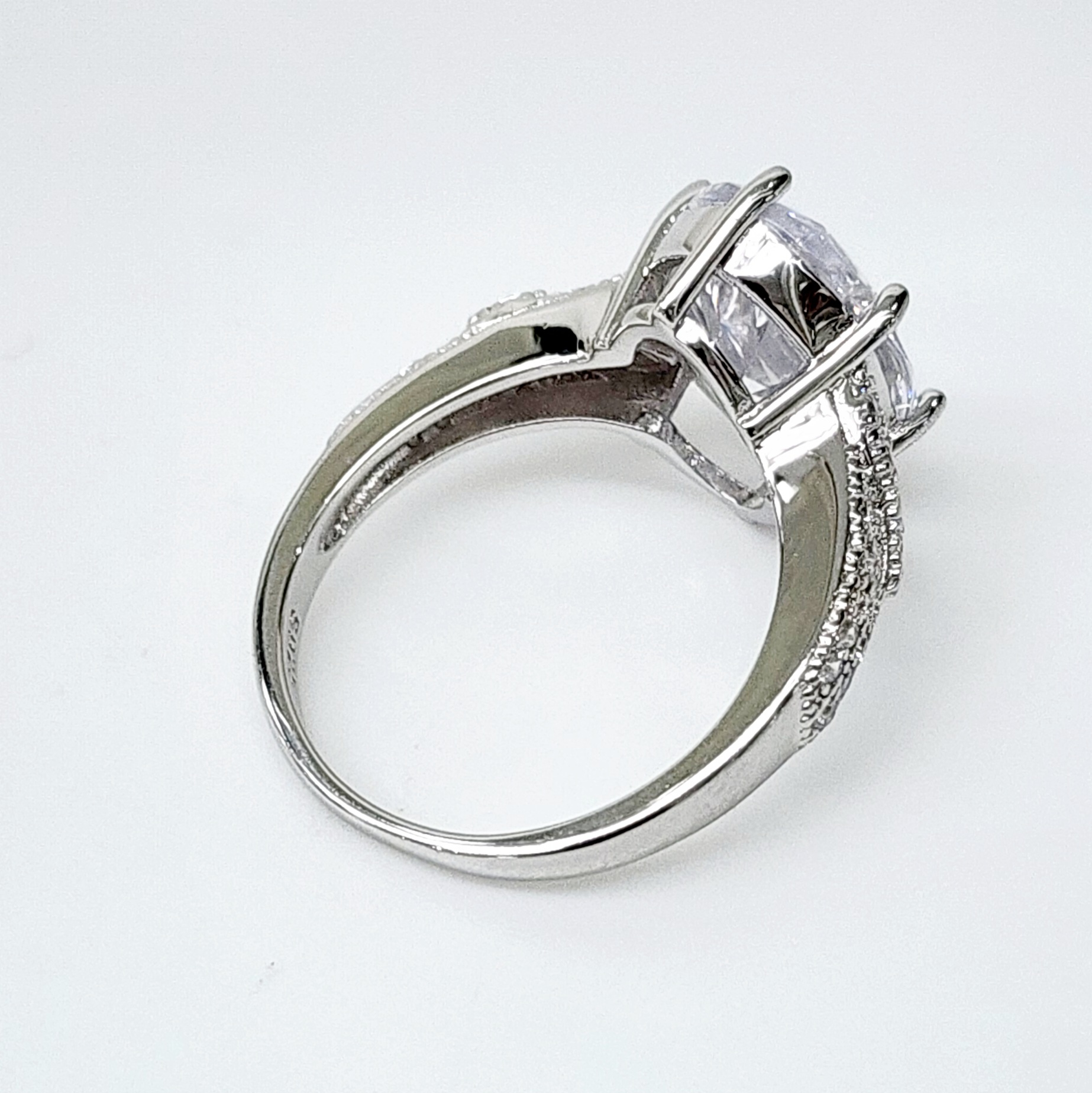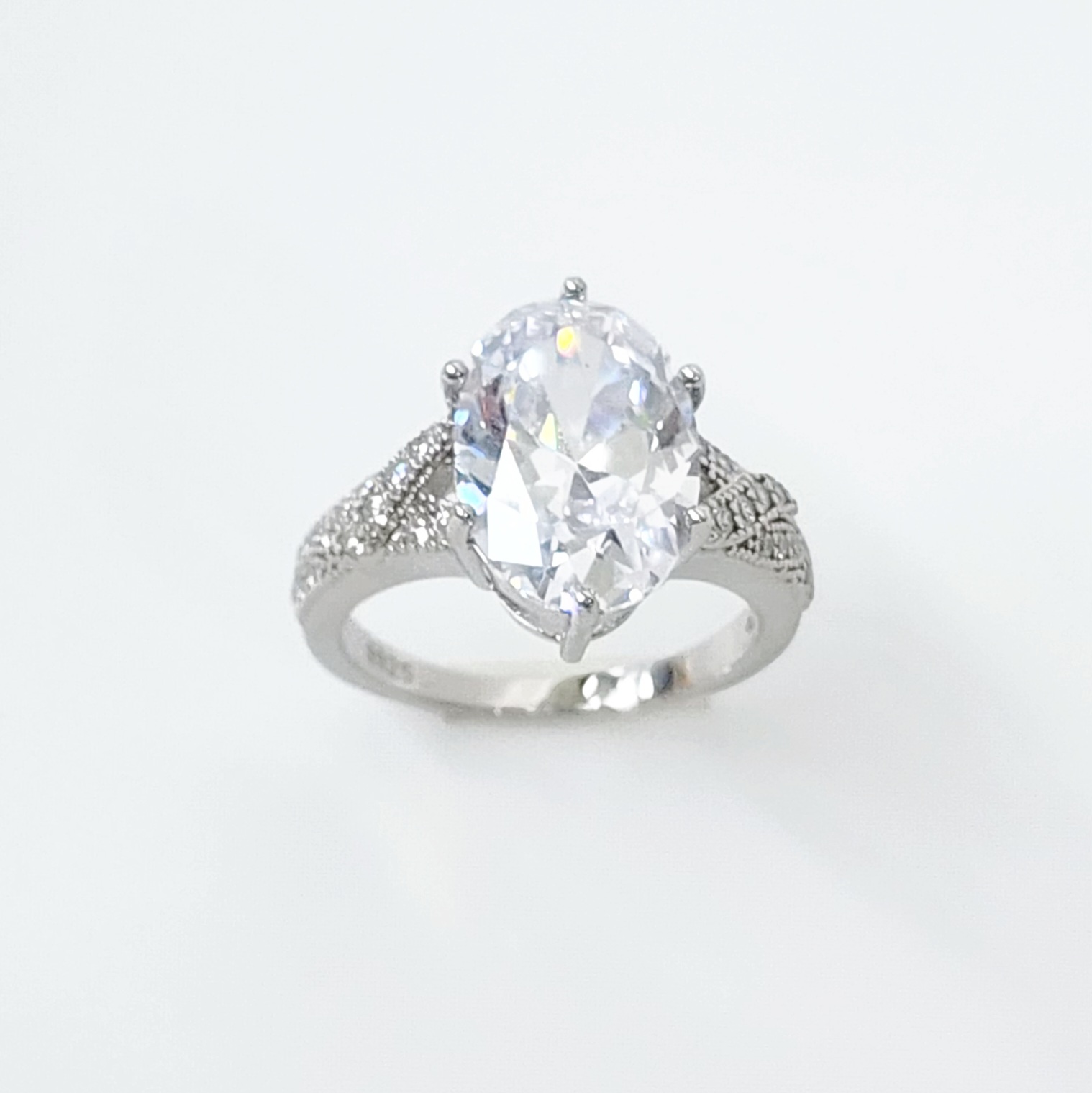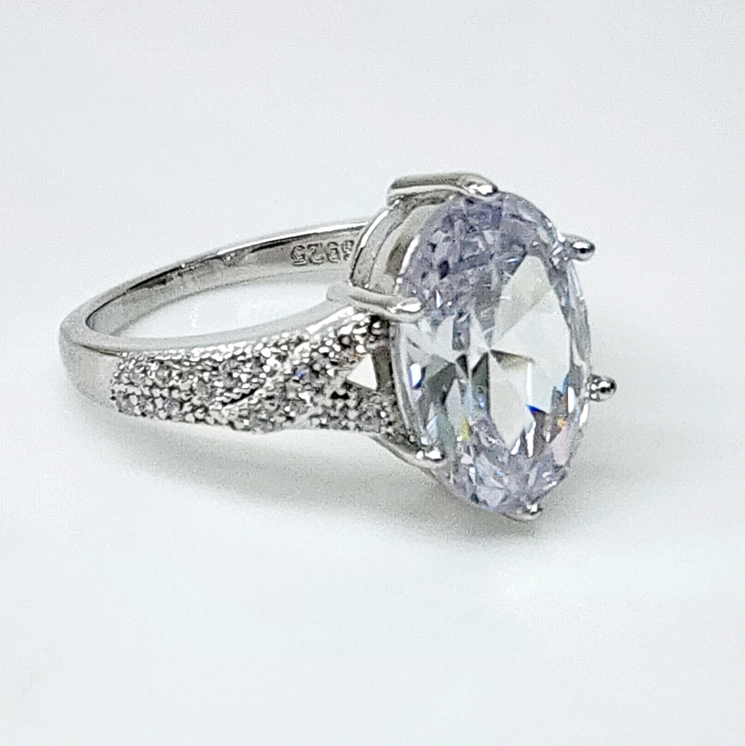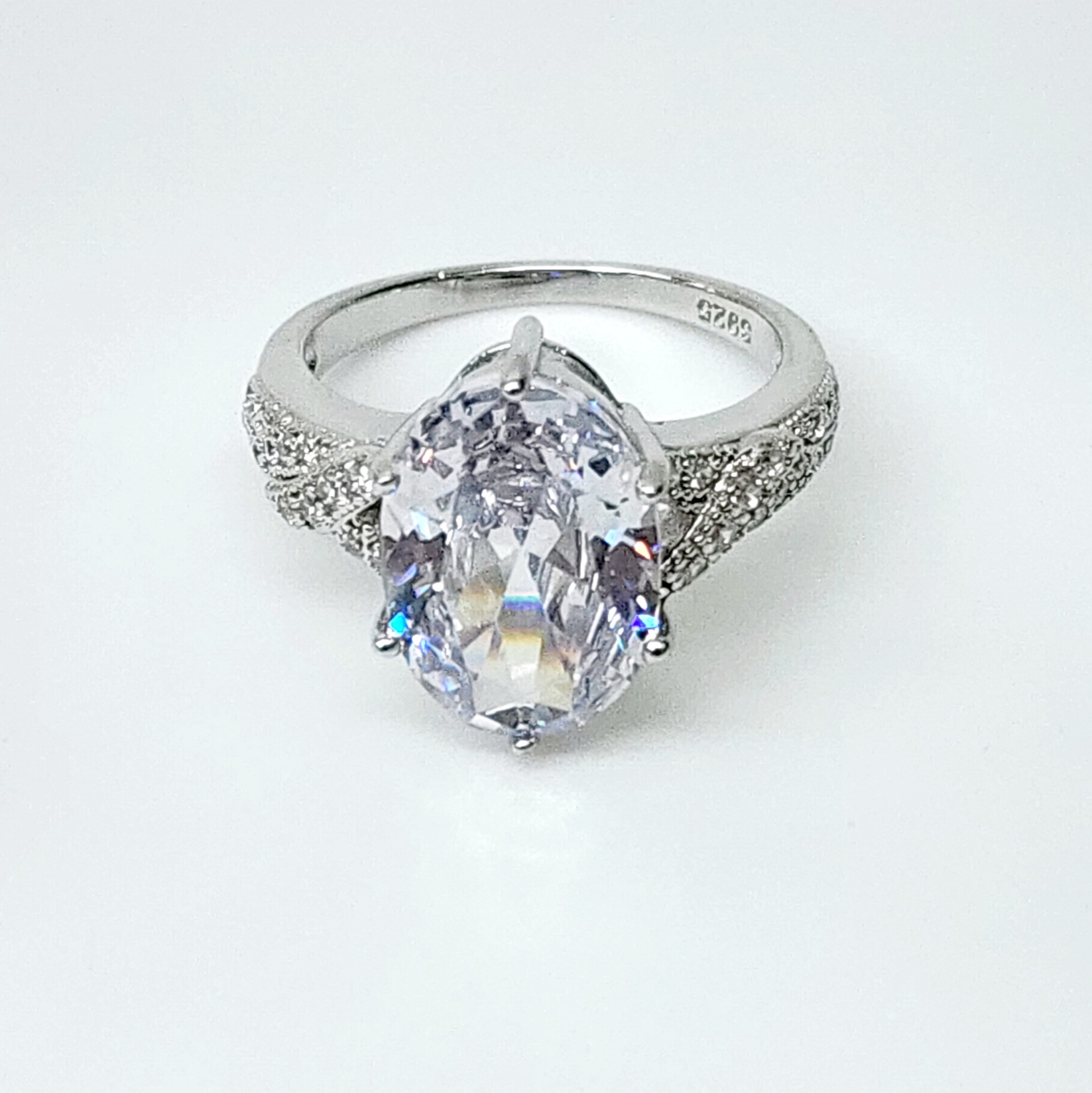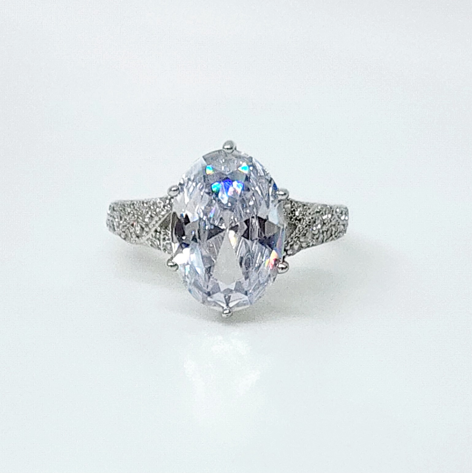 The engagement ring features a striking design with a large, eye-catching 14mm x 10mm oval center stone, set in a secure six-claw setting, which ensures the stone stays firmly in place while allowing ample light to pass through, enhancing its sparkle. The band is crafted from premium sterling silver, offering a timeless, elegant finish that complements the center stone beautifully.