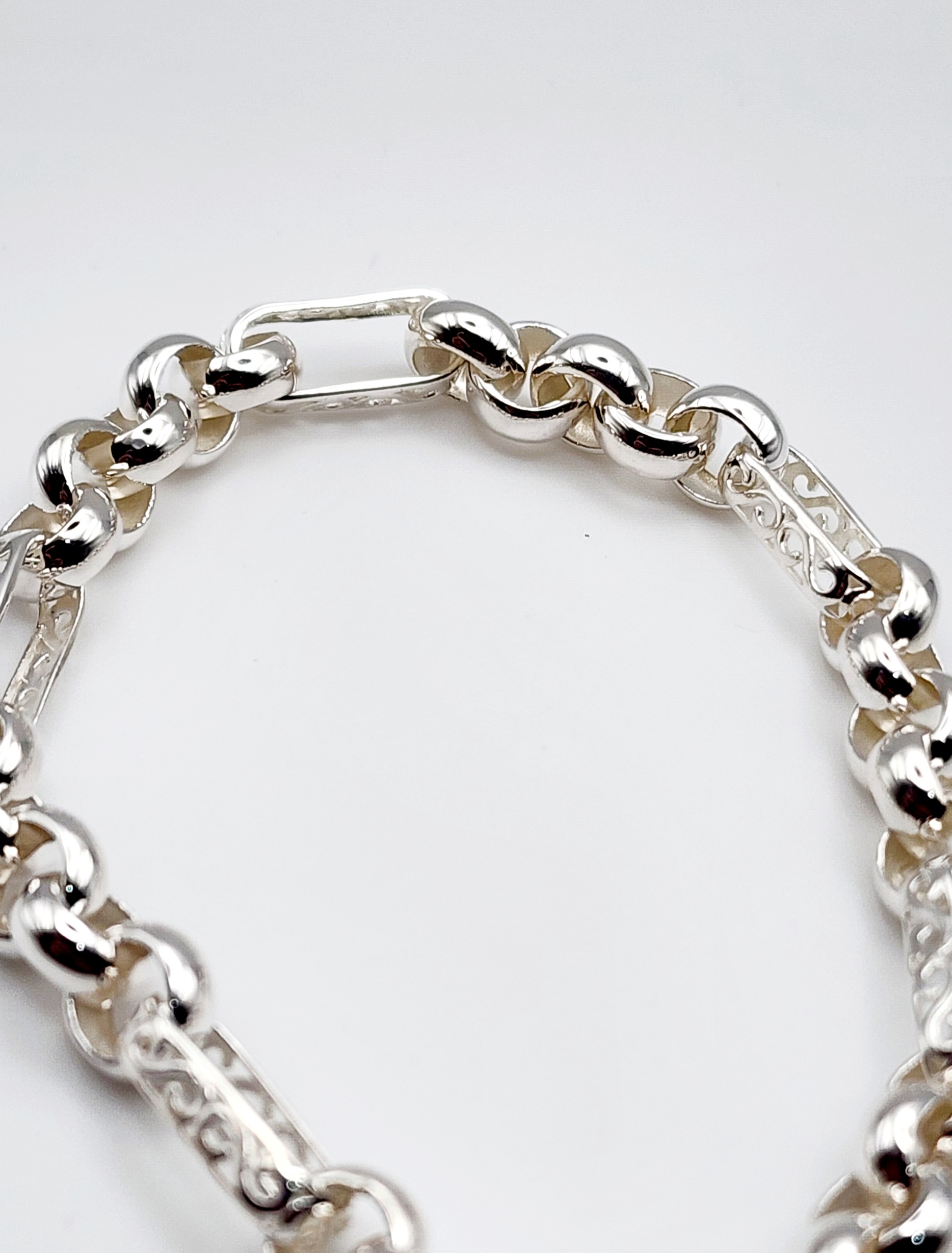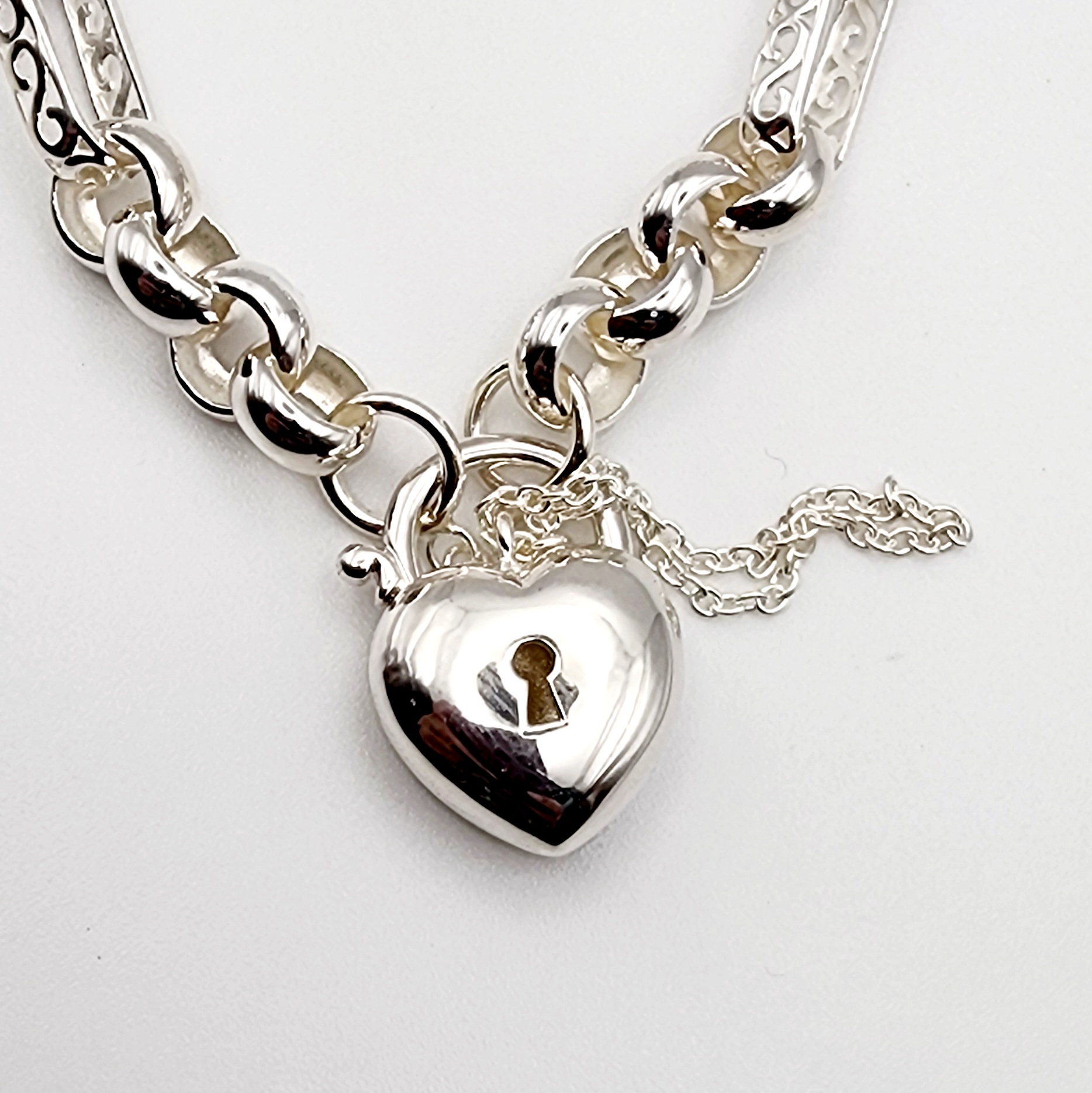 Sterling silver Figaro-style belcher link bracelet featuring a puff heart padlock charm. The puff heart padlock measures 16mm in width, adding an elegant and timeless centerpiece. The bracelet consists of alternating links: solid round belcher links measuring 8mm and oval filigree links that are 14mm in length, both with a width of 3.5mm. Designed for security and style, the bracelet is equipped with a functional safety chain for added peace of mind.