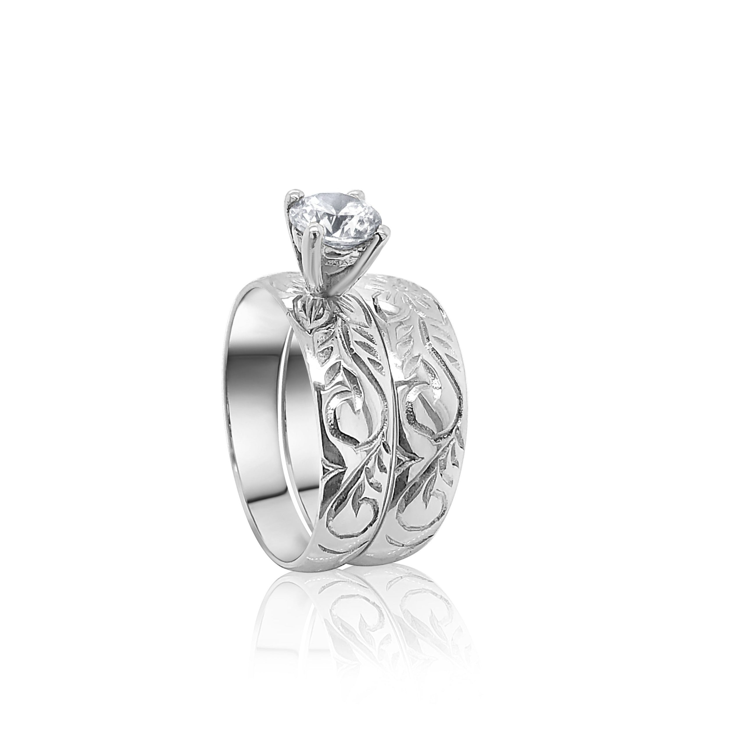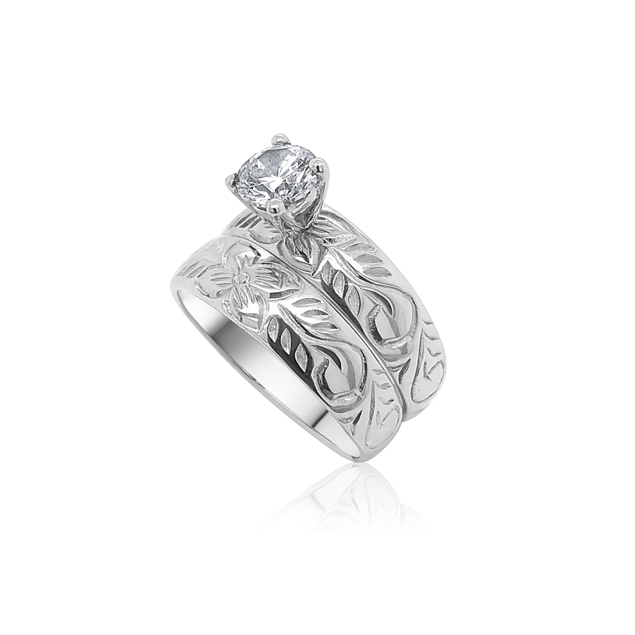 Sterling Silver?2 Piece Hawaiian Design Wedding Ring Set With Cubic Zirconia Setting