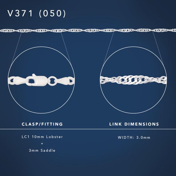 This Sterling Silver V371 Singapore Twist Chain is crafted from premium 925 sterling silver and features the classic Singapore spiral-link pattern known for its beautiful shine and fluid movement. The V371 model is slightly thicker than ultra-fine gauges, making it an excellent option for customers who want a delicate look with added strength and durability.