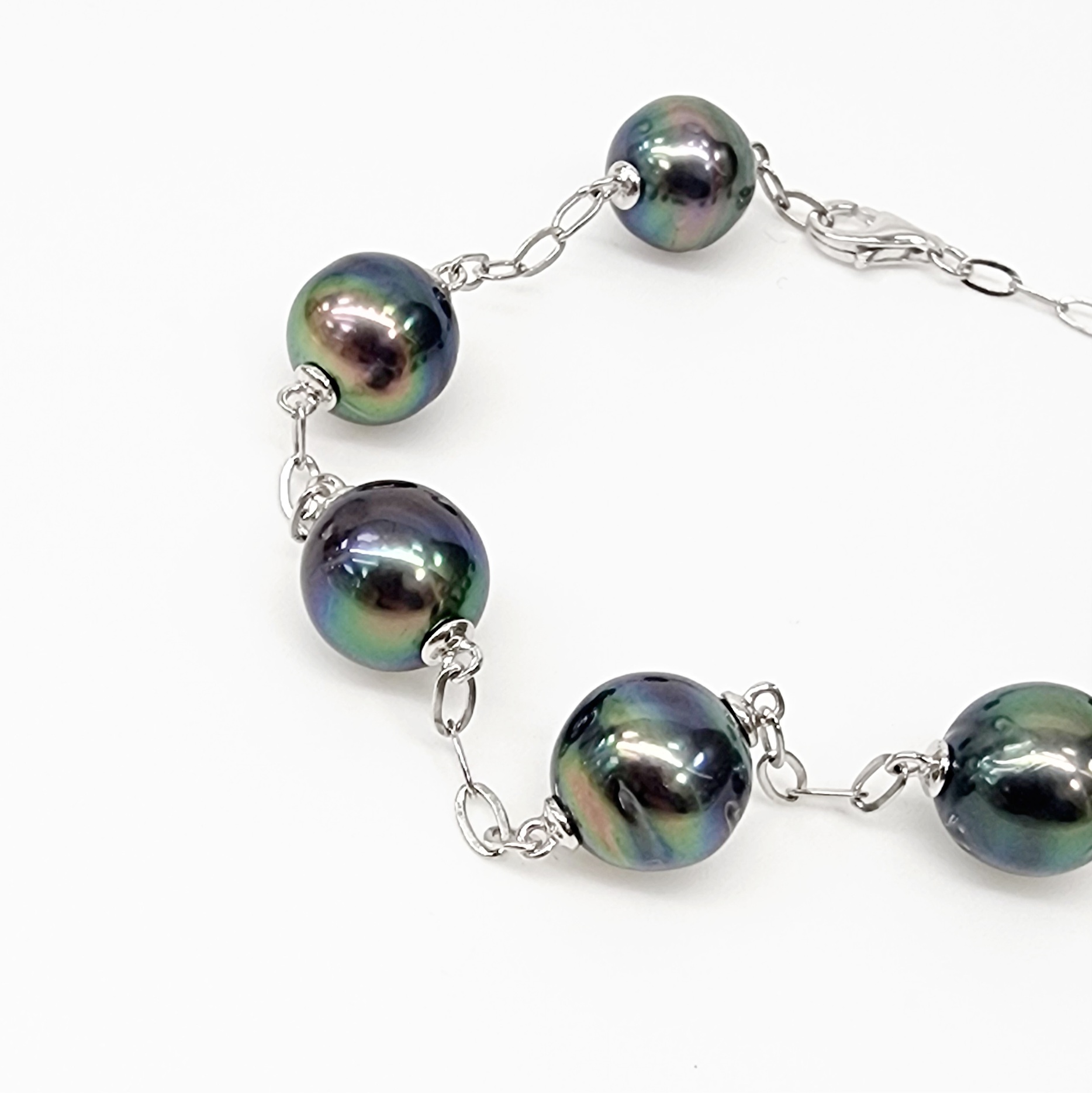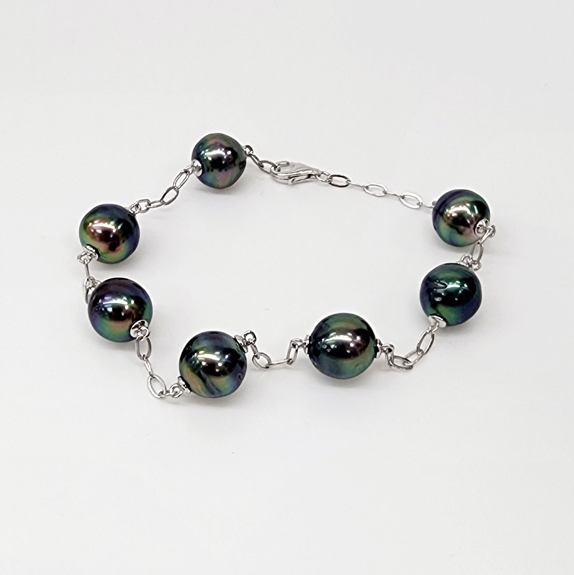 This stunning 21cm sterling silver bracelet showcases seven exquisite Tahitian black pearls, each measuring 9.5mm in diameter. The pearls are elegantly spaced along a durable and stylish sterling silver oval cable link chain, which provides both strength and a refined aesthetic. Secured with a reliable parrot clasp, this bracelet offers a seamless blend of sophistication and timeless beauty, making it a perfect accessory for any occasion.