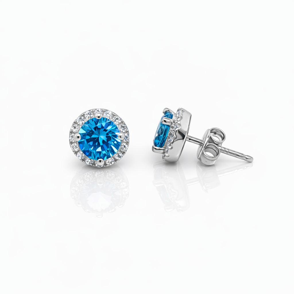 Each earring features a vivid 5.60mm round blue cubic zirconia centre stone, secured in a classic four-claw setting that maximises brilliance and allows light to reflect beautifully through the stone. Surrounding the centre stone is a delicate halo of clear cubic zirconia stones, creating a striking contrast and enhancing the overall sparkle of the design.