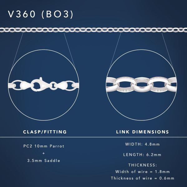 The BO3 weight/grade provides a balanced medium-strength build — perfect for wearing on its own or pairing with small to medium pendants, charms or lockets. Its evenly spaced oval links offer excellent durability while maintaining a lightweight, comfortable feel for daily wear.