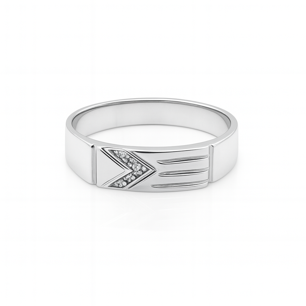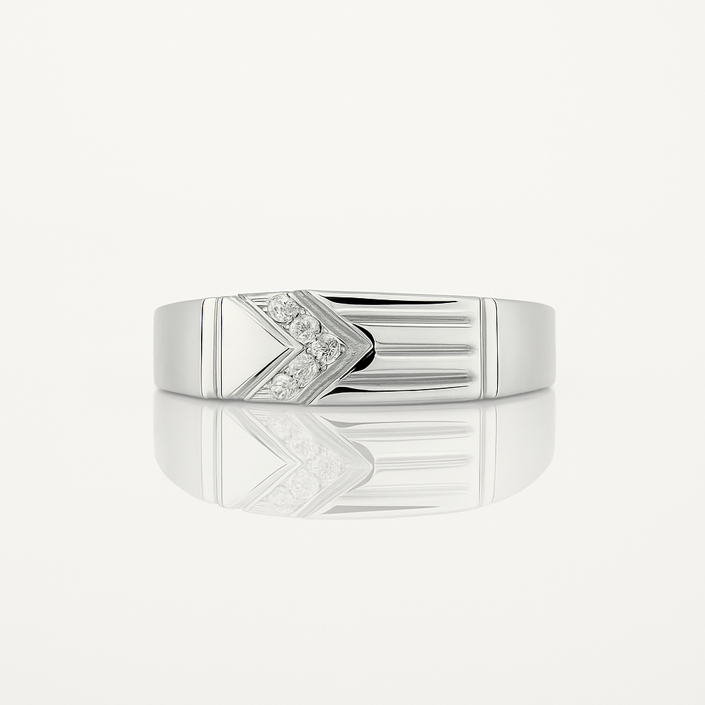 The top of the band measures 5.80mm wide, providing a balanced presence that is comfortable for daily wear. The chevron section is set with brilliant cubic zirconia, adding eye-catching shimmer while maintaining an elegant minimalist feel. Grooved detailing across the top creates texture and depth, giving the ring a refined yet distinctive character.