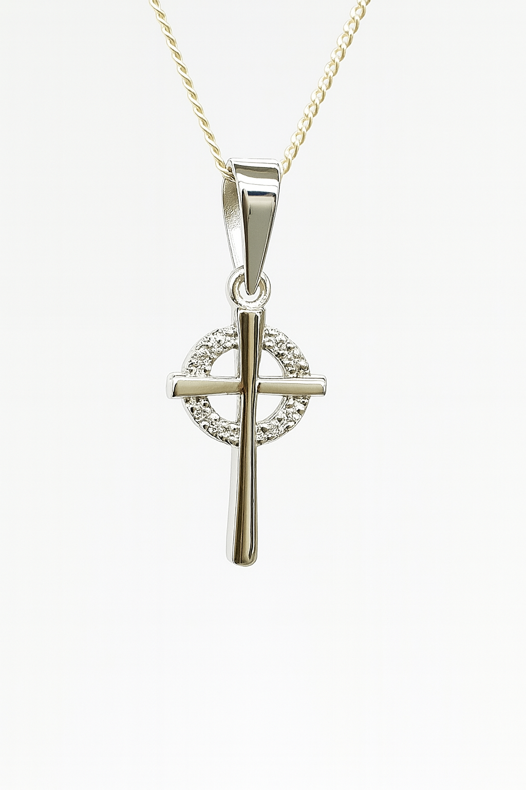 This elegant sterling silver cross pendant features a delicate circular halo design beautifully set with sparkling cubic zirconia stones. The polished cross sits gracefully at the centre, creating a perfect balance of shine and sophistication. Measuring 10mm wide by 22mm high including the bale, this pendant comes complete with a complimentary sterling silver chain — a refined and meaningful accessory for any occasion.
