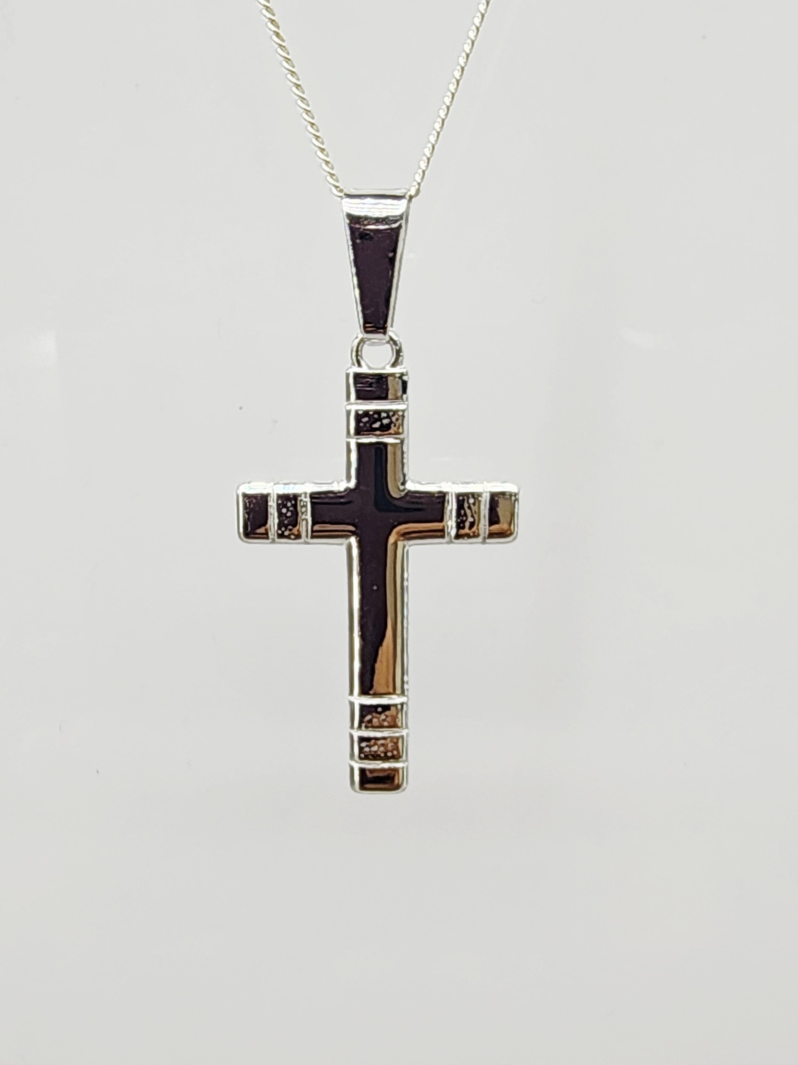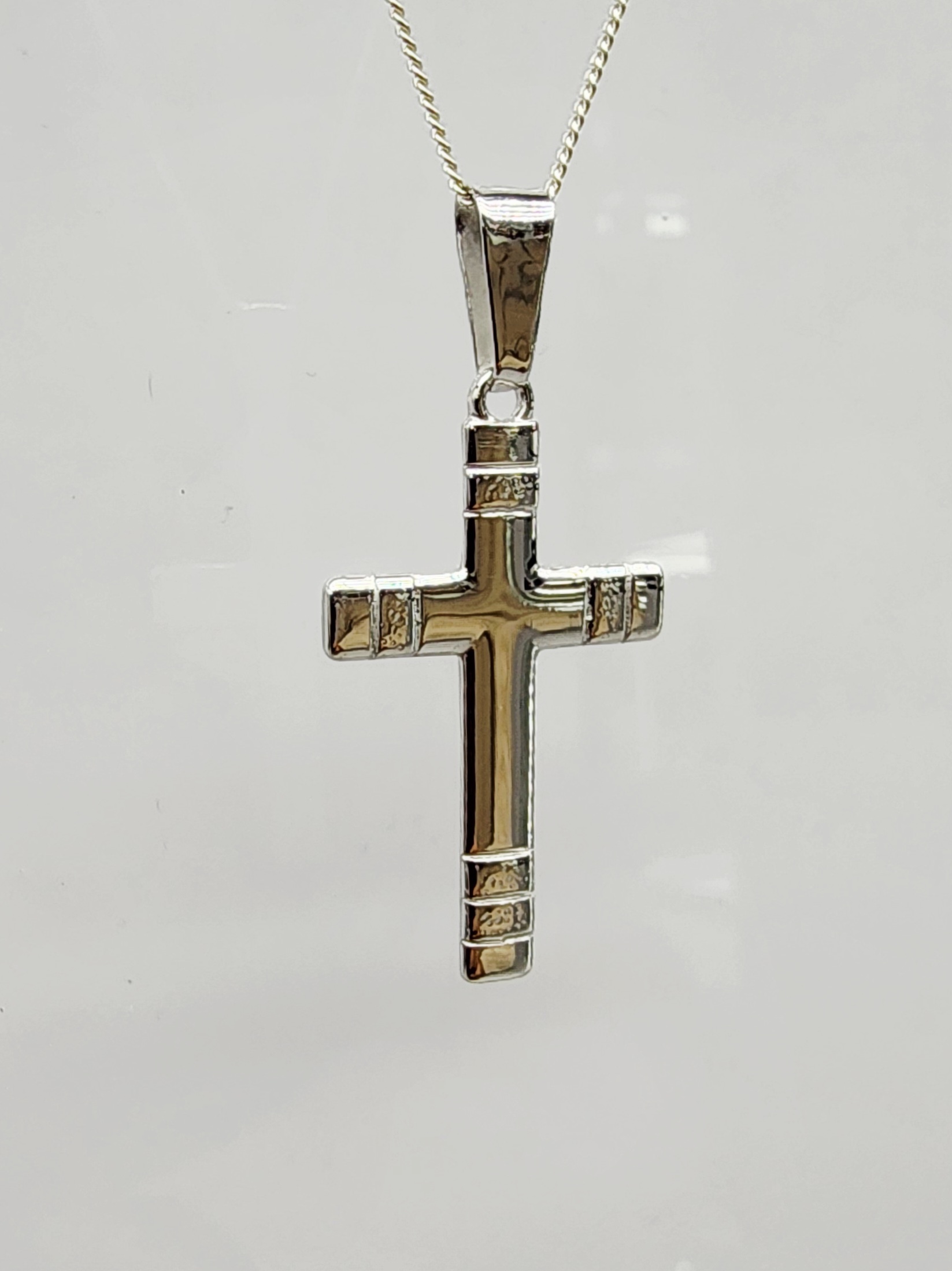 This sterling silver cross pendant features a bold and modern design with intricate grooved detailing on each end of the cross. Finished to a high polish, it reflects light beautifully and offers a refined look suitable for everyday wear or special occasions. Measuring 20mm wide by 43mm high including the bale, it comes complete with a complimentary sterling silver chain — a timeless piece of faith and style.
