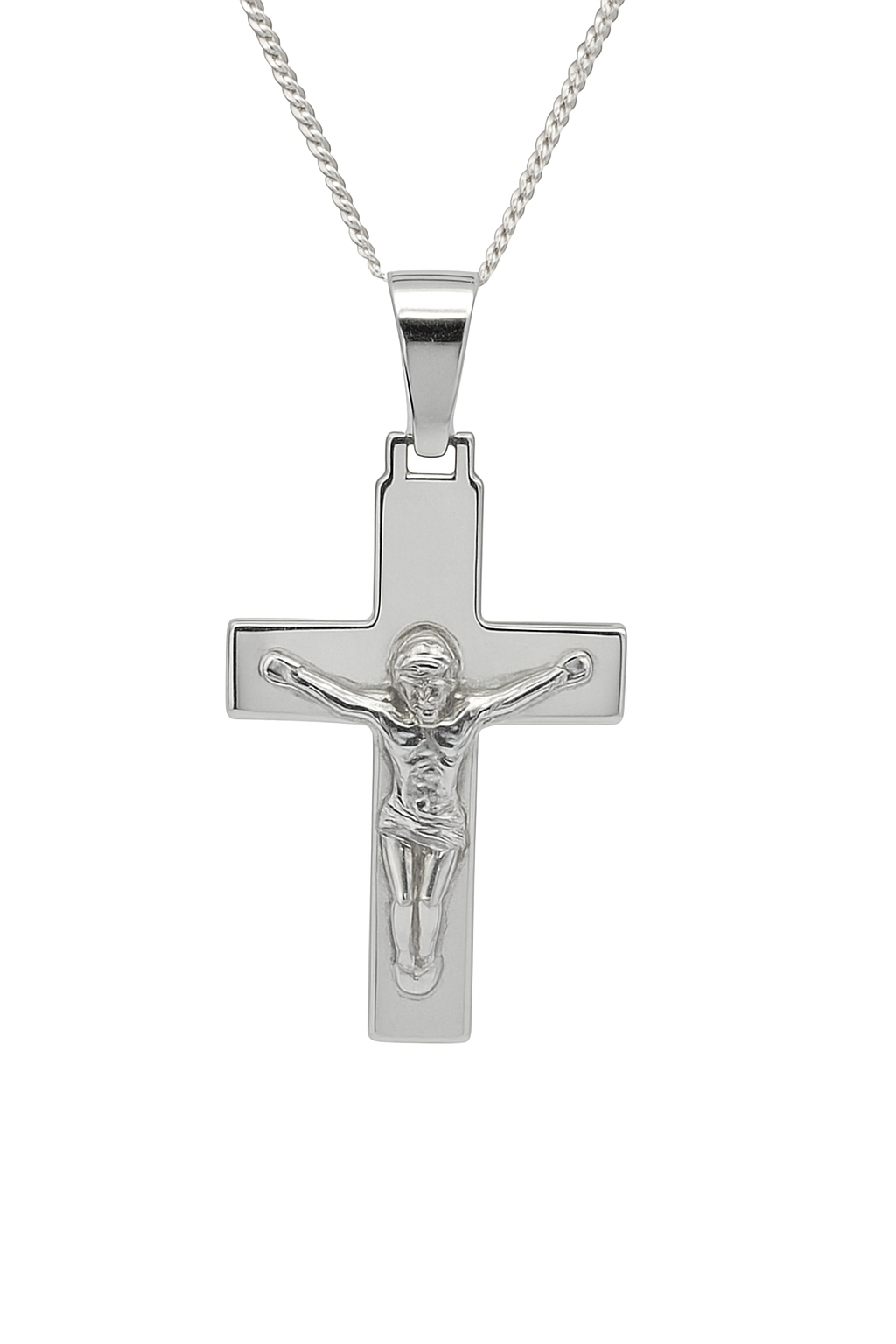 This elegant sterling silver crucifix pendant features a finely detailed figure of Jesus on a smooth, high-polished silver cross. Expertly crafted for a timeless and meaningful look, it reflects light beautifully and carries a sense of faith and devotion. Measuring 23mm wide by 45mm high including the bale, this pendant comes complete with a complimentary sterling silver chain — a perfect piece for everyday wear or as a thoughtful gift.