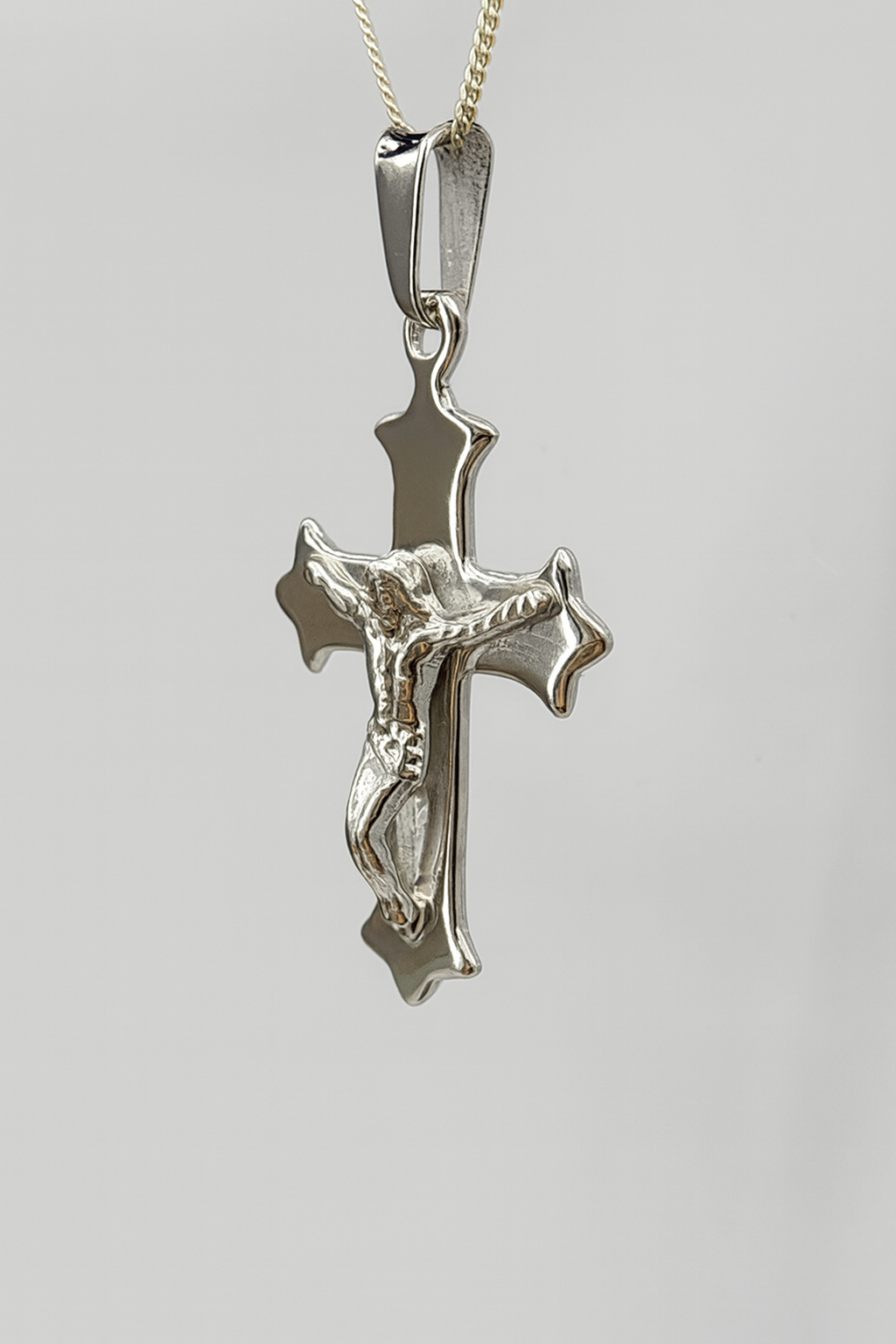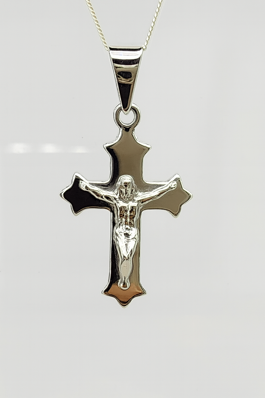 This elegant crucifix pendant is beautifully crafted in solid sterling silver. It features a finely detailed figure of Jesus on a polished cross with softly contoured edges and a reflective high-shine finish. The cross has a distinctive flared tip design, giving it a timeless and classic look.