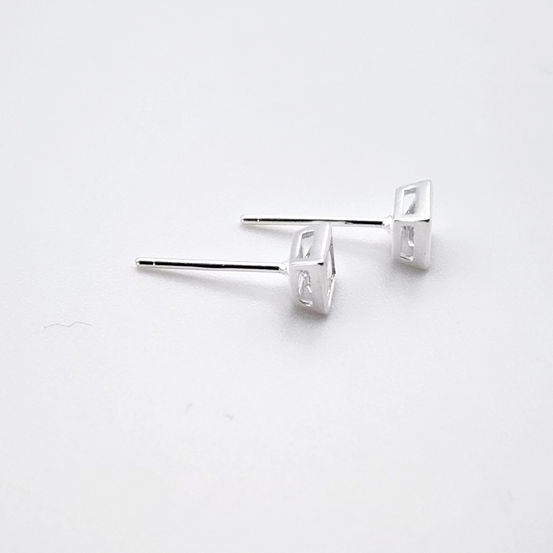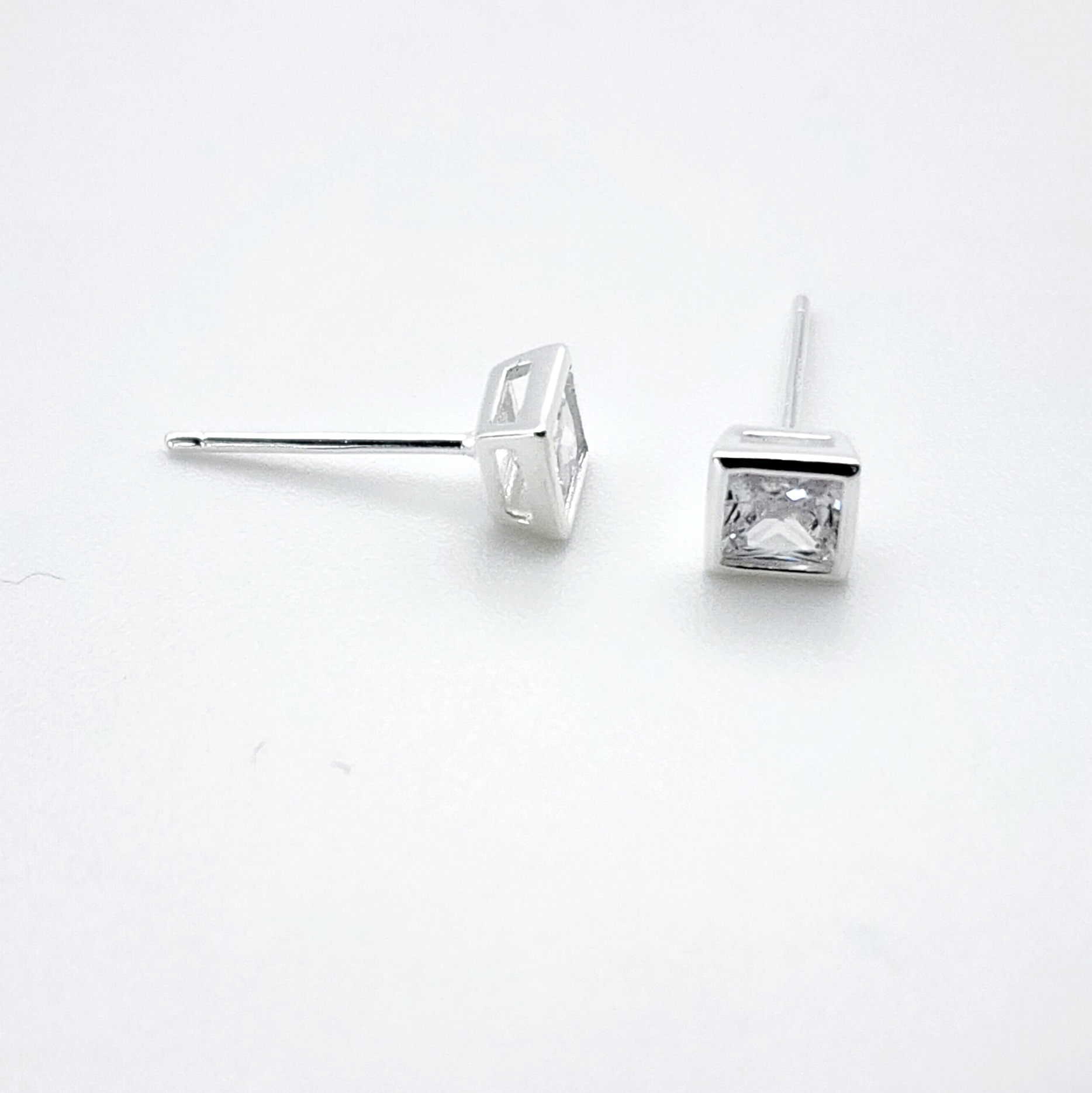A perfect pair of earrings for any woman! Simple and easy, these earrings are definitely the finishing touch to any outfit, day or night. They feature clear 4mm princess cut cubic zirconias rubover set in rhodium plated sterling silver. The earrings are secured with friction backs and push butterfly backings.