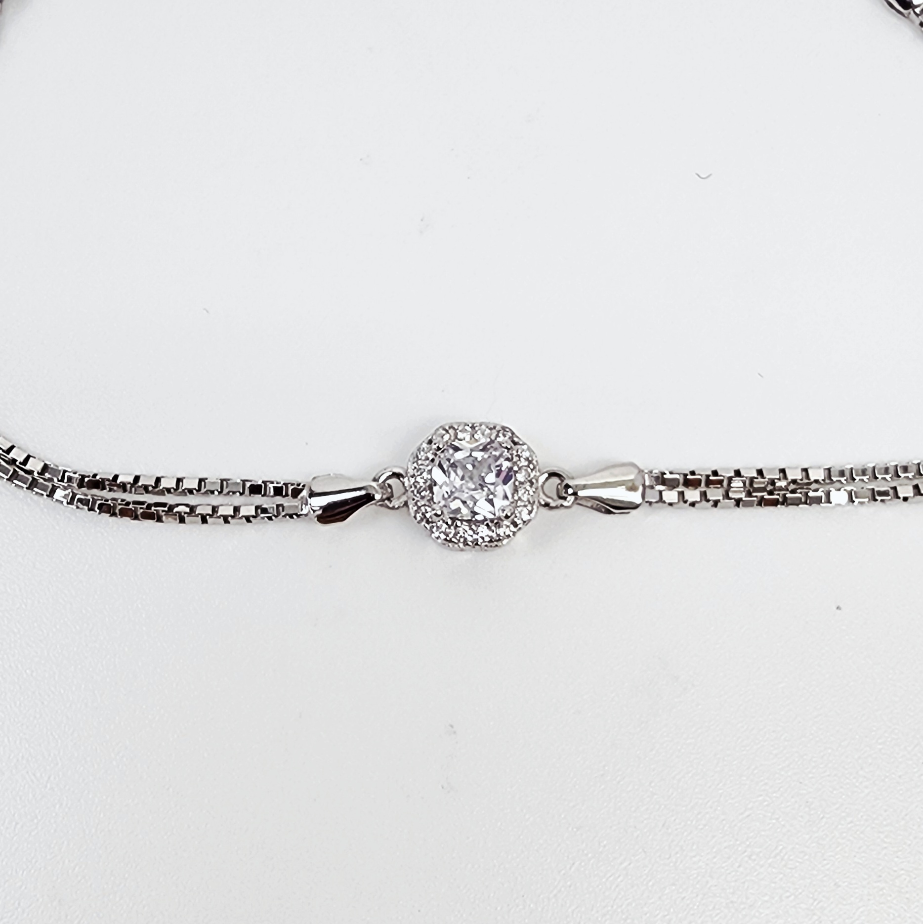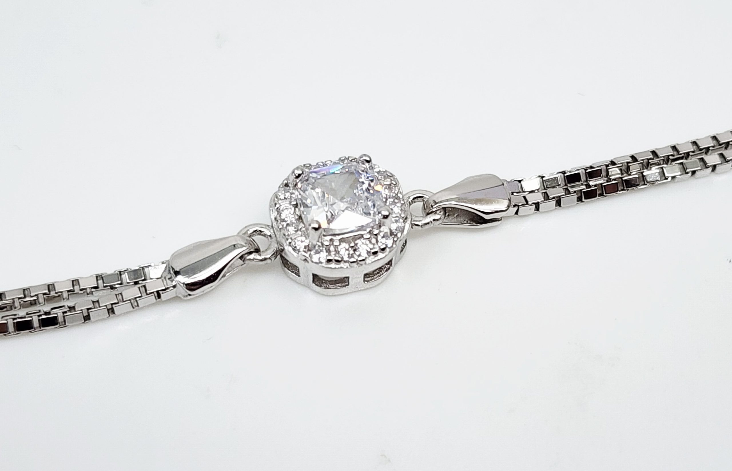 This elegant sterling silver double box chain bracelet is designed with timeless sparkle and sophistication. At its centre sits a dazzling 5mm square-cut cubic zirconia, securely held in a classic four-claw setting. Surrounding the centrepiece, a ring of smaller round brilliant-cut cubic zirconias, each in their own claw setting, creates a striking halo design that amplifies the brilliance and light reflection of the main stone.