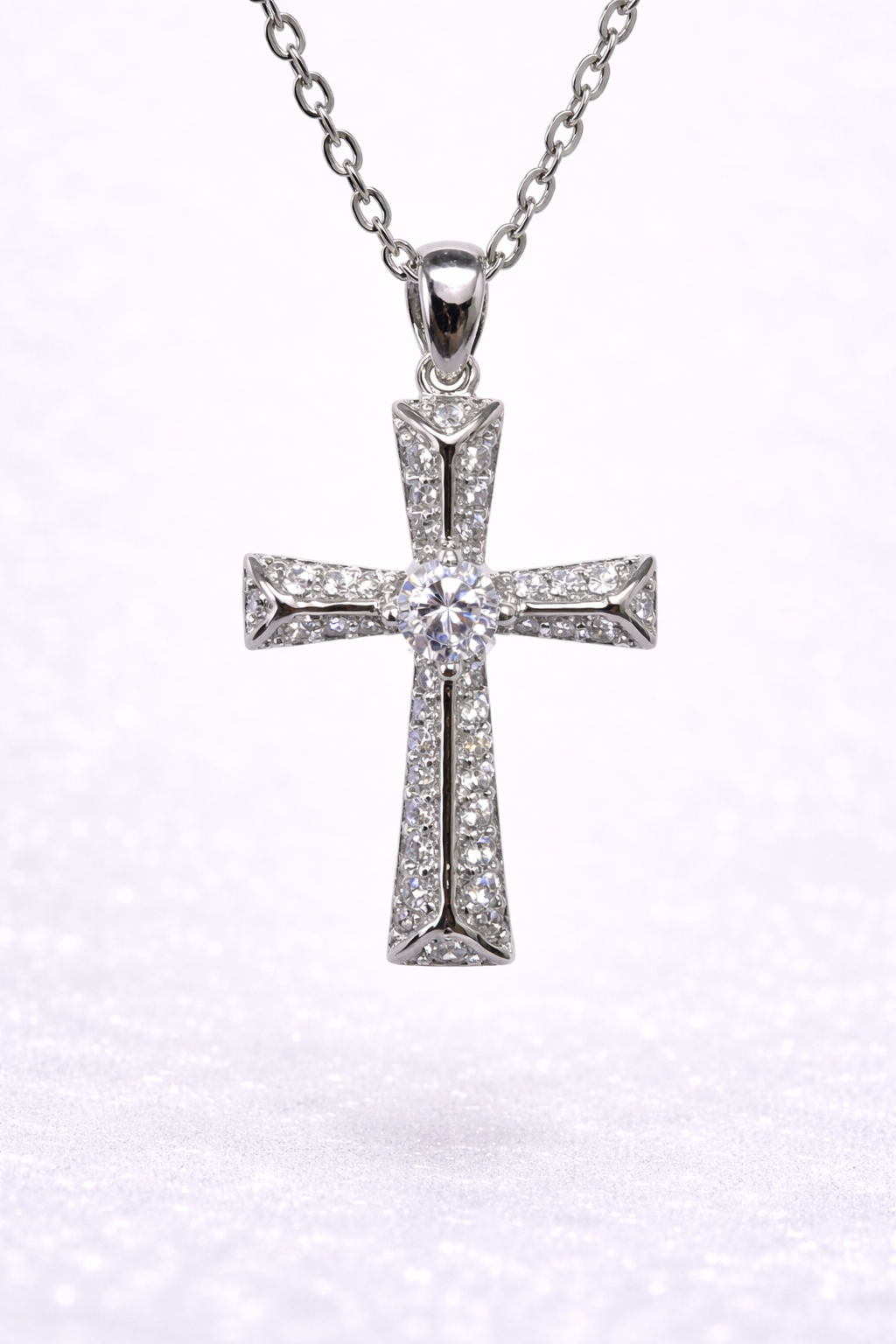 The cross features a slightly tapered and structured profile, giving it depth and dimension while preserving a clean and balanced silhouette.
