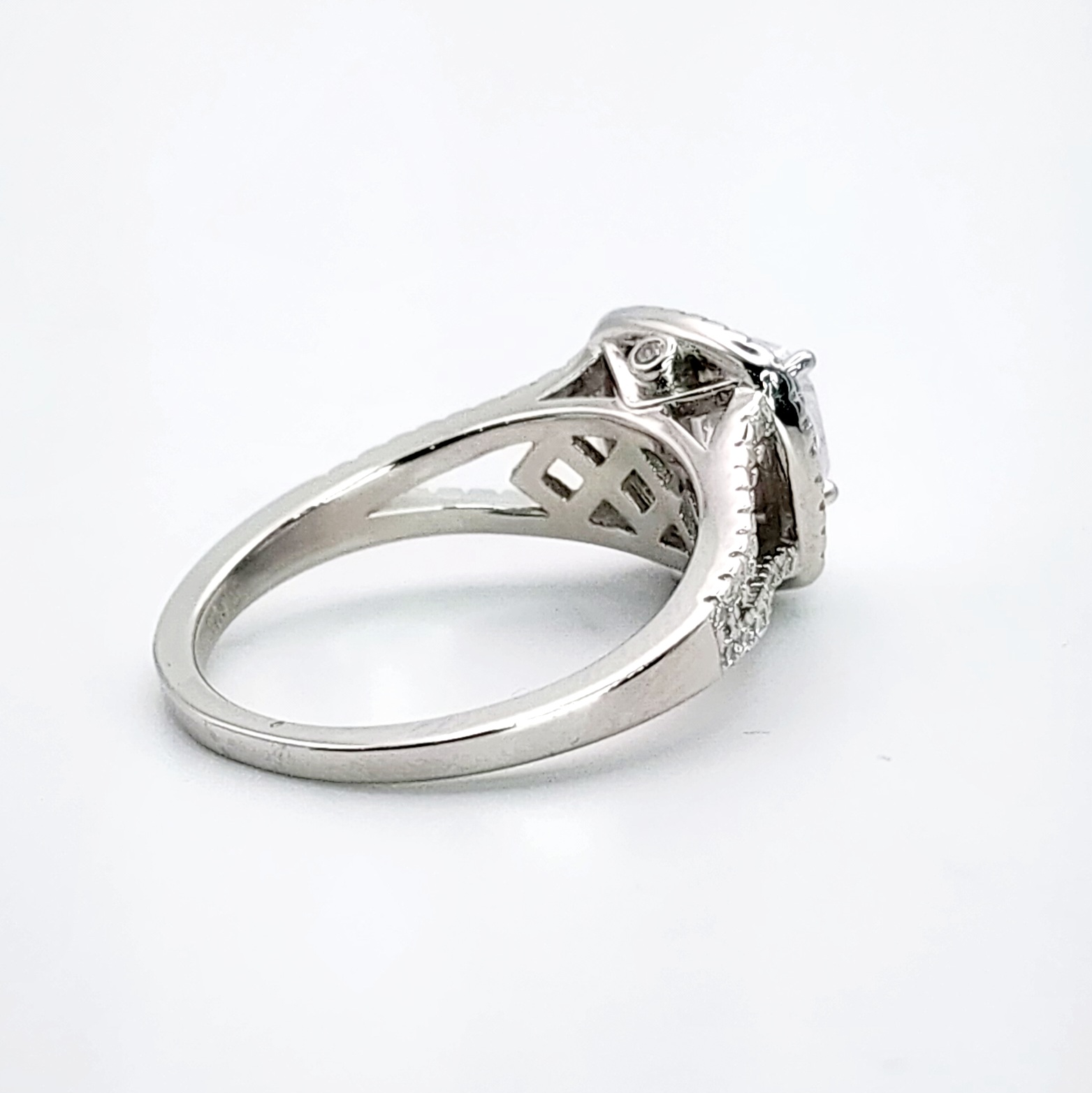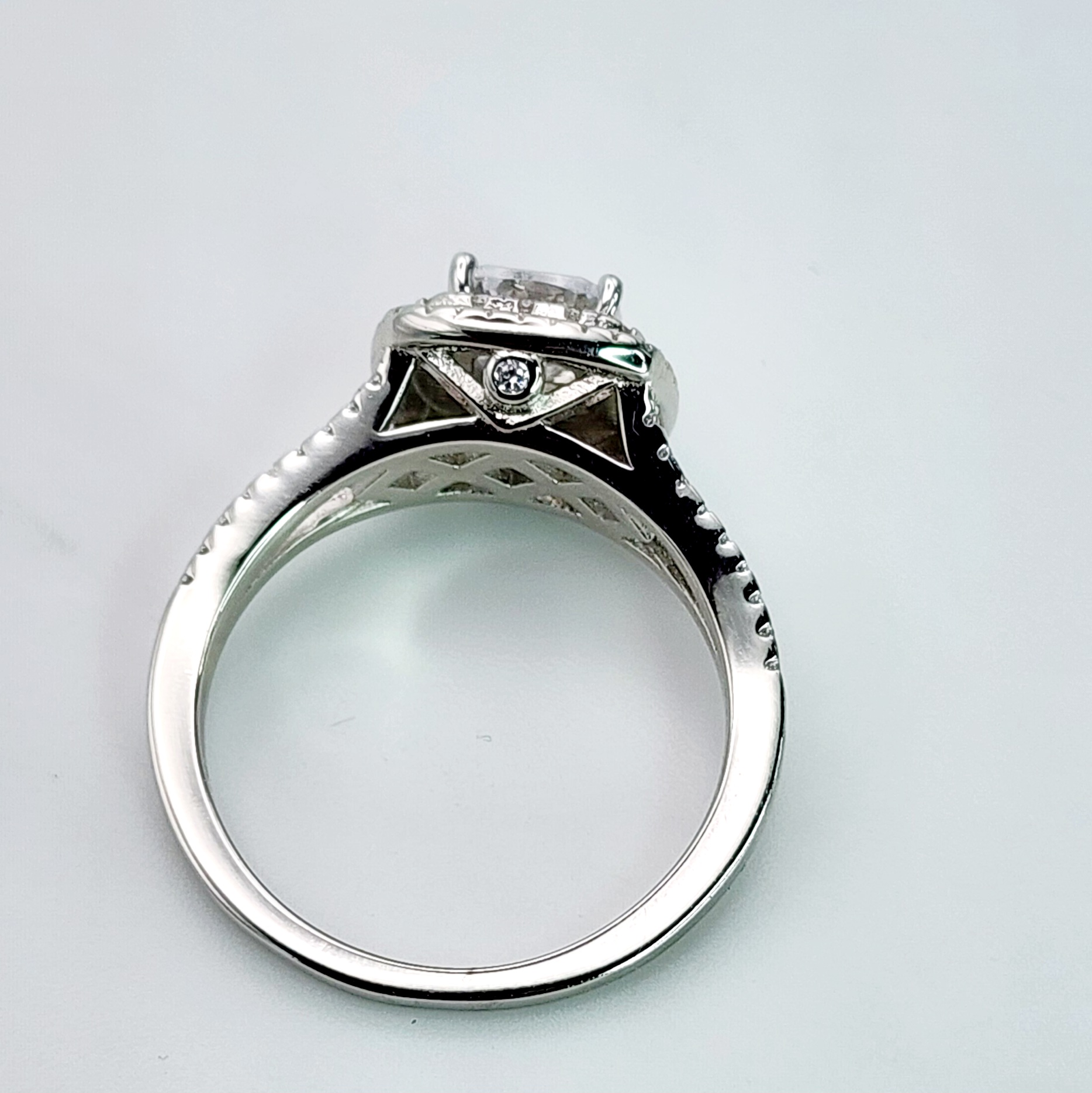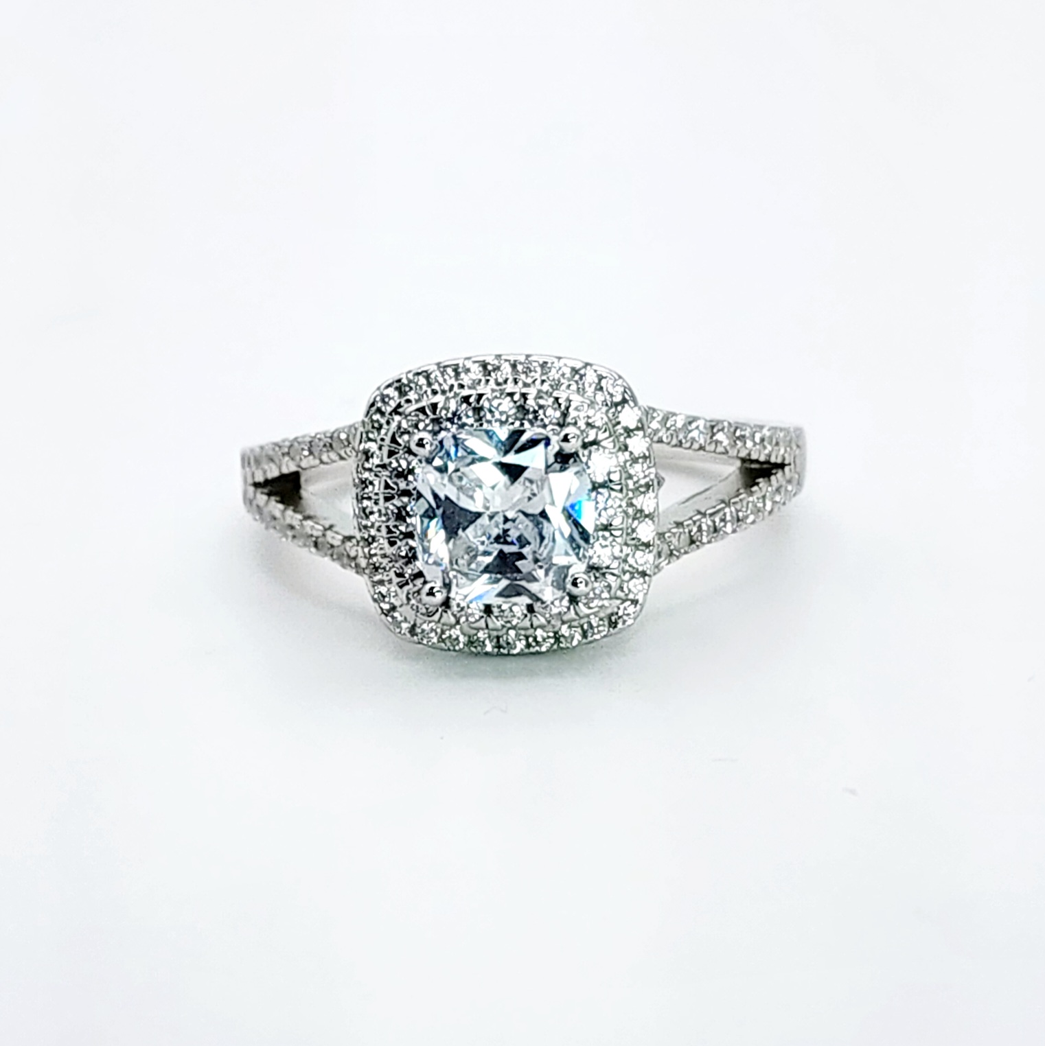 This beautiful cubic zirconia engagement/dress ring features round brilliant cut CZ in a double halo around the center stone, as well as round brilliant cut CZ’s down a split shank.