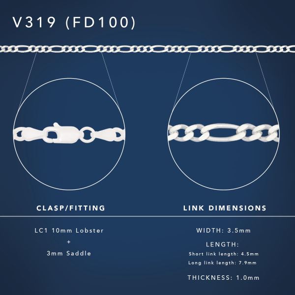 This premium Sterling Silver FD100 1/3 Figaro Diamond-Cut Chain is crafted from high-quality 925 sterling silver and features the classic 1/3 Figaro pattern — one elongated link followed by three shorter curb-style links. Each link is precision diamond-cut, creating reflective facets that give the chain exceptional sparkle and a crisp, polished finish.