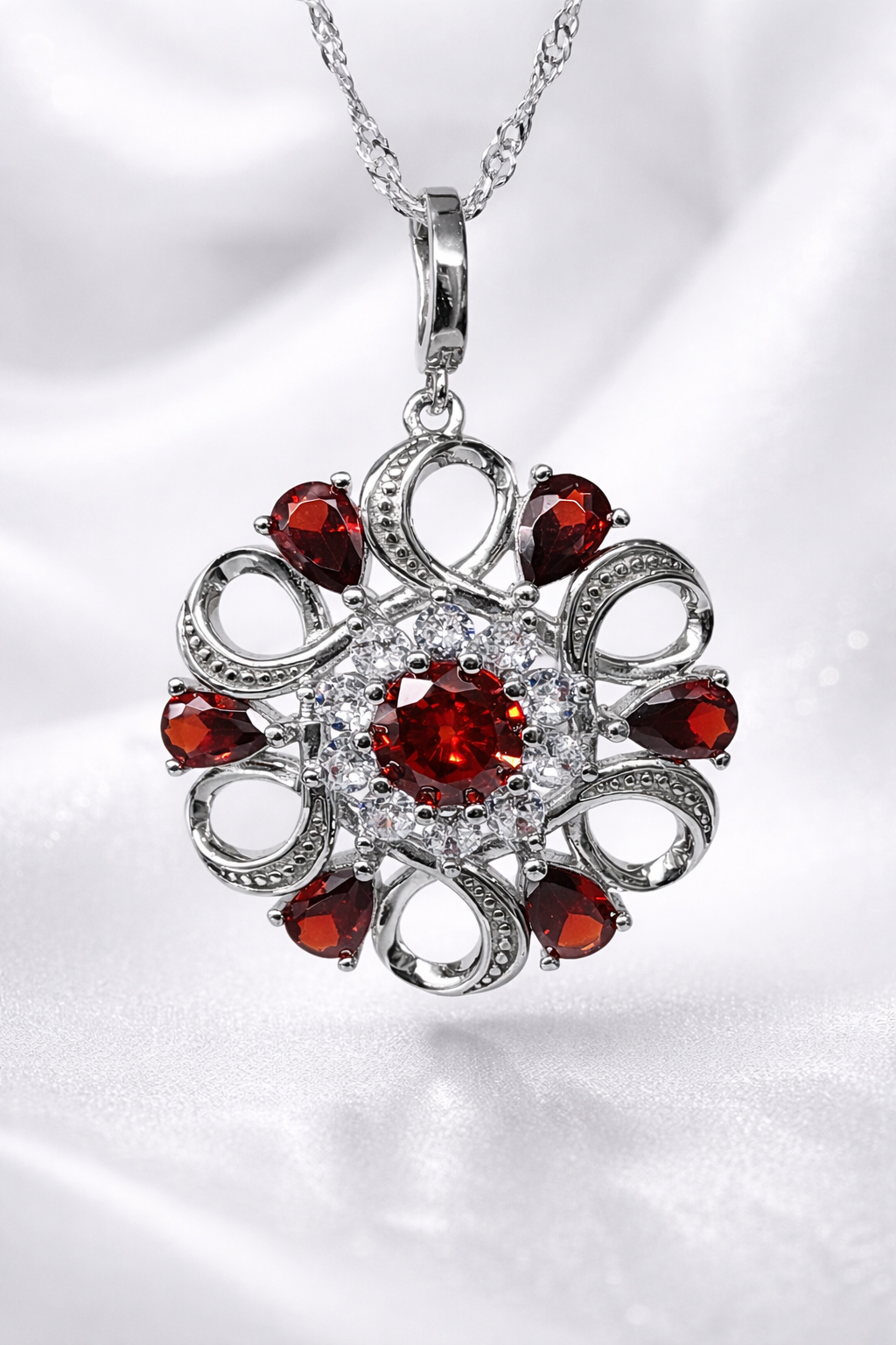 Make a bold yet elegant statement with this beautifully crafted sterling silver garnet and clear cubic zirconia pendant, designed in a timeless floral-inspired silhouette. This stunning piece showcases exceptional detail, brilliance, and depth, making it a perfect addition to any jewellery collection.