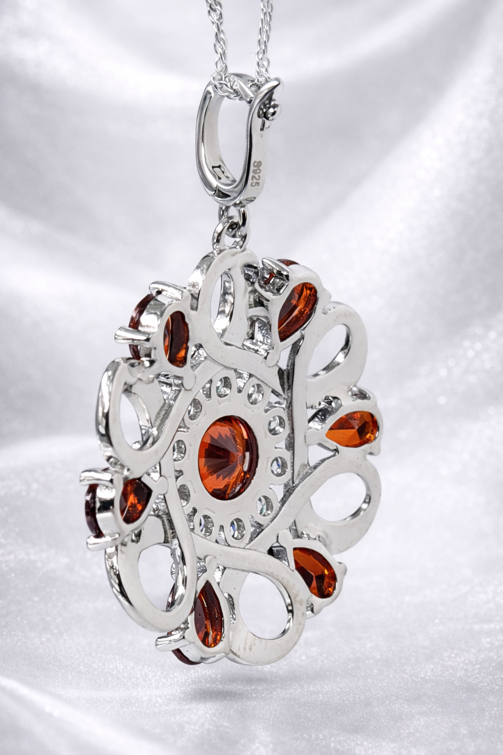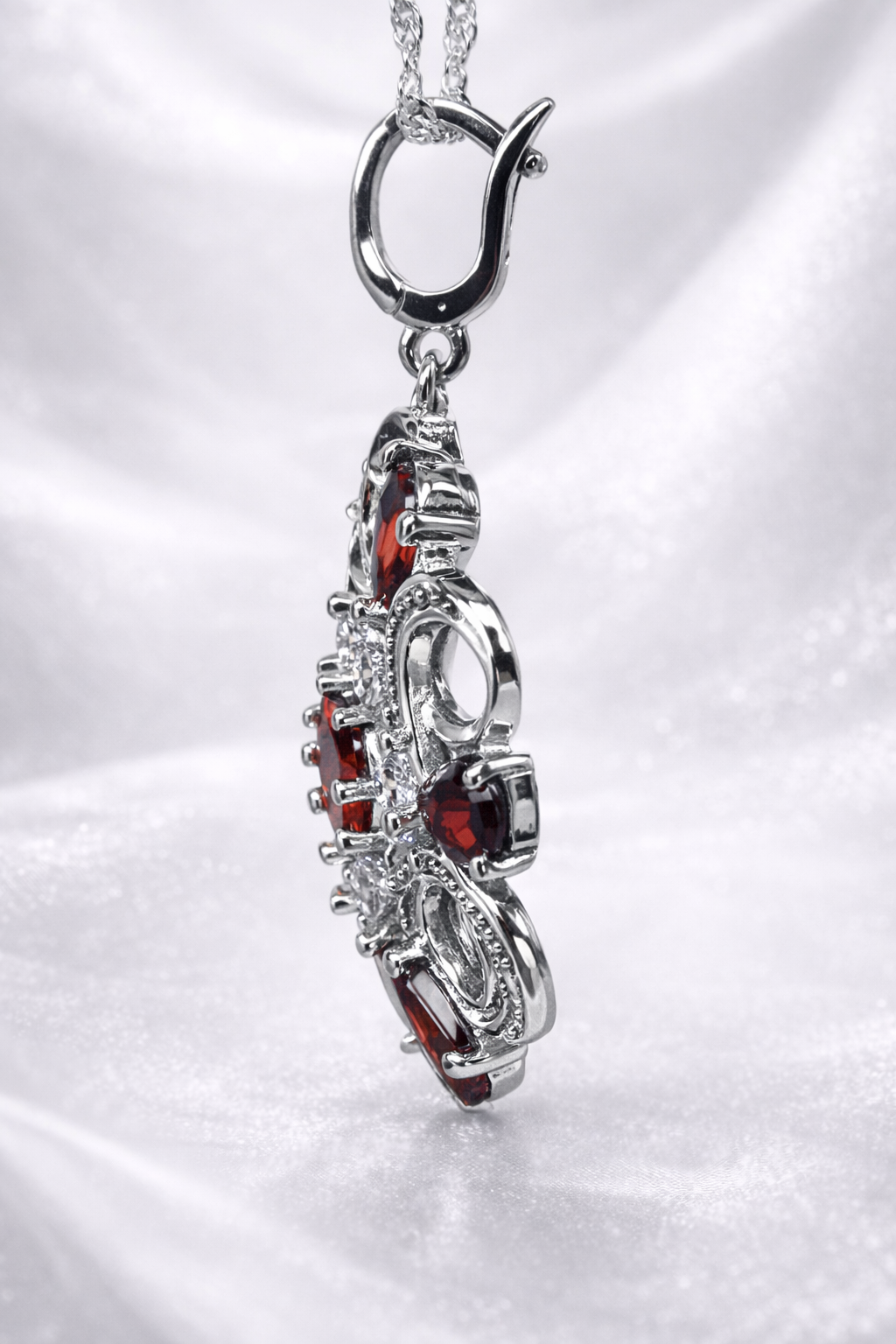 Crafted in high-polish sterling silver, the pendant offers a bright, reflective finish that enhances both the garnet tones and the brilliance of the clear CZ stones. The detailed craftsmanship is visible from every angle, including the side and back profiles, showcasing quality and durability.