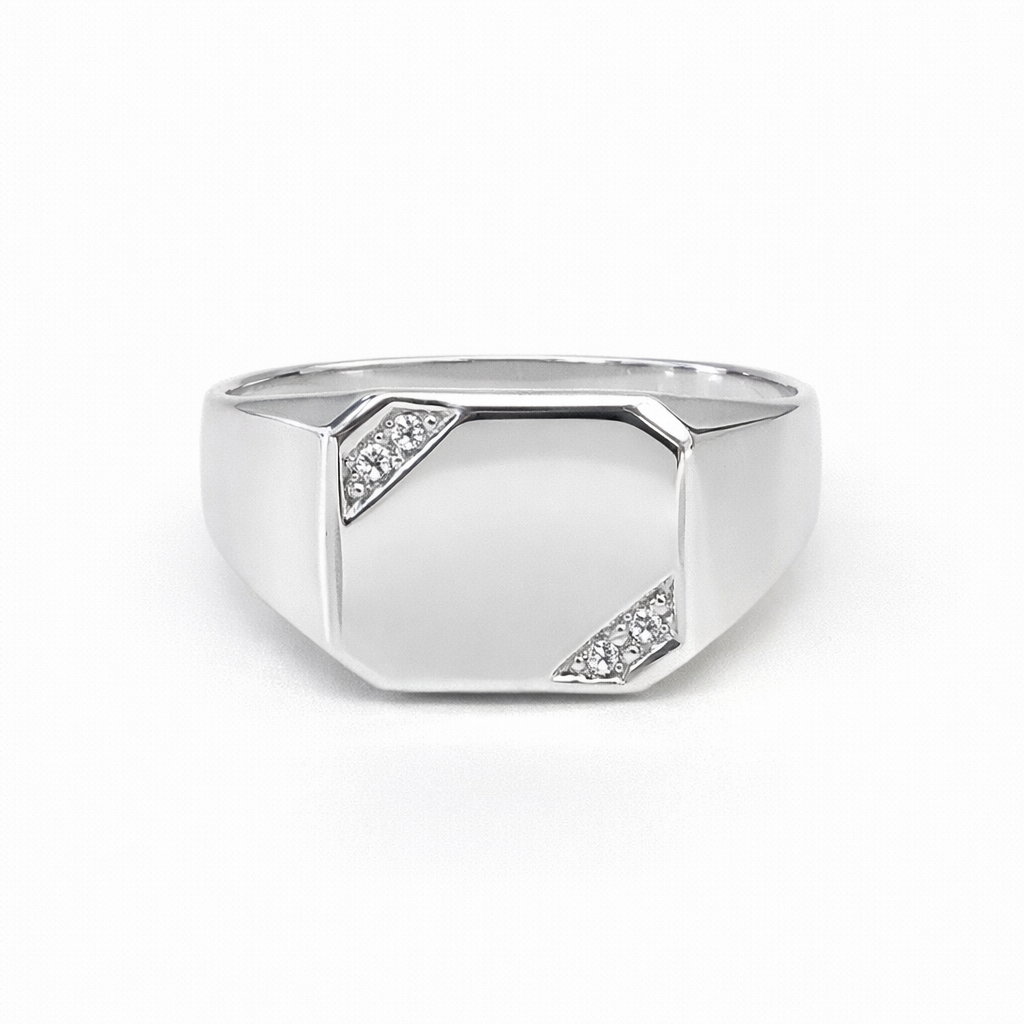 Make a confident statement with this classic gents signet-style ring, crafted in bright sterling silver and finished with a subtle touch of sparkle. Designed to suit both wedding wear and everyday dress styling, this ring delivers a clean, masculine profile with timeless appeal.