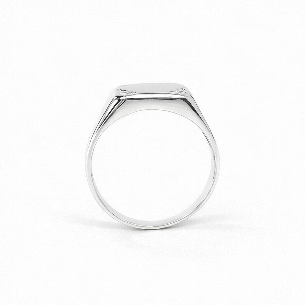 The ring features a bold, flat signet face measuring 10.90mm x 11.50mm, polished to a smooth mirror finish for a sharp, modern look. Accenting the design is a sparkling cubic zirconia (CZ), securely 4-claw set to add refined brilliance without overpowering the ring’s strong silhouette.