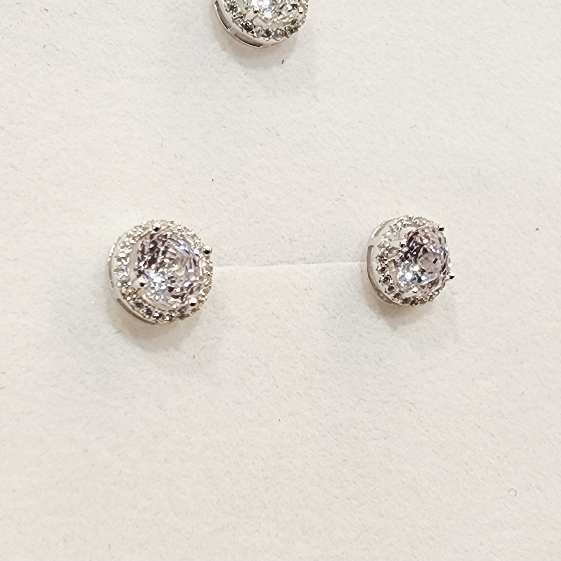 The matching stud earrings measure 8.50mm in diameter. Each earring features a dazzling round clear cubic zirconia centre stone, framed by a halo of sparkling clear CZ accents, perfectly mirroring the pendant’s design. Their secure stud backs ensure comfortable, all-day wear.